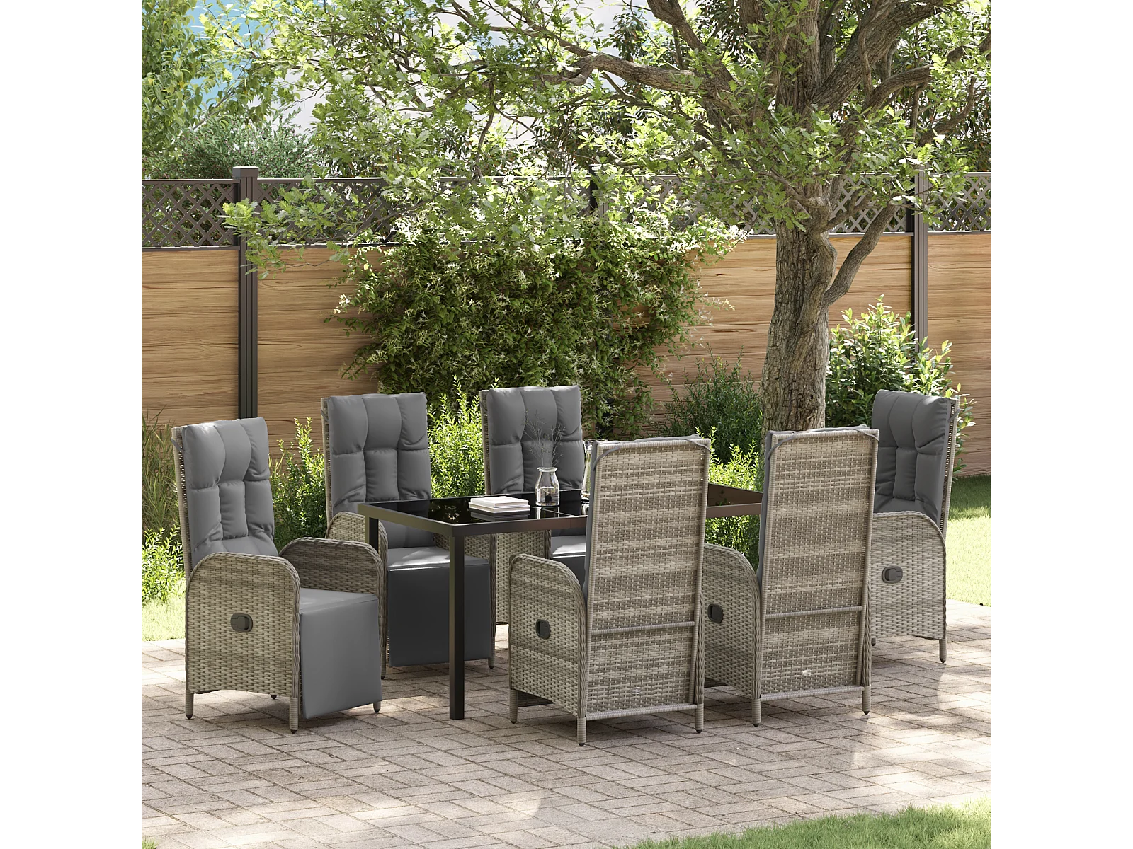 Set de 7 pièces de salle à manger de jardin en poly rotin gris