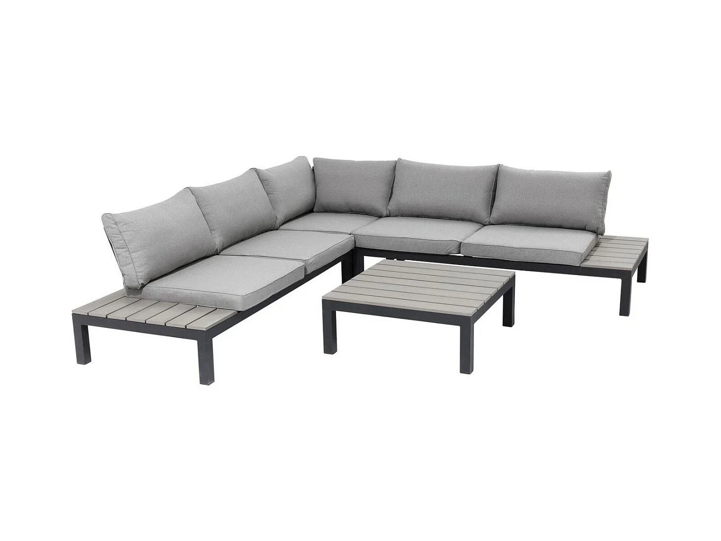 Canapé de jardin avec table et coussins en forme de L gris