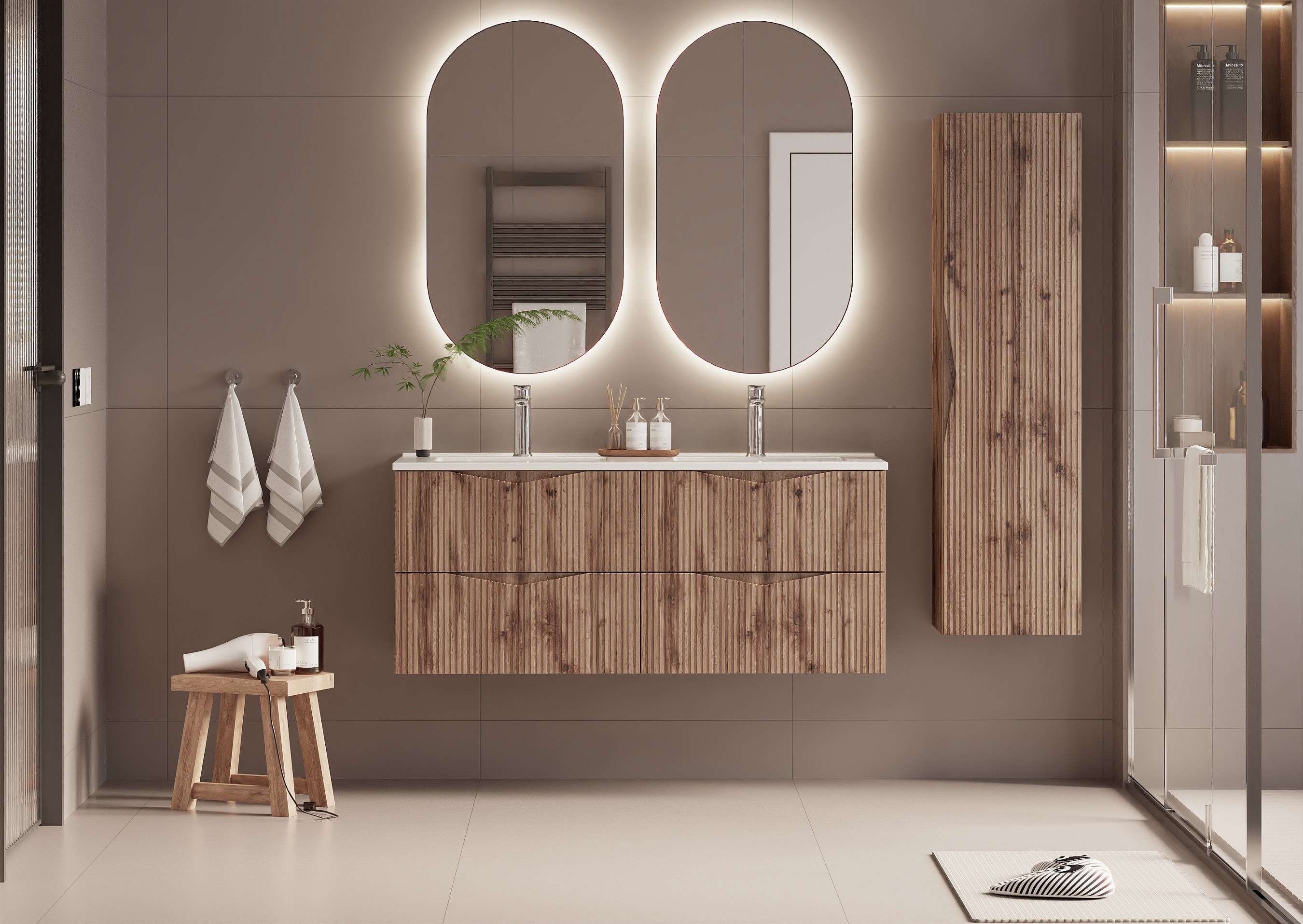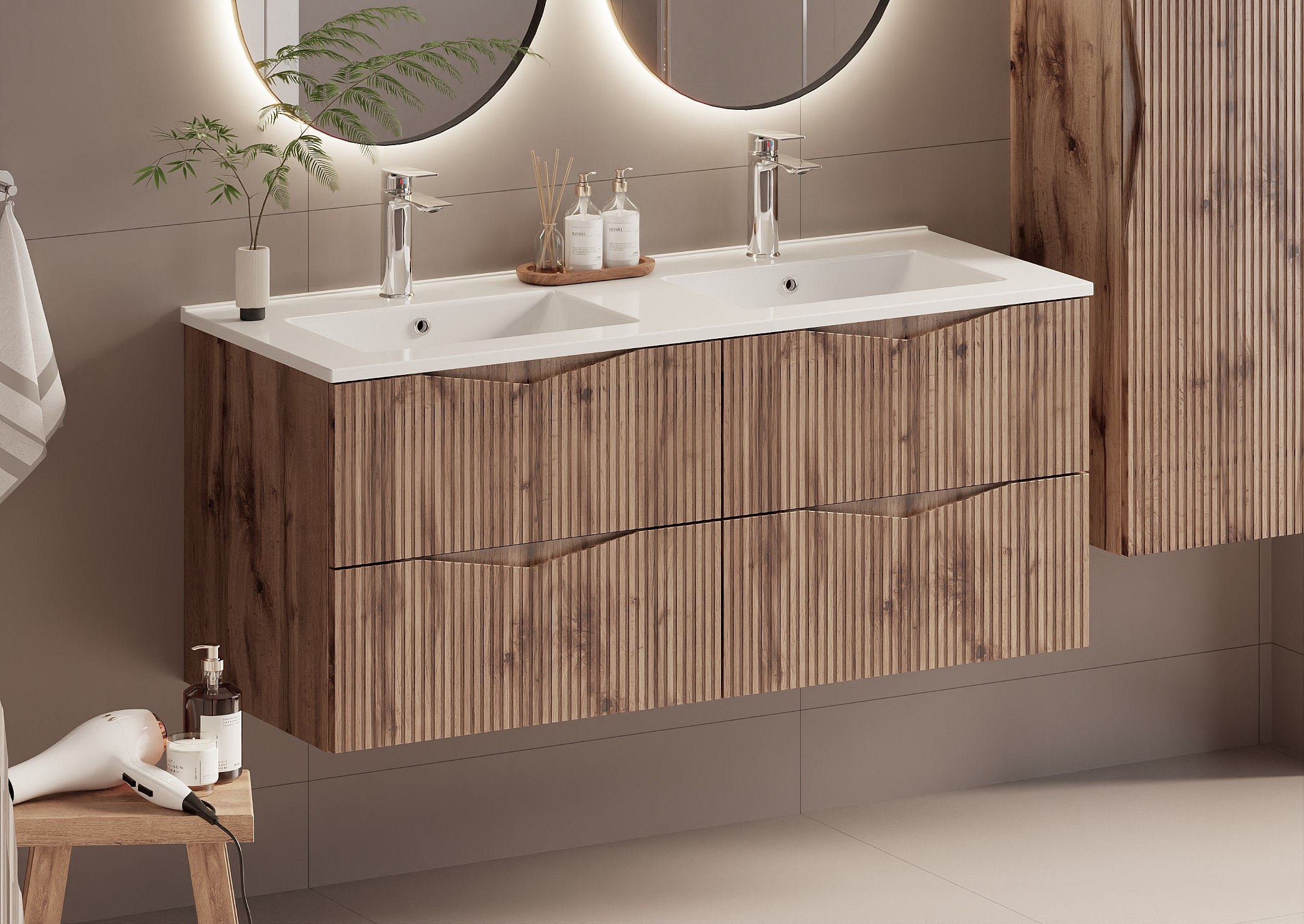 Ensemble meuble double vasque encastrée 120cm et colonne Tao Cachemire