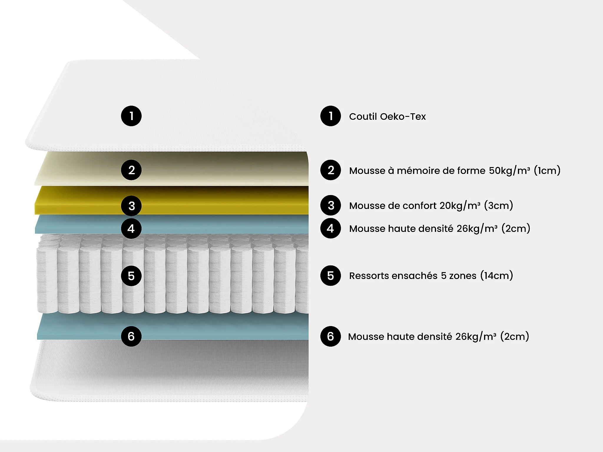 Ensemble 140 x 190 cm sommier déco en kit + matelas ressorts ensachés 5 zones accueil mémoire de forme ép.23cm - BABYLONE de YSMÉE