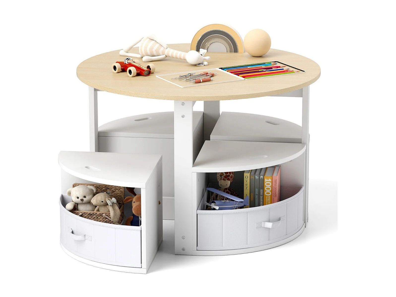 Ensemble Table et Chaises pour Enfants Table Gigogne Ronde avec 4 Tabourets 4 Tiroirs en Tissu Naturel et Blanc
