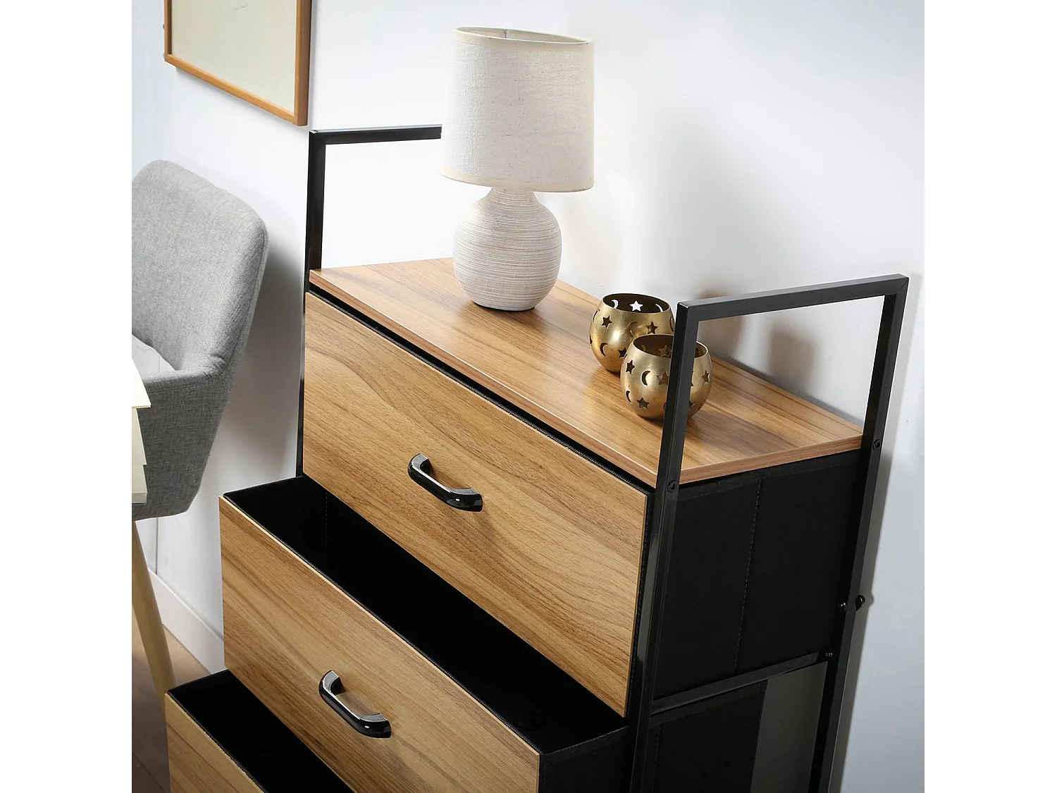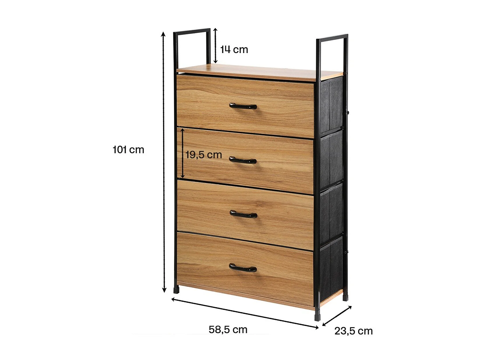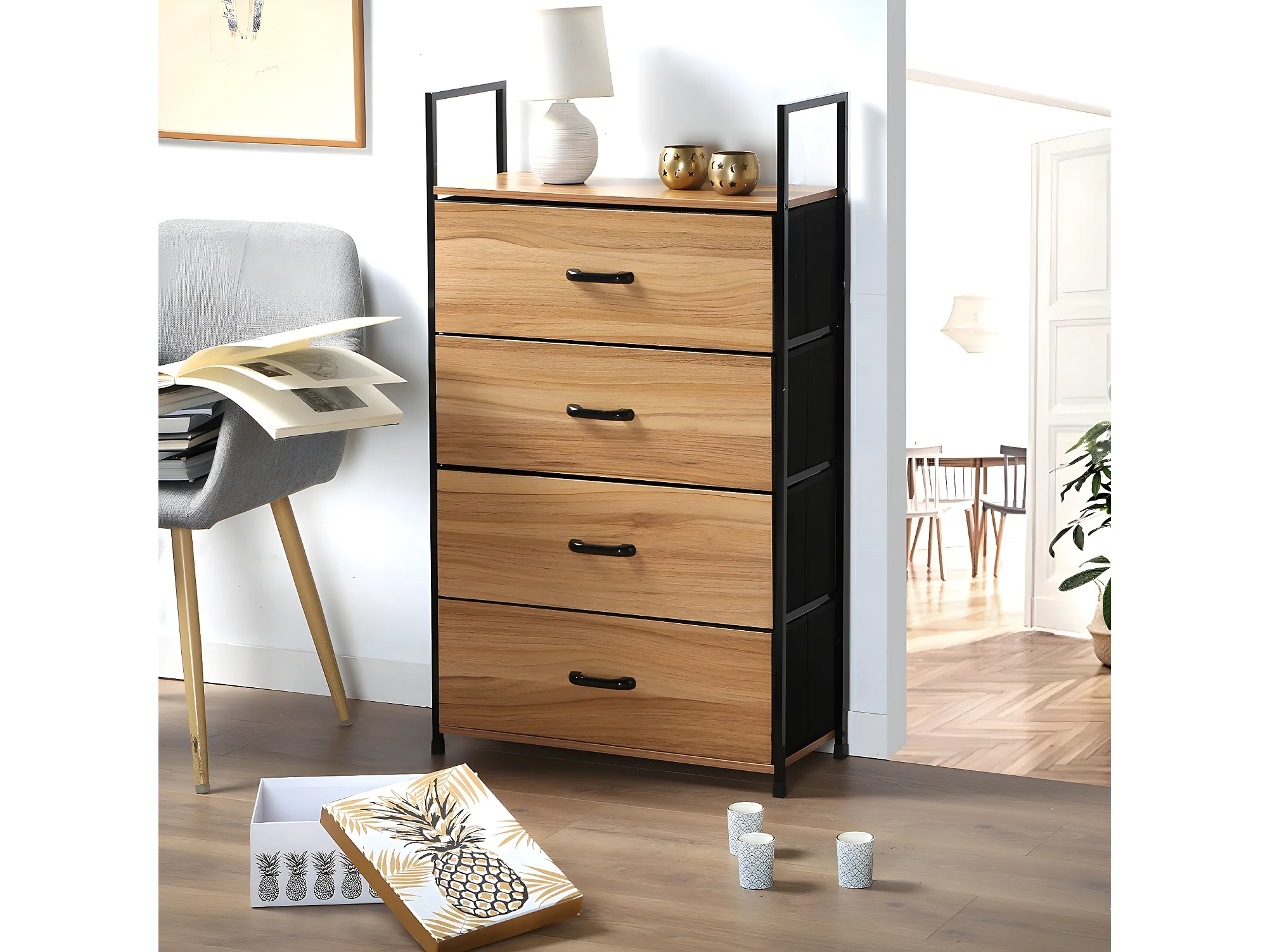 Chiffonnier 4 tiroirs façade décor bois - L60 cm