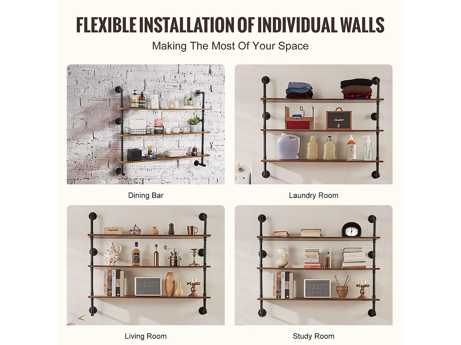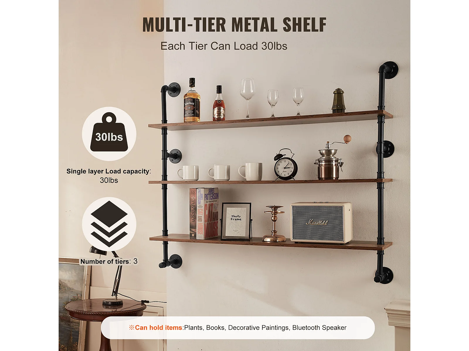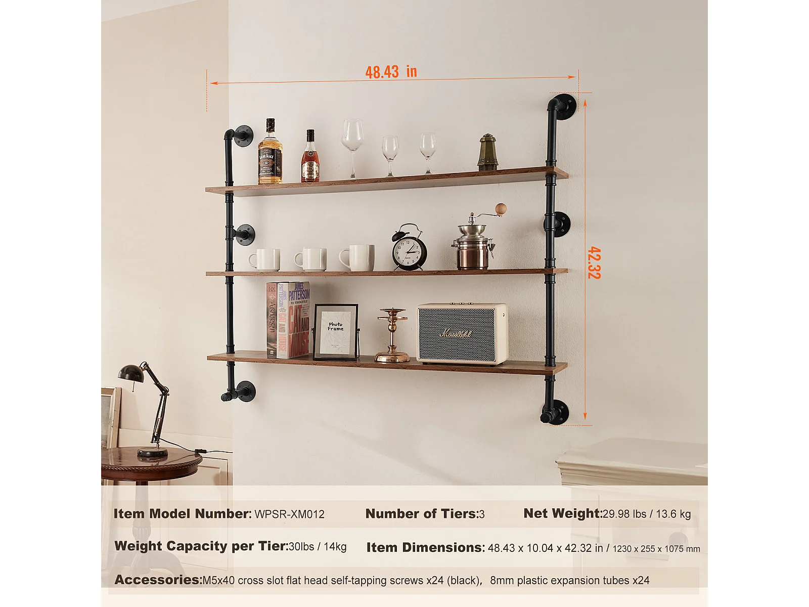 Étagère Mural, Étagère Industrielle à 3 Niveaux, 122 x 25 CM, Montage Mural pour Cuisine, Chambre à Coucher