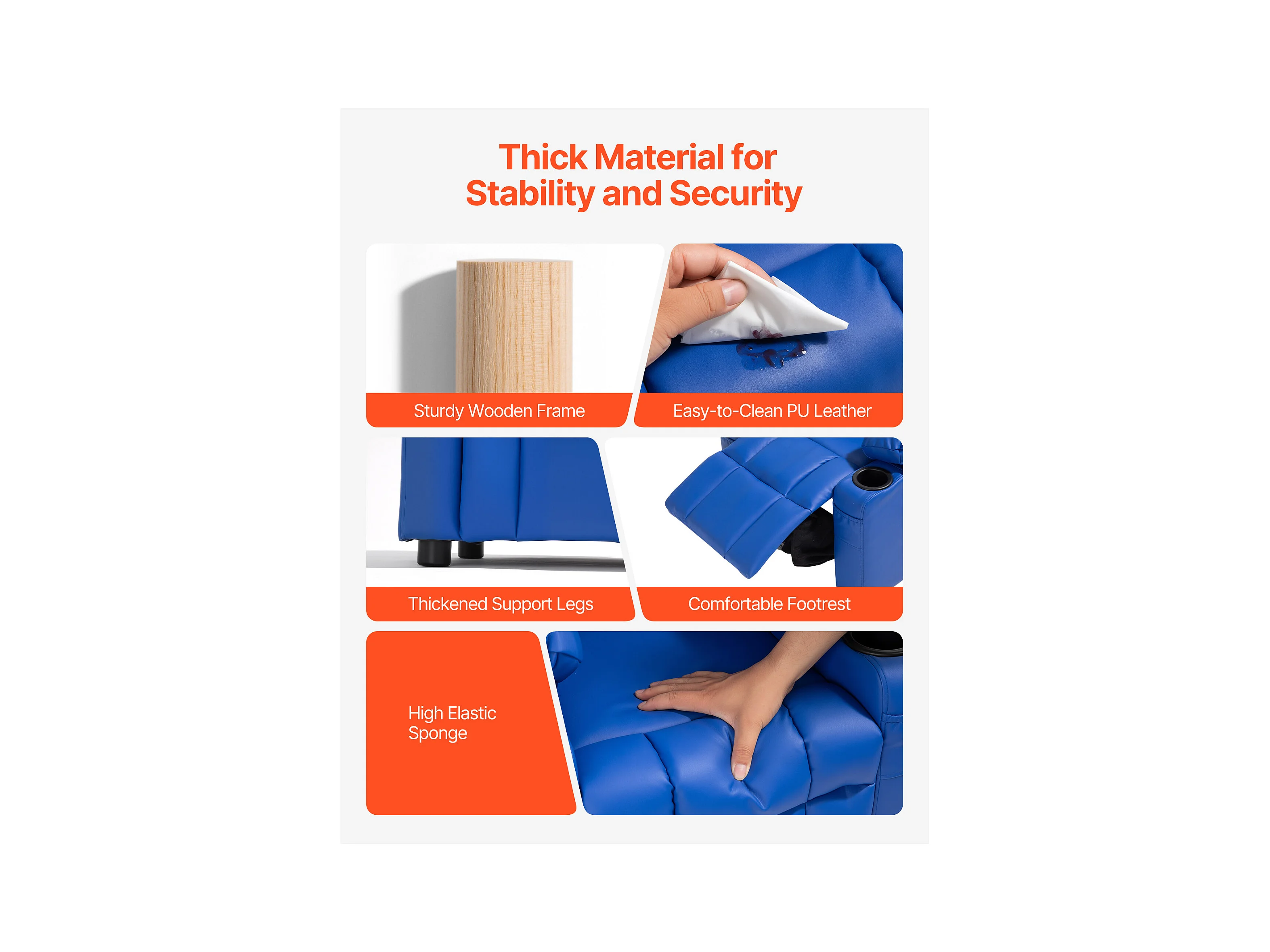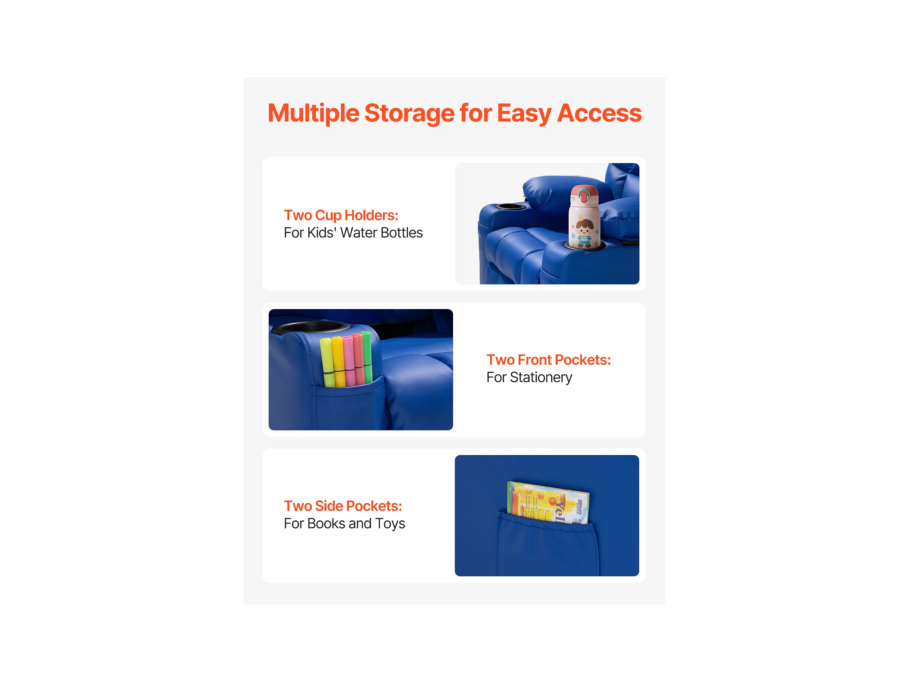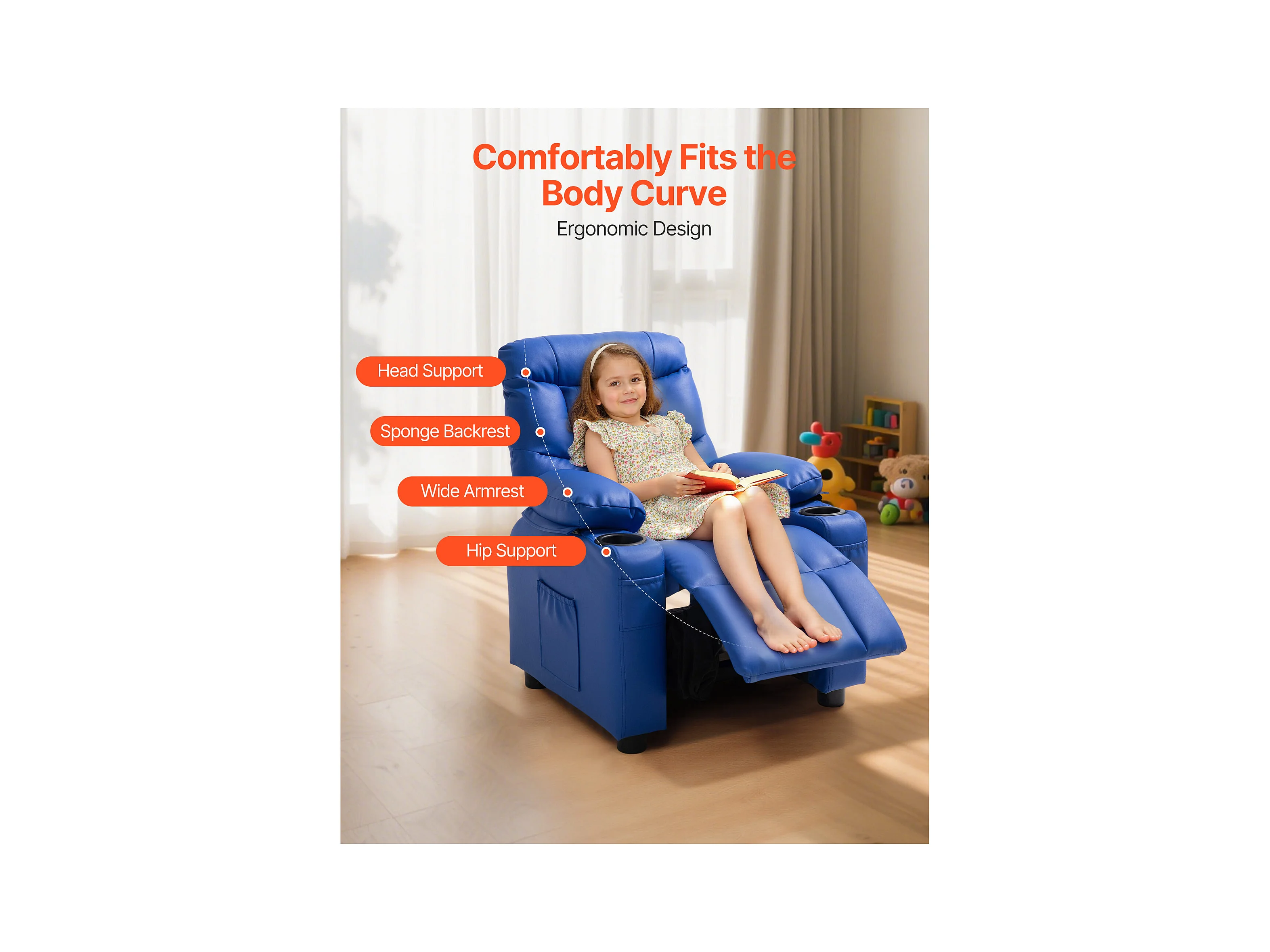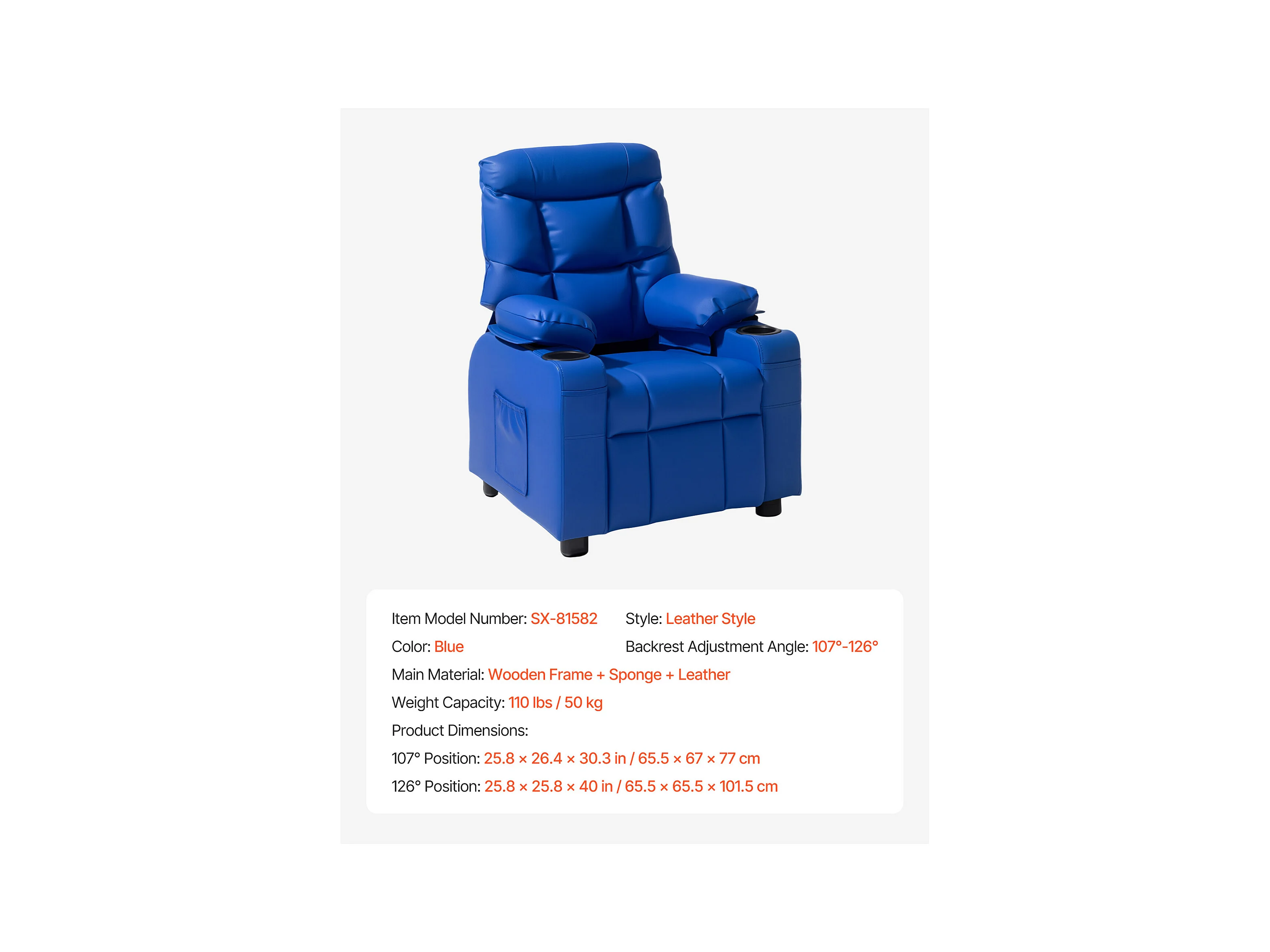 Fauteuil Inclinable SucceBuy pour Enfants, Chaise Relax Ergonomique, avec Porte-Gobelets et Poches, Dossier Réglable 107° à 126°, pour Chambre d’Enfants, Bleu