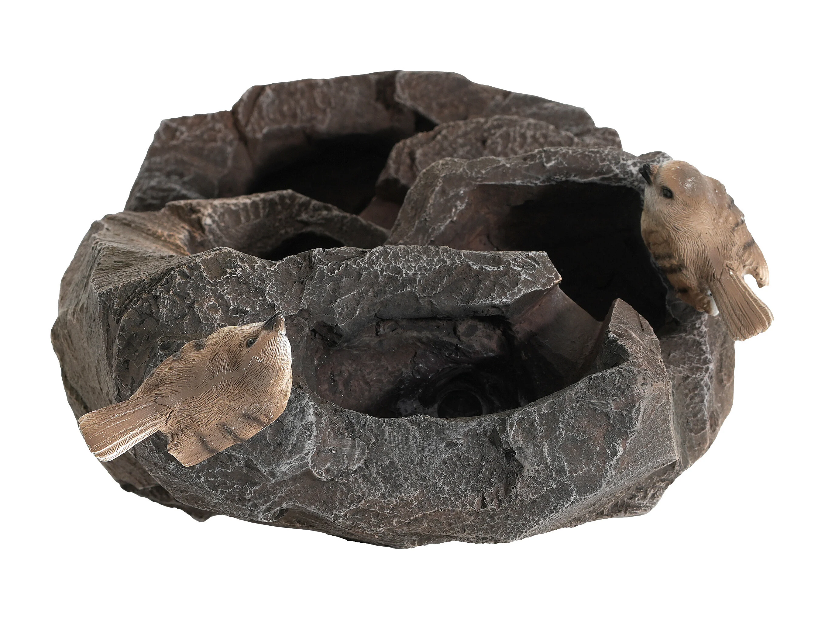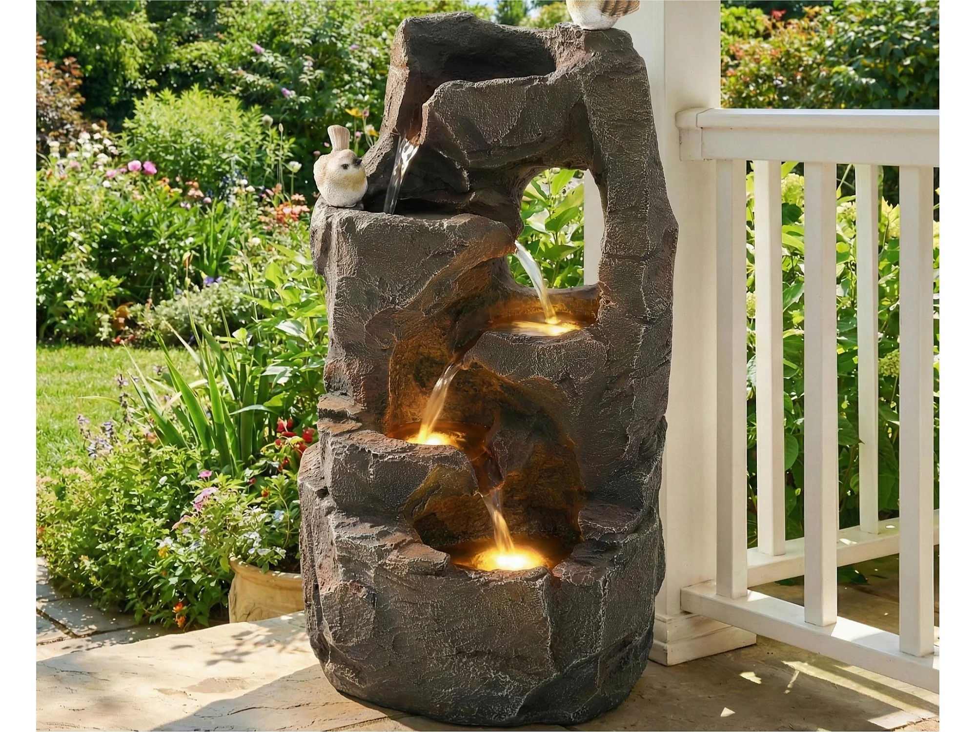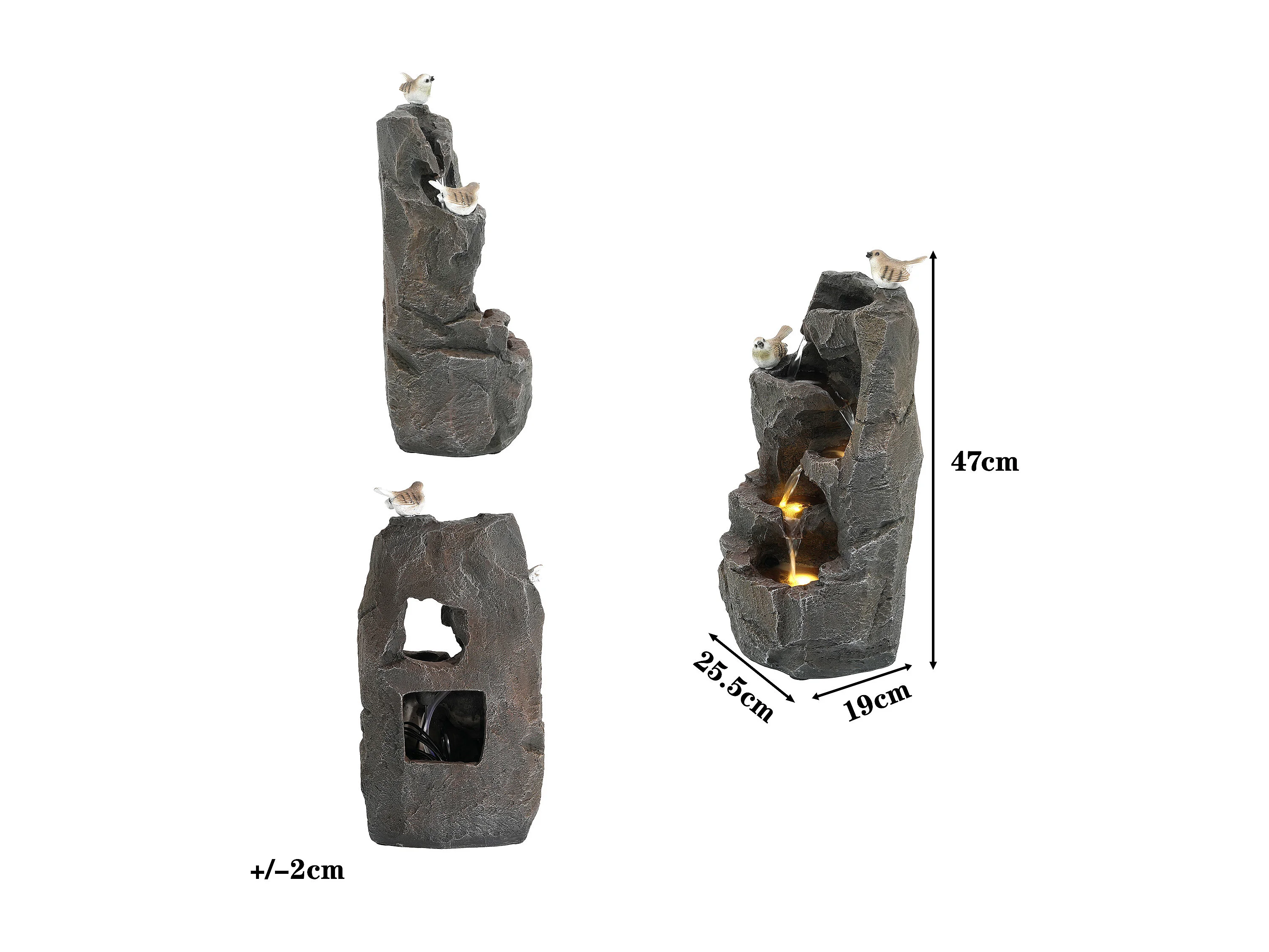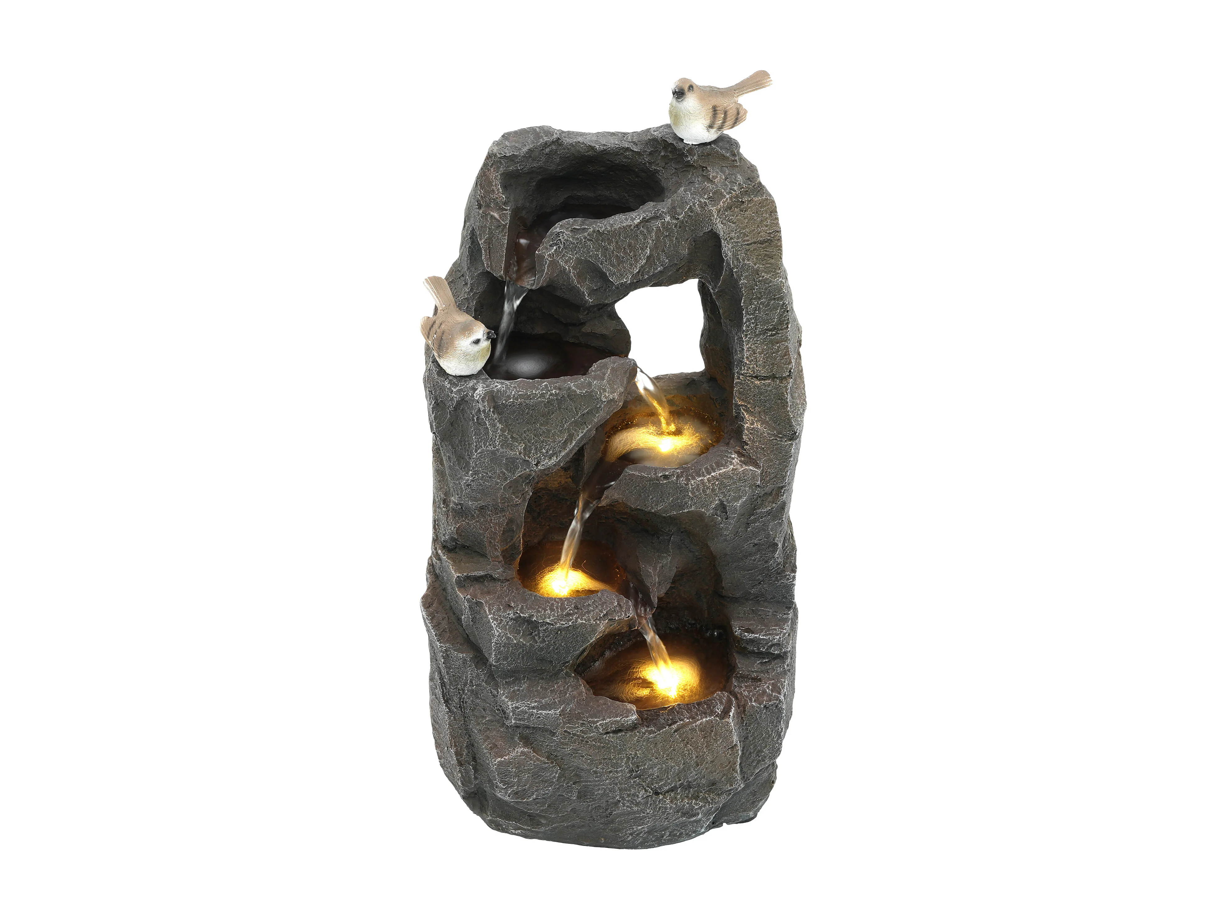 Fontaine de Jardin Zen avec LED et Figurines Oiseaux - Cascade d'Extérieur Design Rocher Naturel en Résine - 25,5x19x47cm - Décoration Balcon - Gris