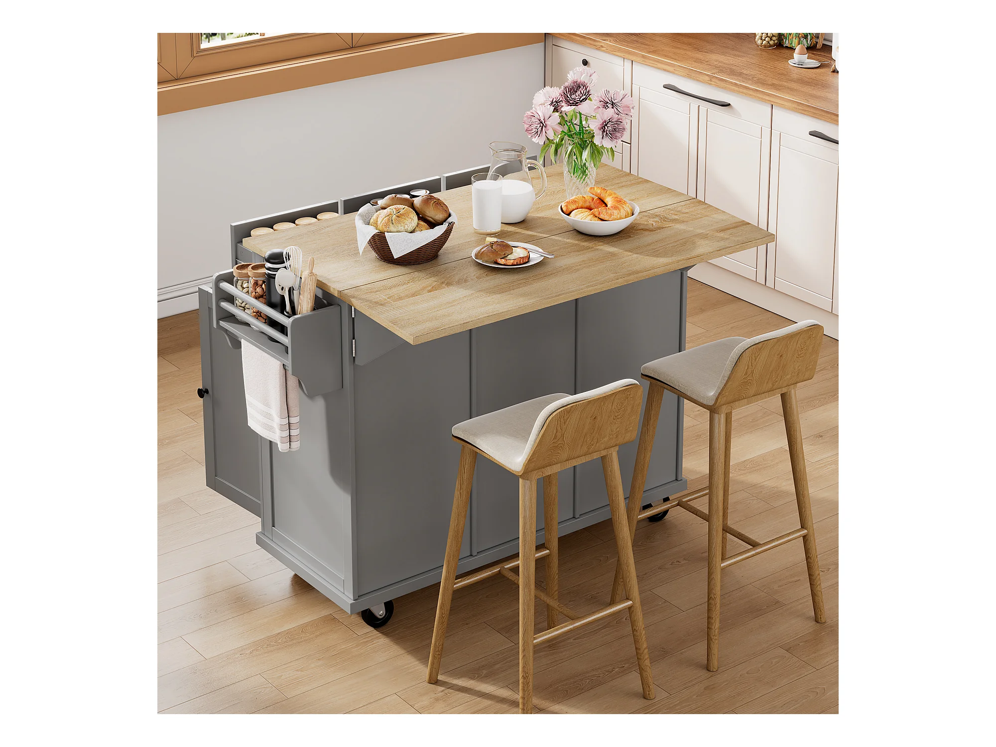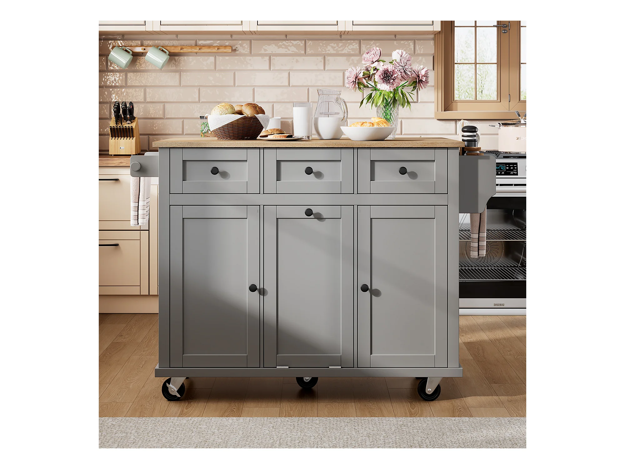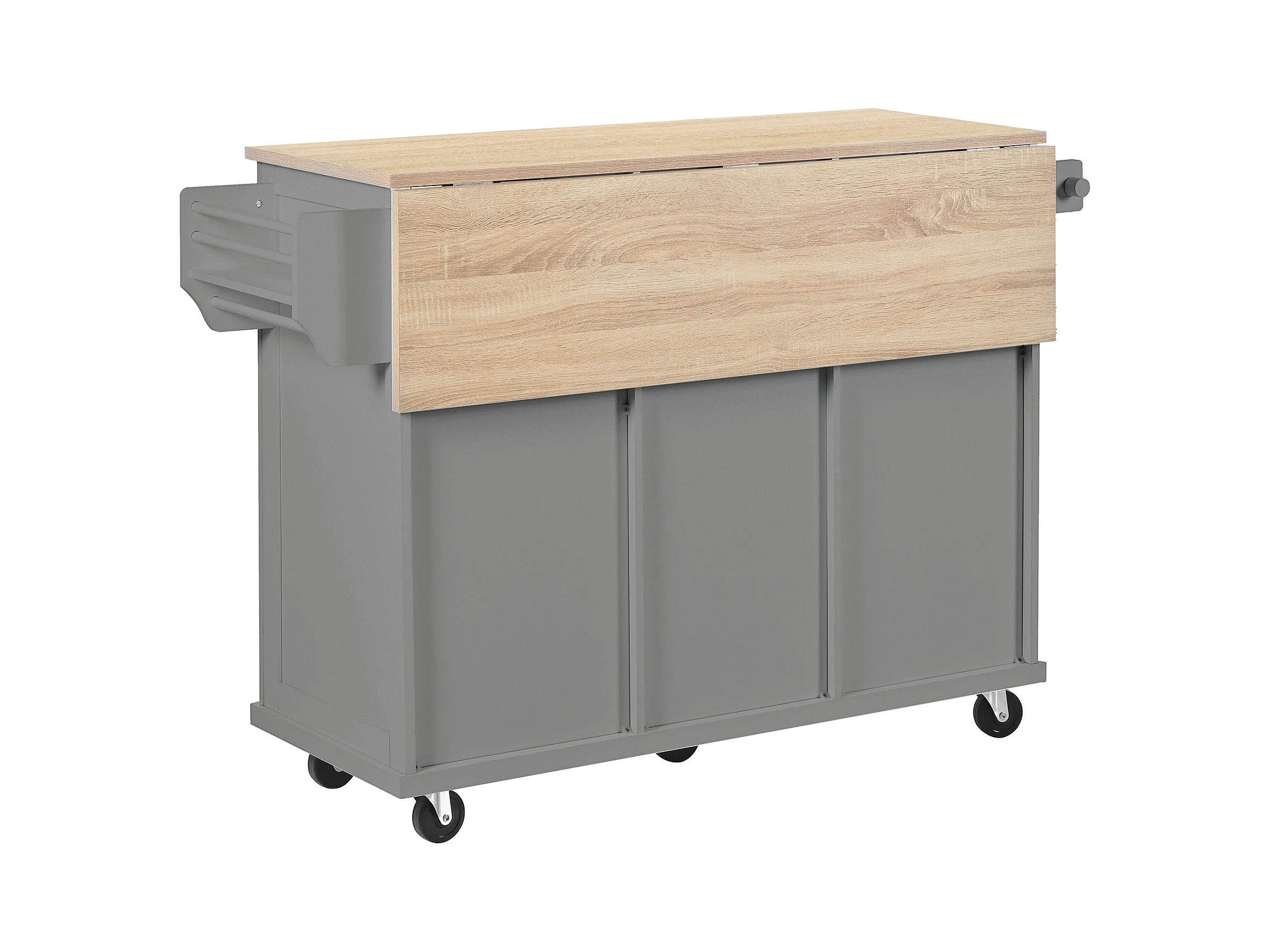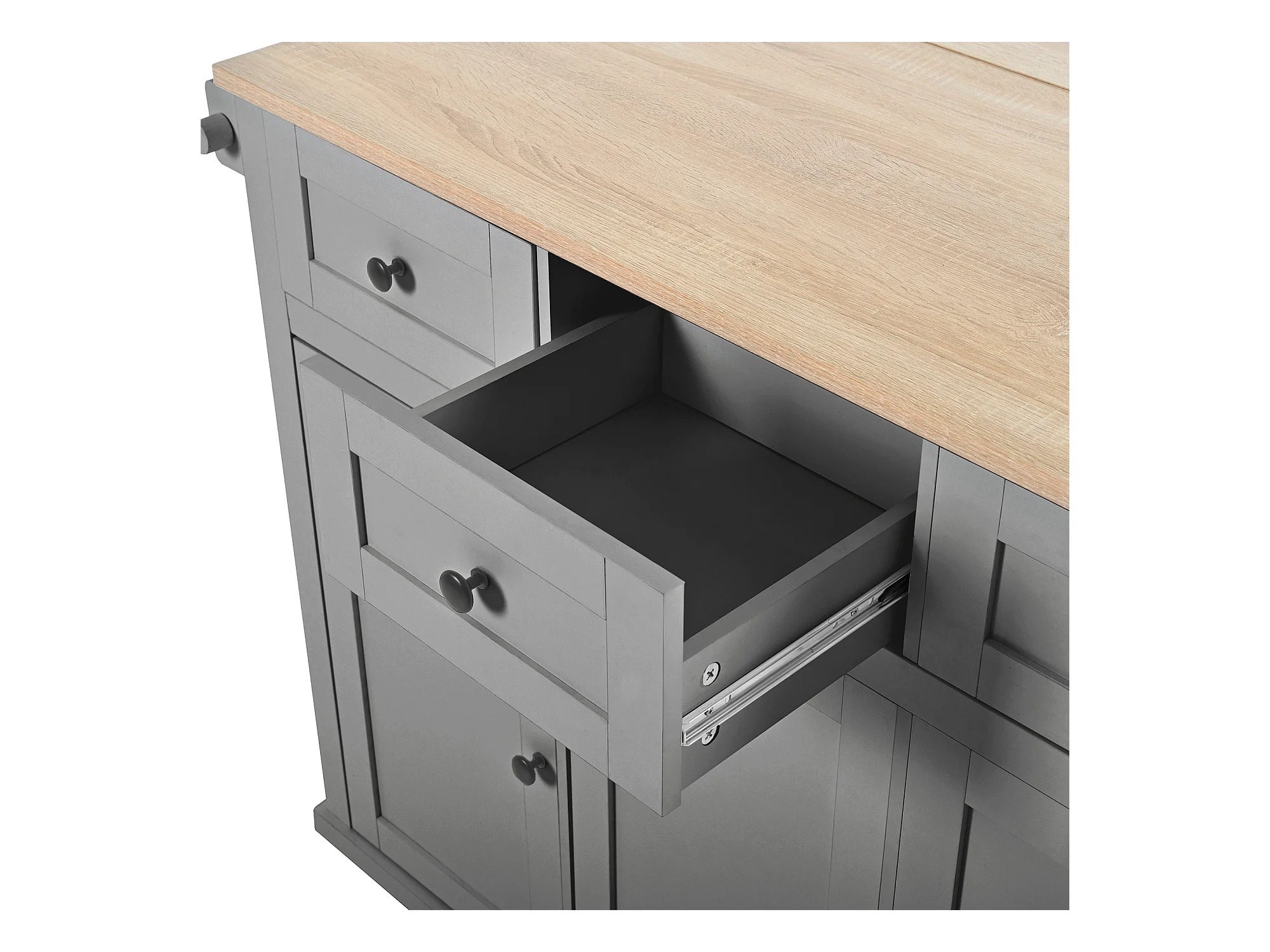 Ilot central de cuisine mobile 126x46.8x94.2cm - avec roulettes - 3 tiroirs et 3 portes - plateau extensible - avec porte-serviettes - gris