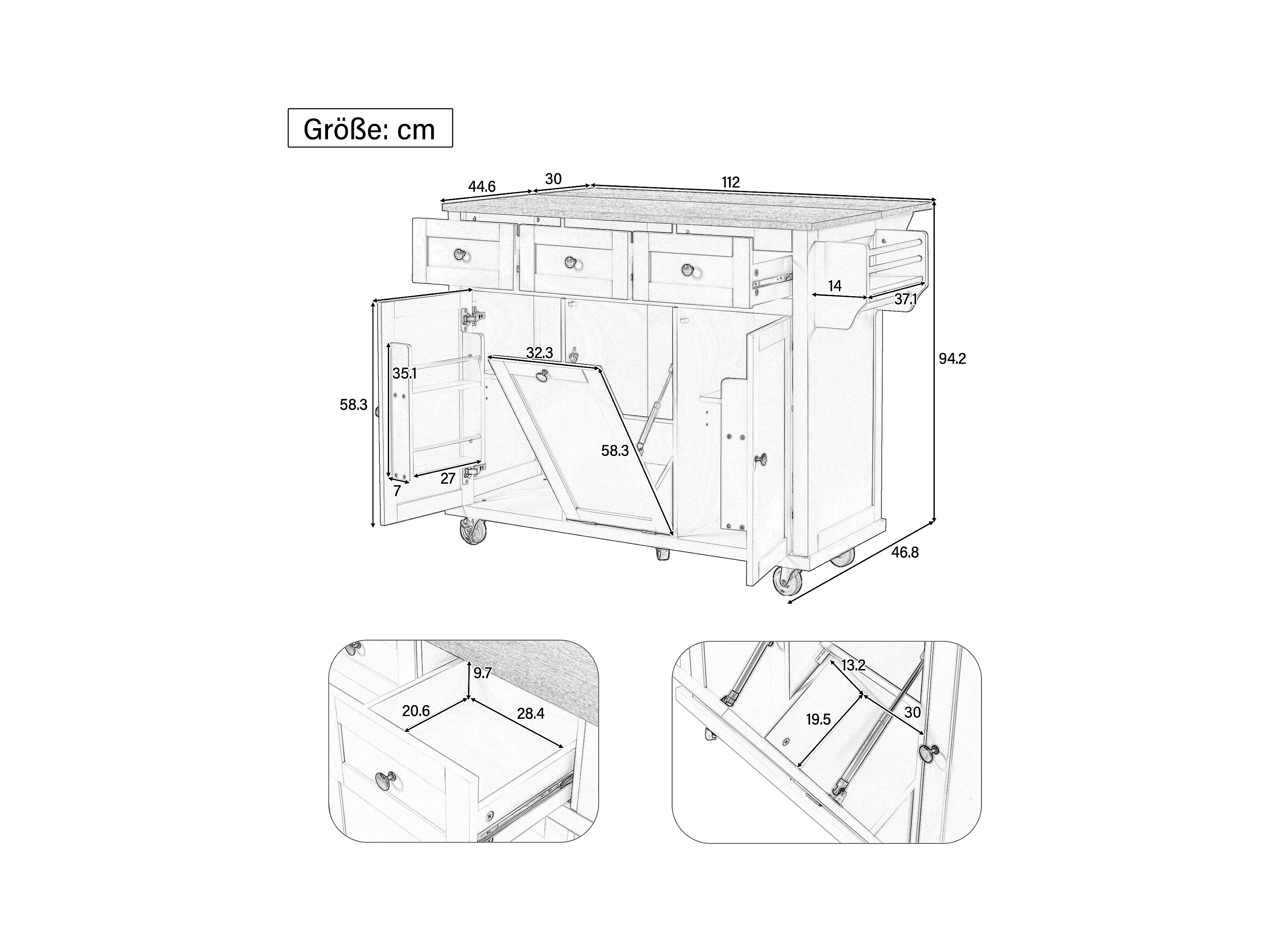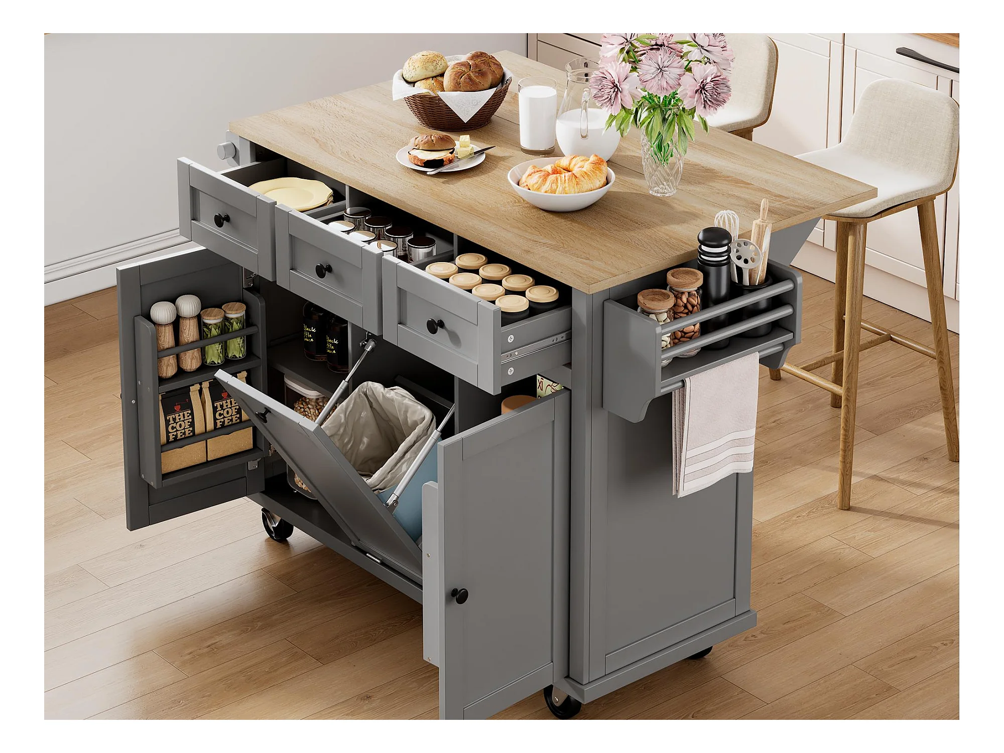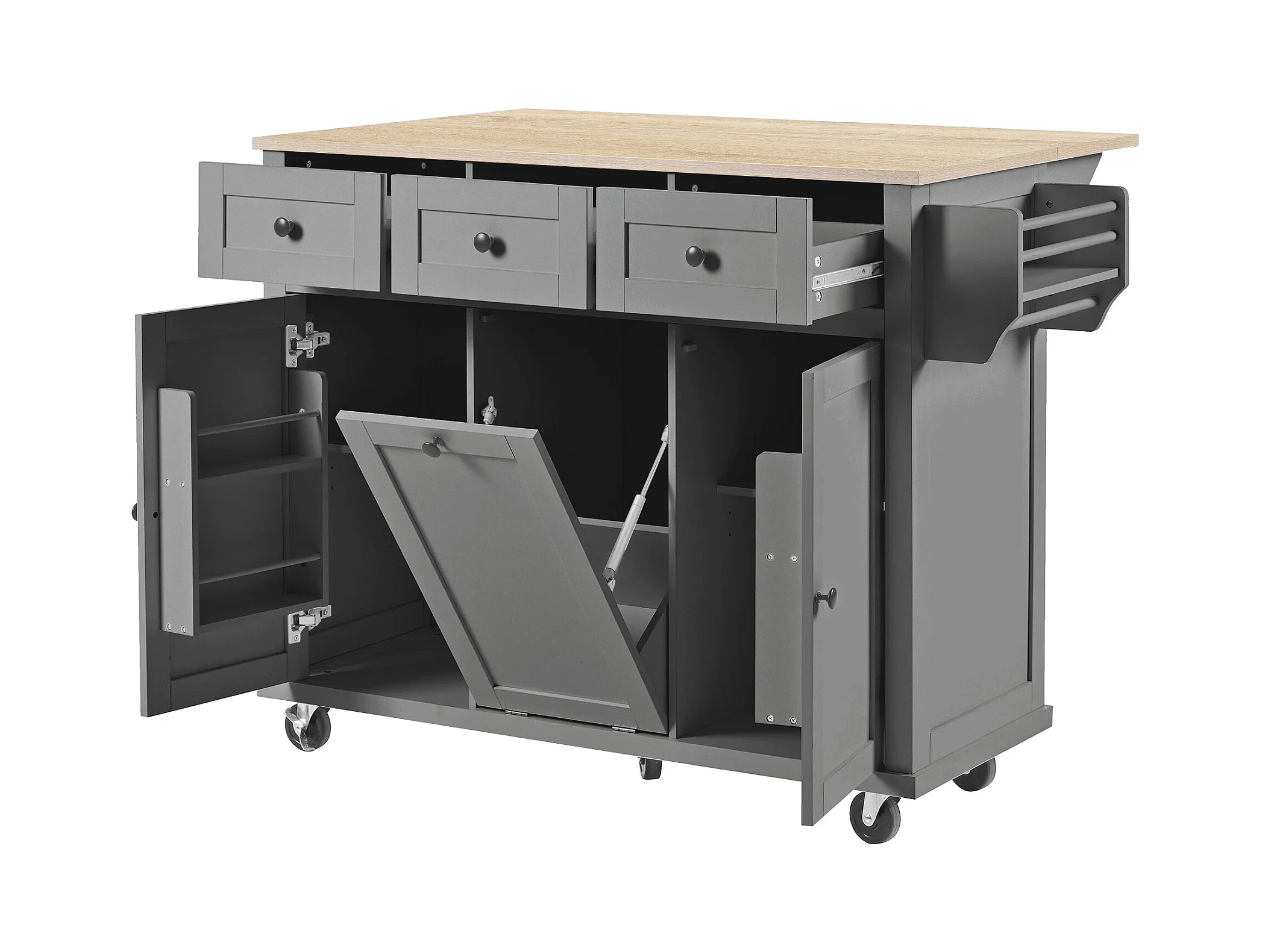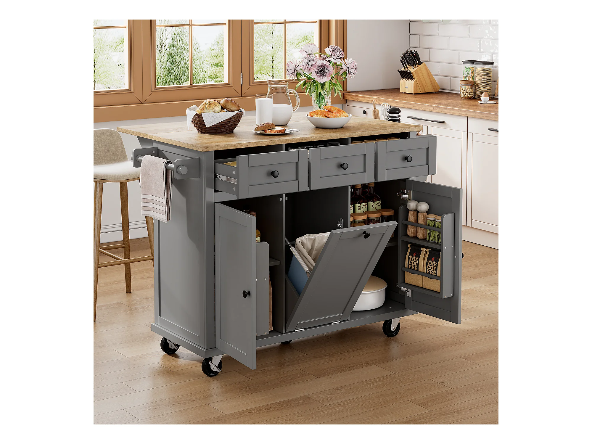 Ilot central de cuisine mobile 126x46.8x94.2cm - avec roulettes - 3 tiroirs et 3 portes - plateau extensible - avec porte-serviettes - gris