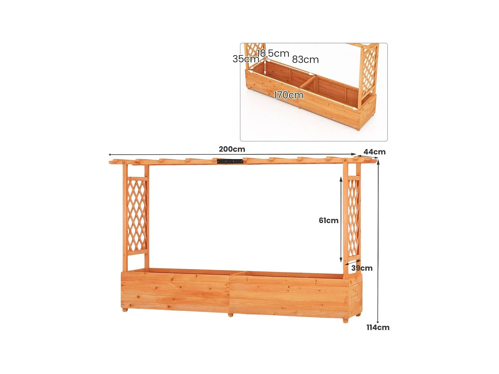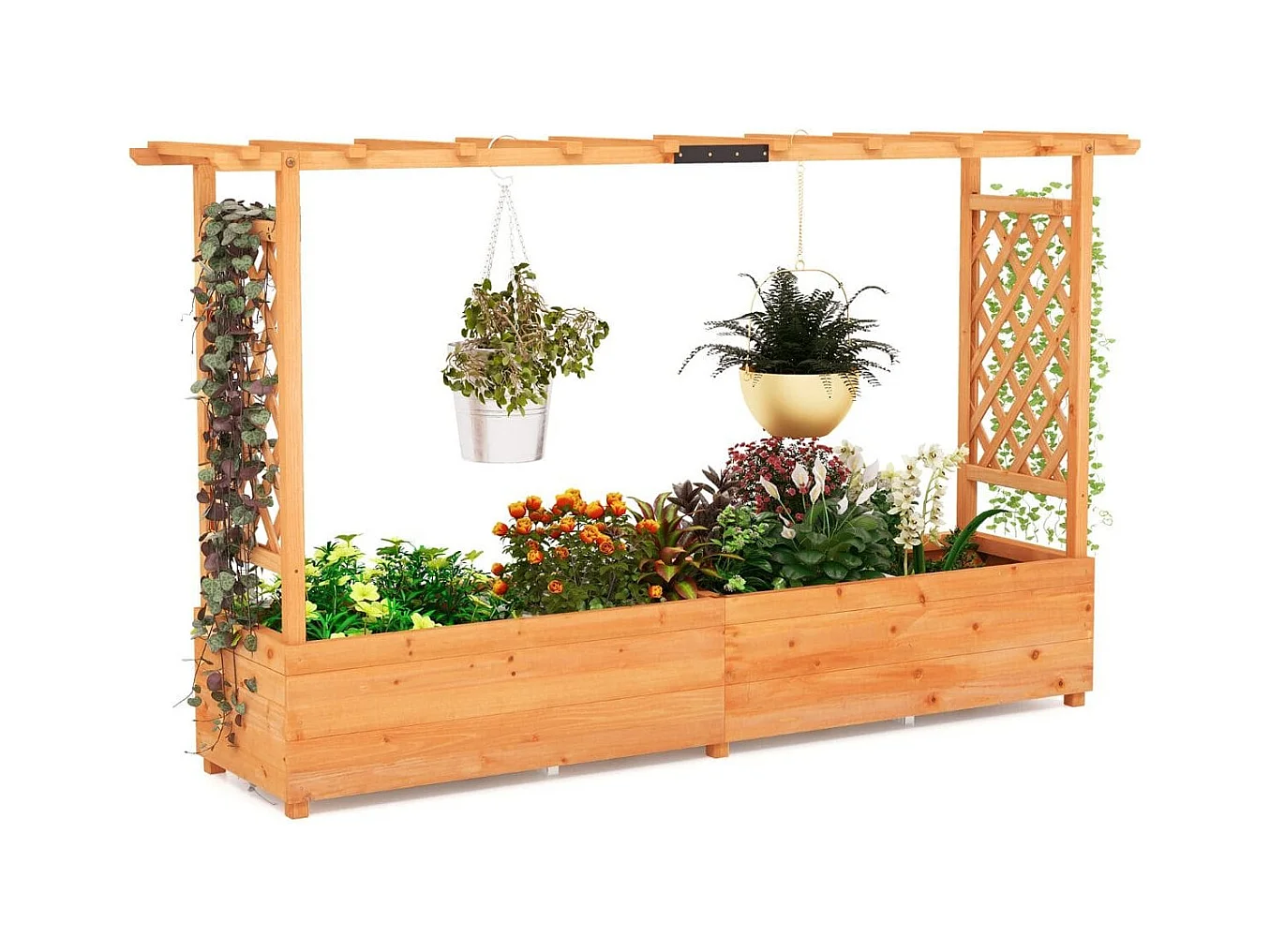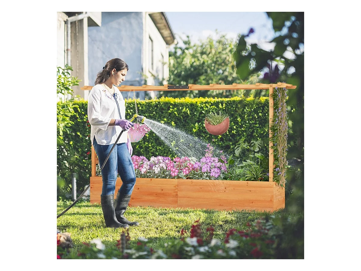 Jardinière avec 2 Treillis Latéraux Toit Suspendu en Bois de Sapin avec Trou de Drainage Lit de Jardin Surélevé 200,5x113,5x44cm Orange