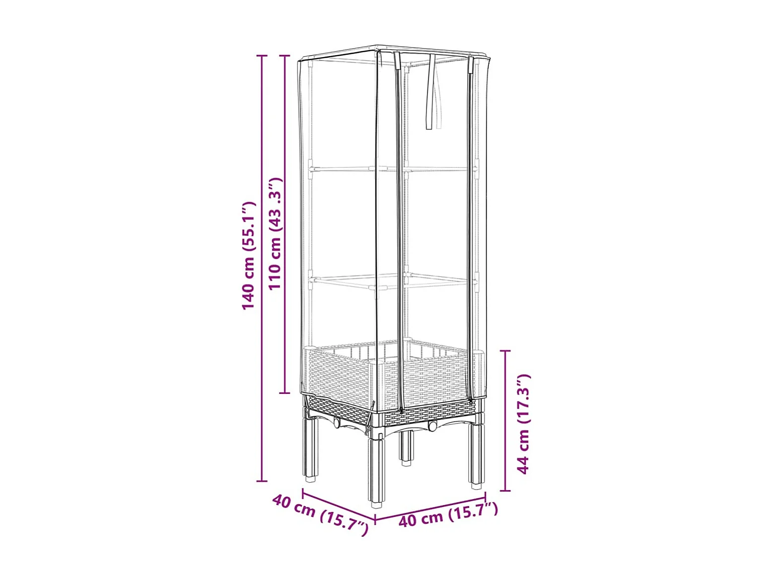 Jardinière surélevée avec housse aspect rotin 40x40x140 cm