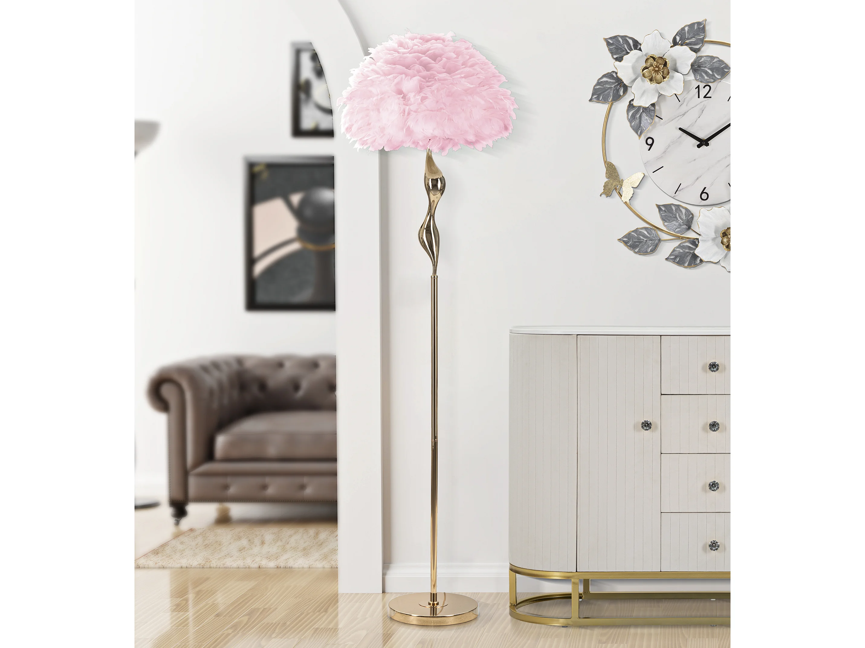 Lampadaire Imitation Plume "Slim" 165cm Or & Rose