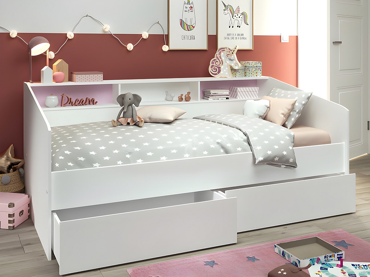Lit avec tiroirs et étagères PAULETTE - 90 x 200 cm - blanc