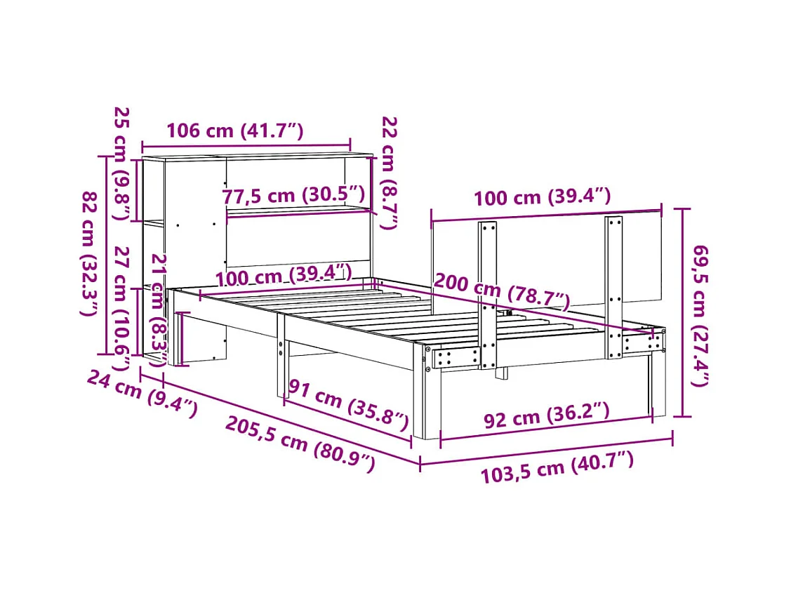 Lit bibliothèque sans matelas blanc 100x200 cm bois pin massif