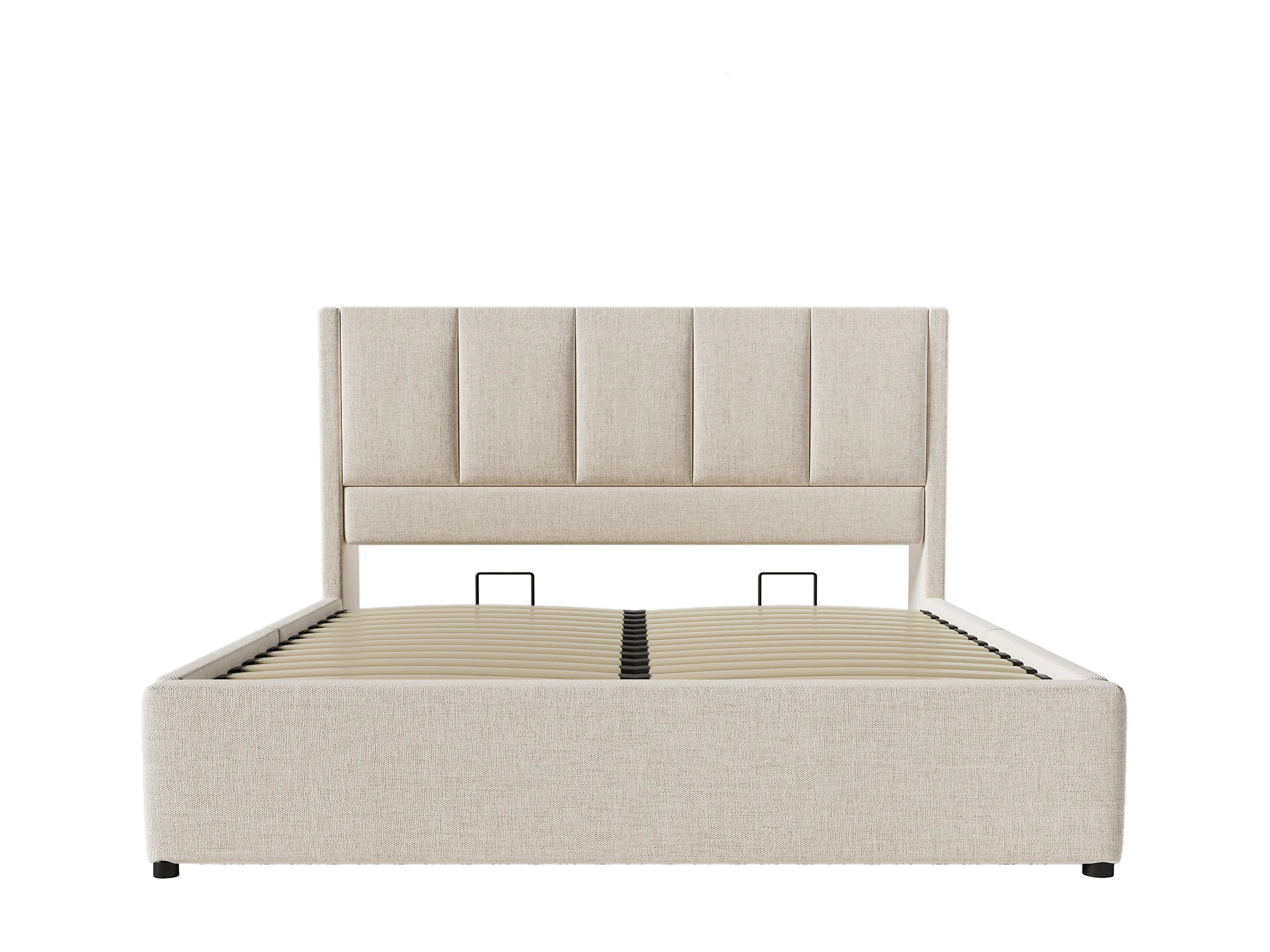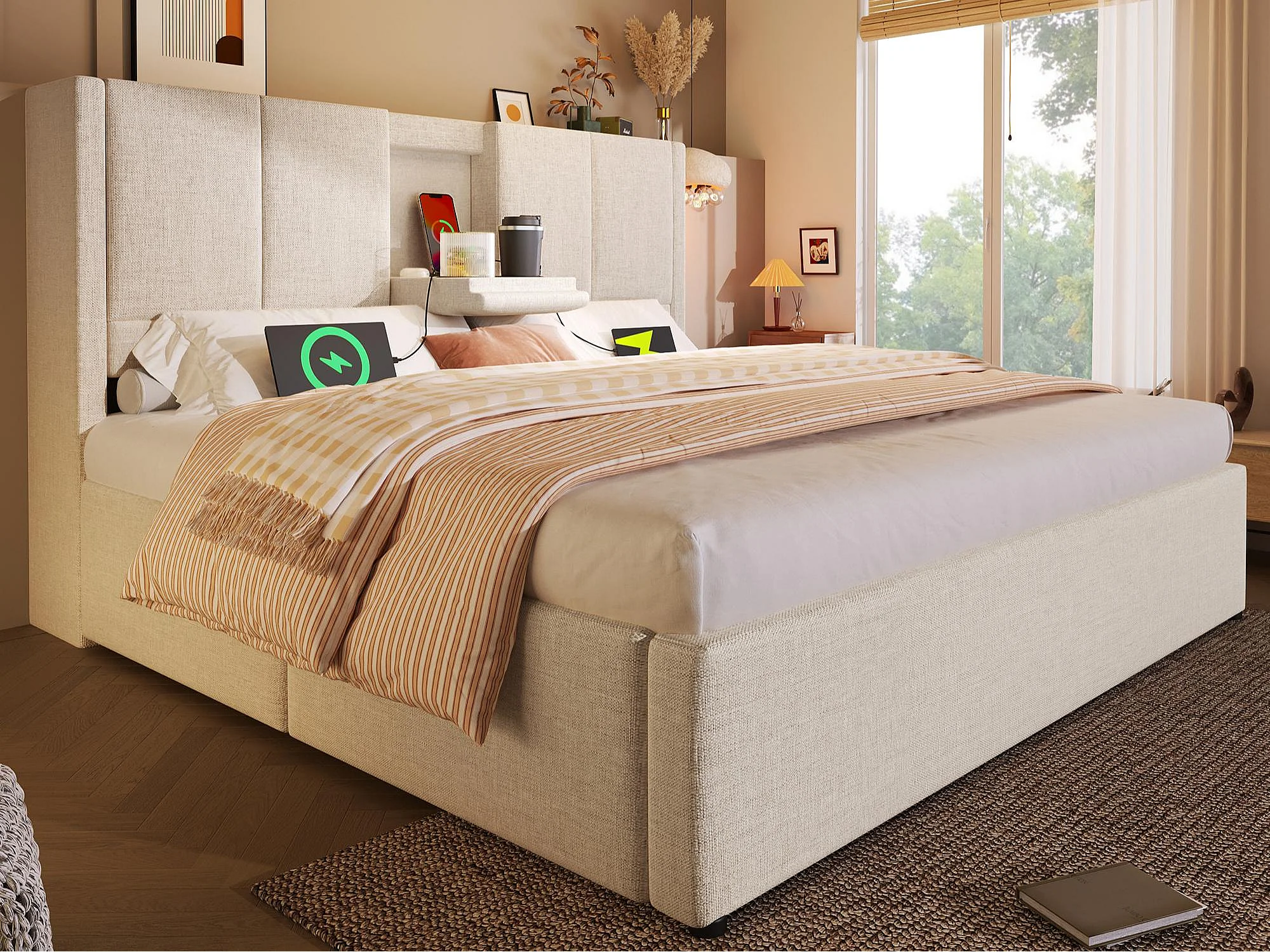 Lit coffre rembourré 140x190cm - avec porte-gobelet caché - avec ports USB et Type-C - avec sommier à lattes - Lin - Beige (sans matelas)