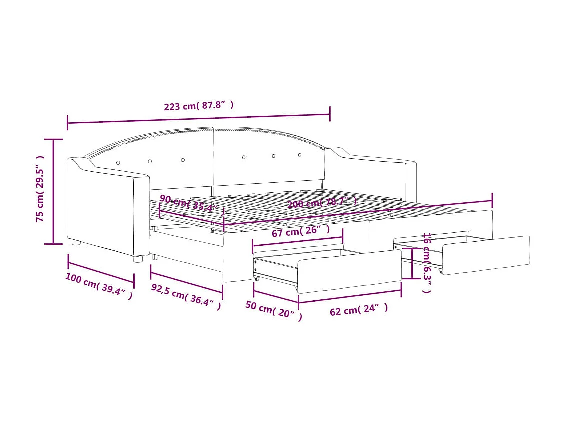 Lit de jour avec gigogne et tiroirs taupe 90x200 cm tissu