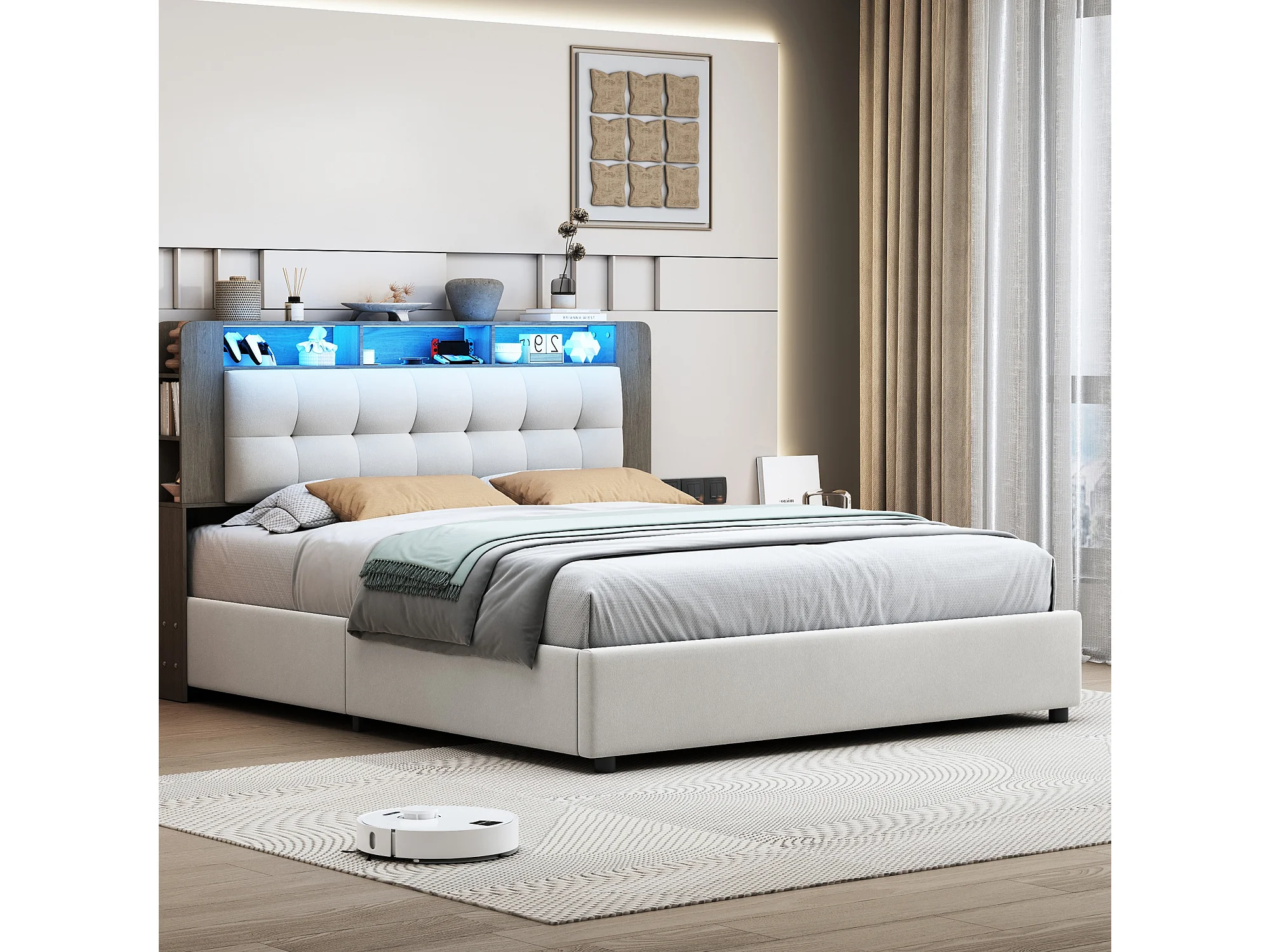 Lit double 140*200cm, dossier+rangement+chargeur sans fil+bande lumineuse LED, blanc,velours