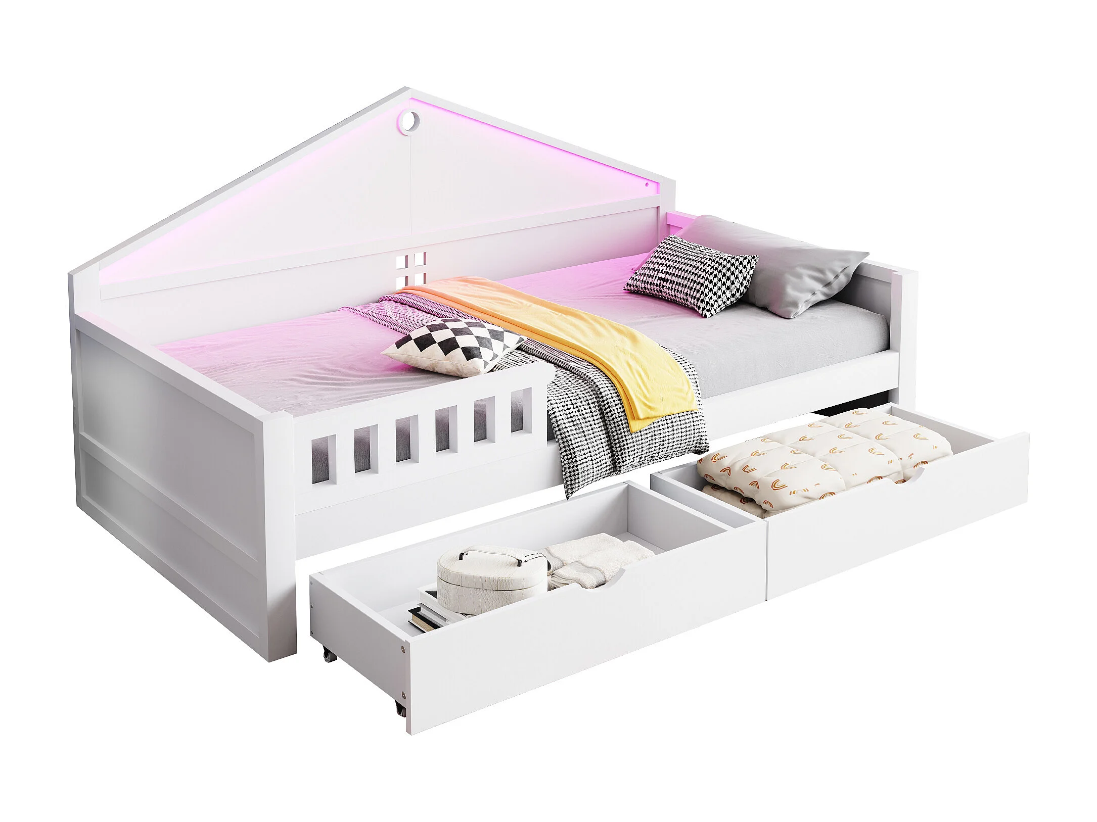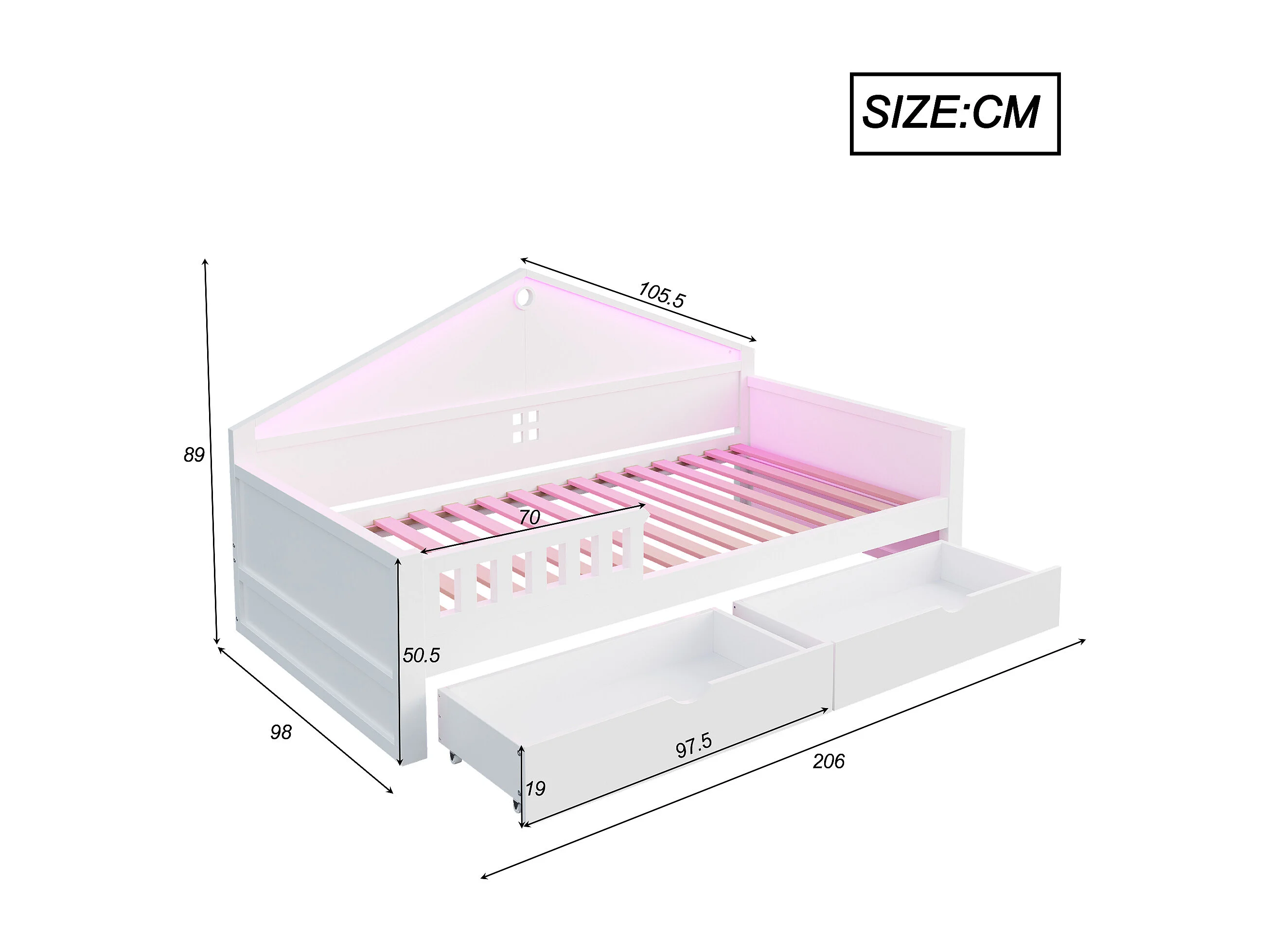 Lit enfant 90x200 cm - avec lumière LED - avec 2 tiroirs - sommier à lattes - blanc (matelas non inclus)