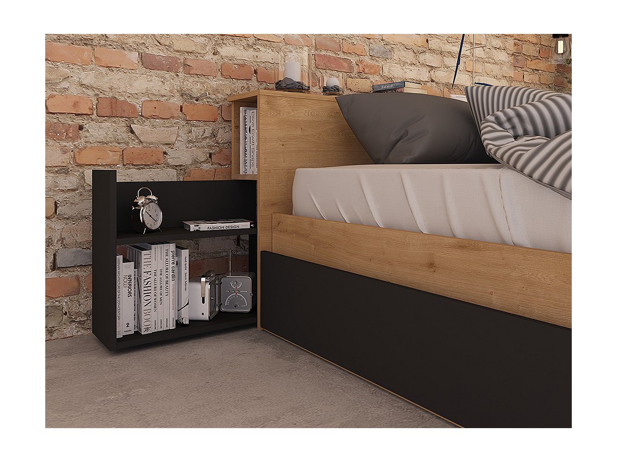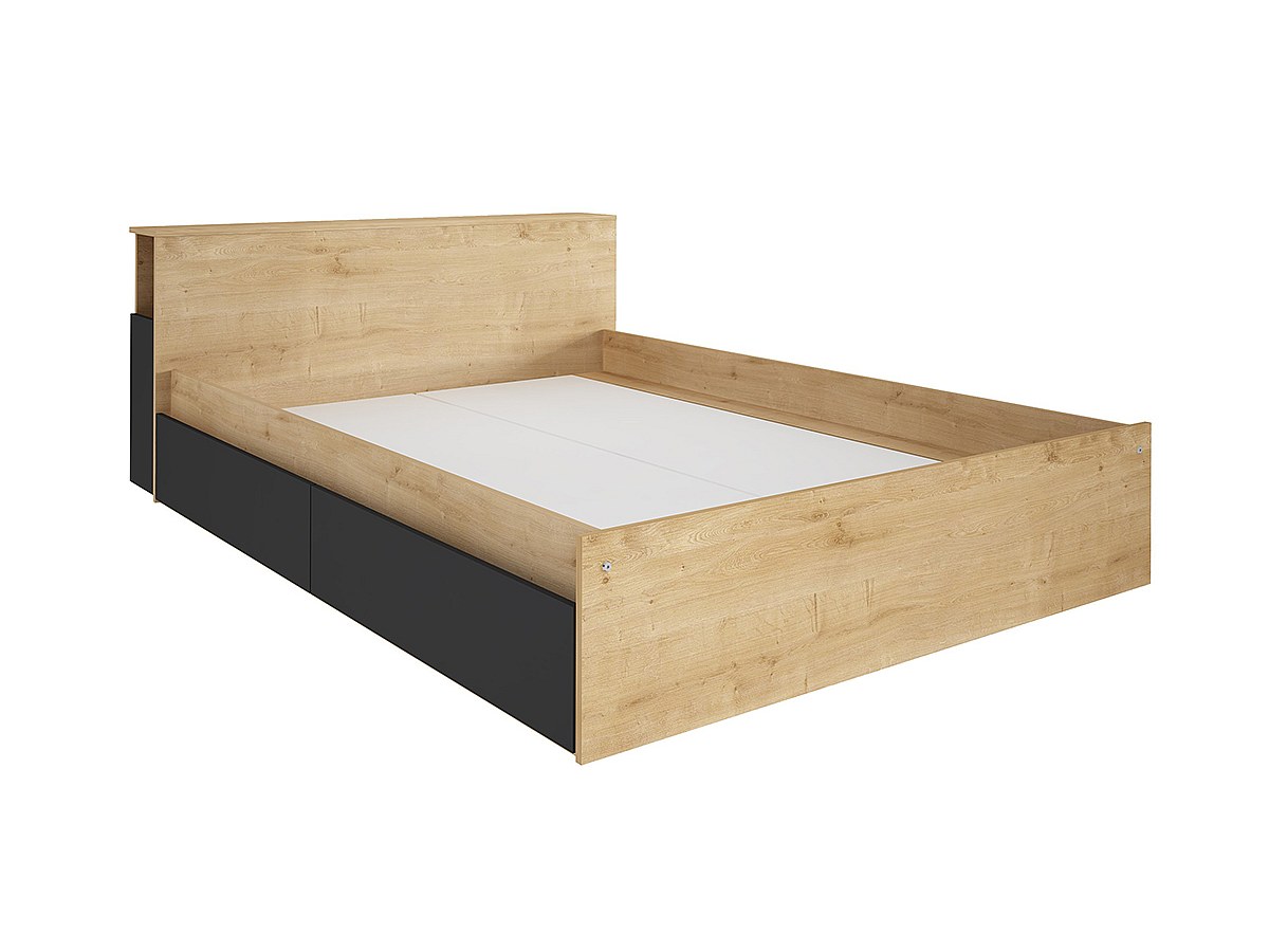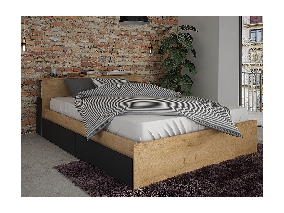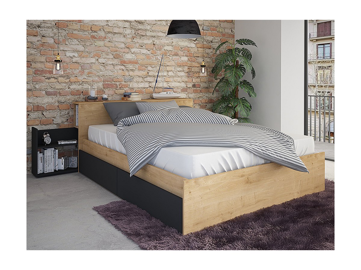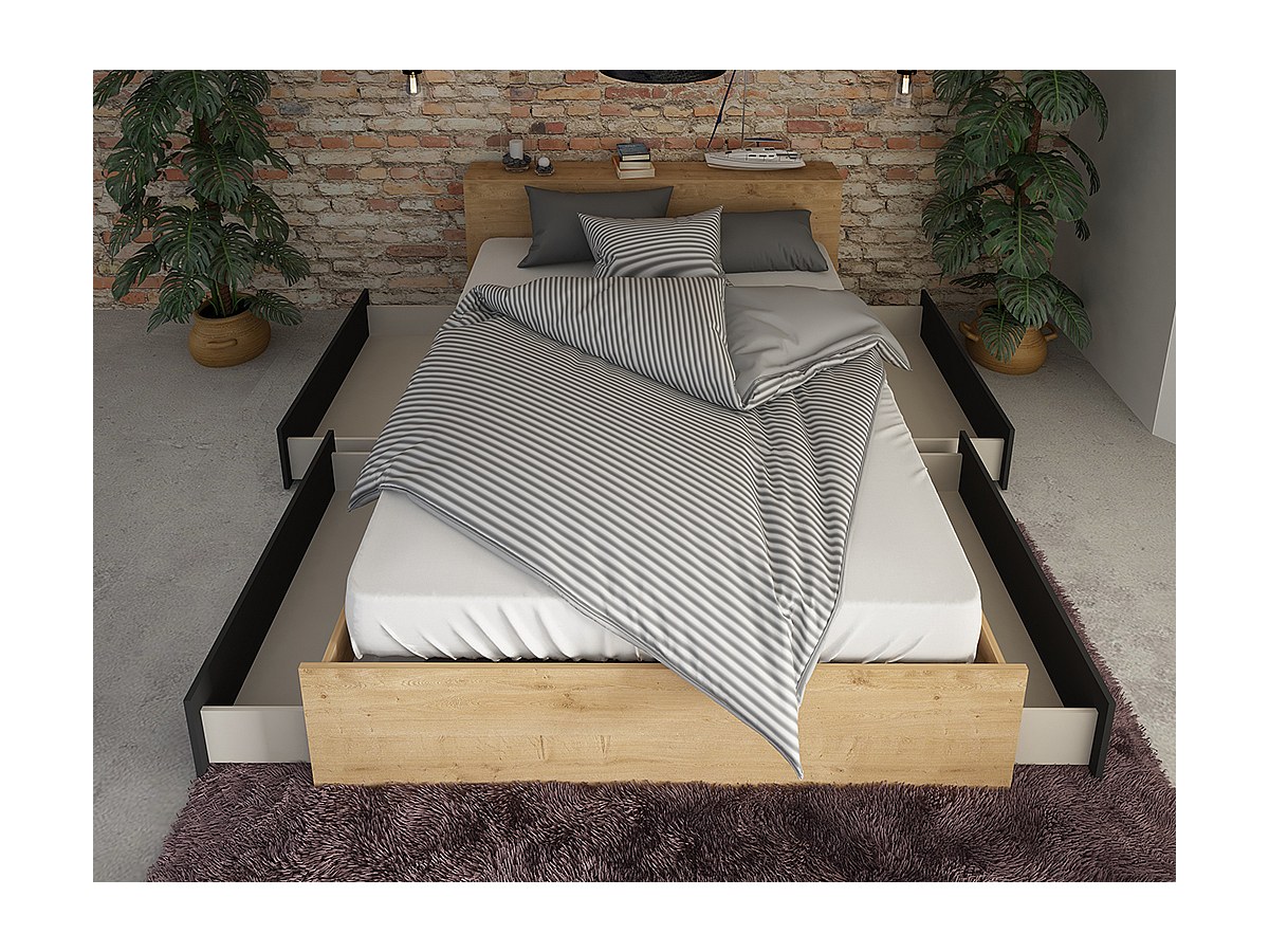Lit FRANK avec tiroirs et chevets intégrés - 140x190cm - Coloris : Chêne et anthracite