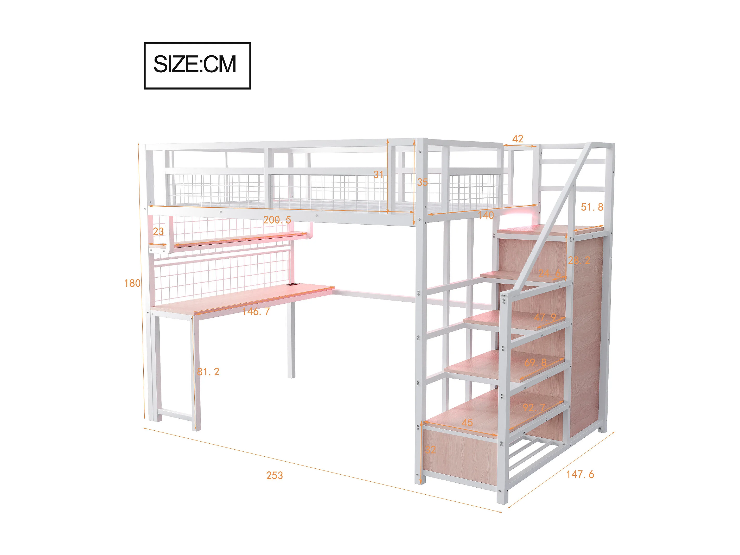 Lit mezzanine pour enfant - 140 x 200 cm - structure en fer - avec escalier de rangement et de sécurité - métal - blanc