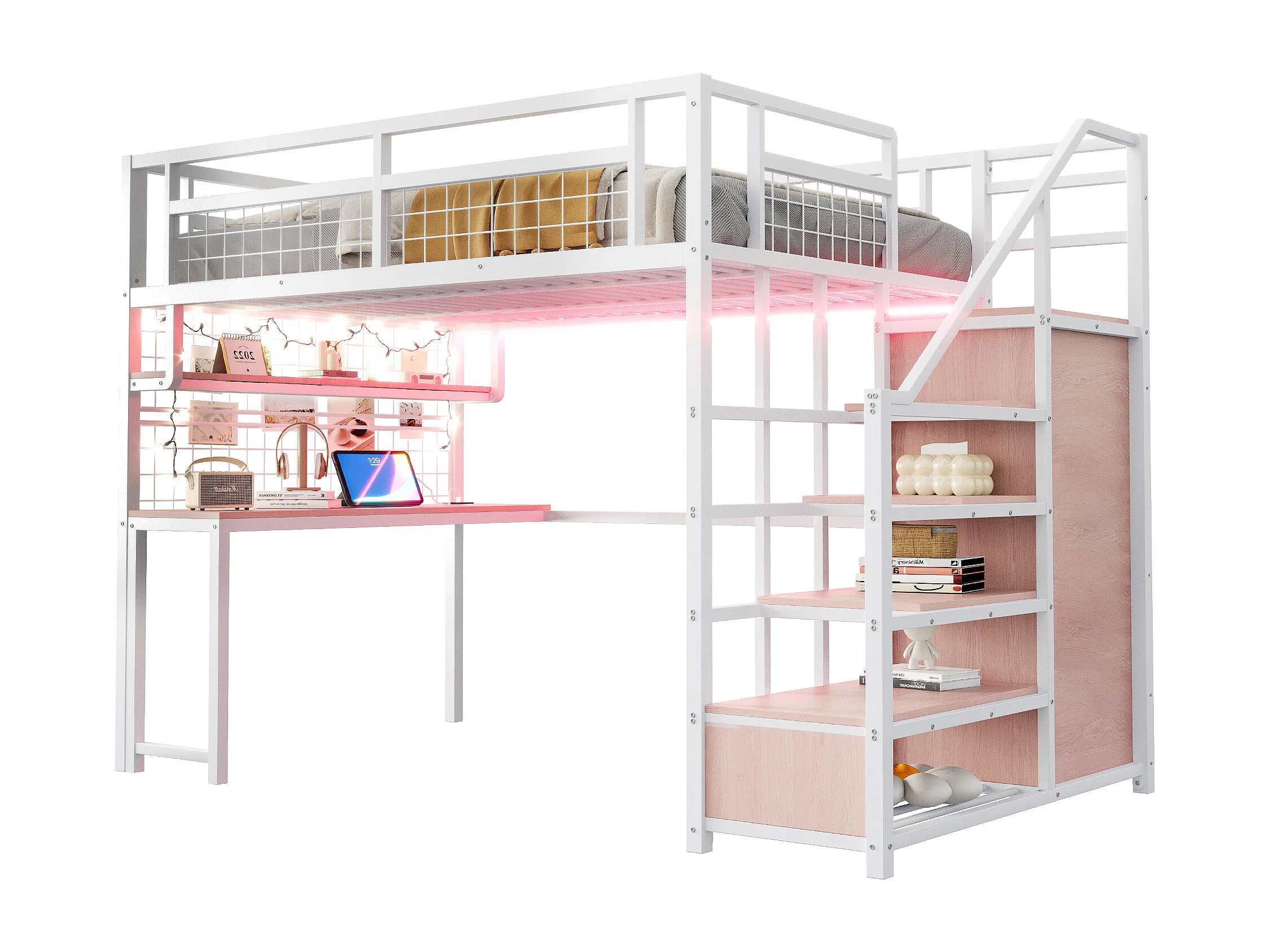 Lit mezzanine 140x200cm en métal - avec étagères et escalier - Blanc (matelas non inclus)