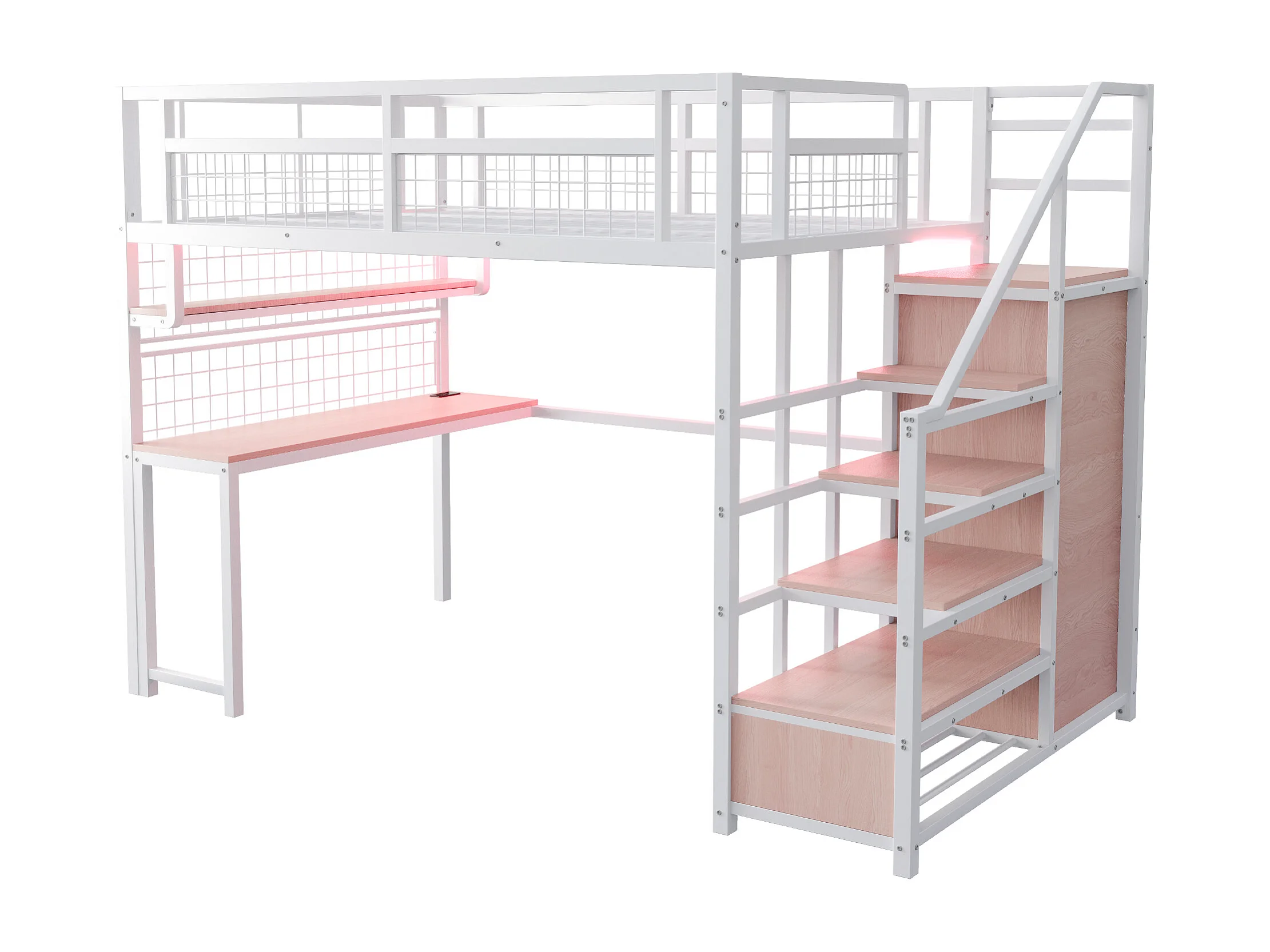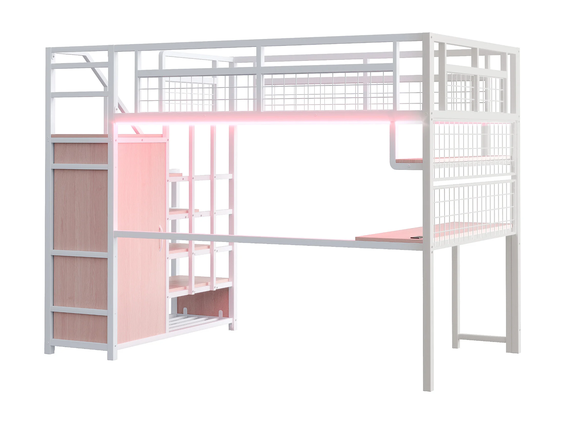 Lit mezzanine en fer - 140x200cm - avec bureau et 5 étagères - Blanc