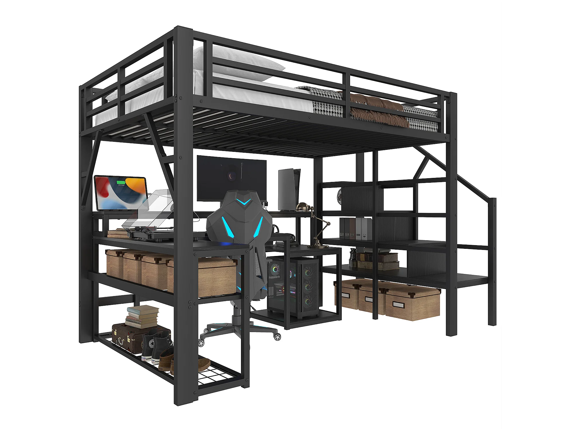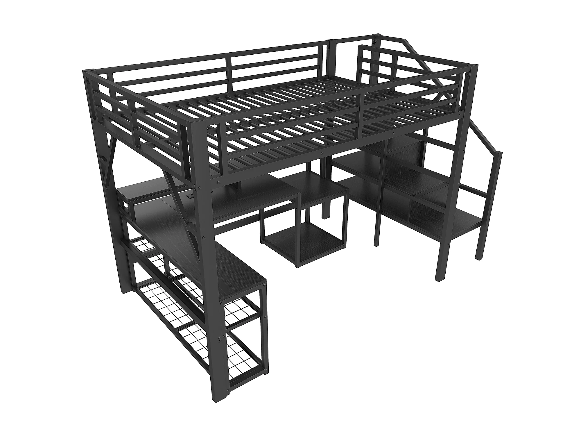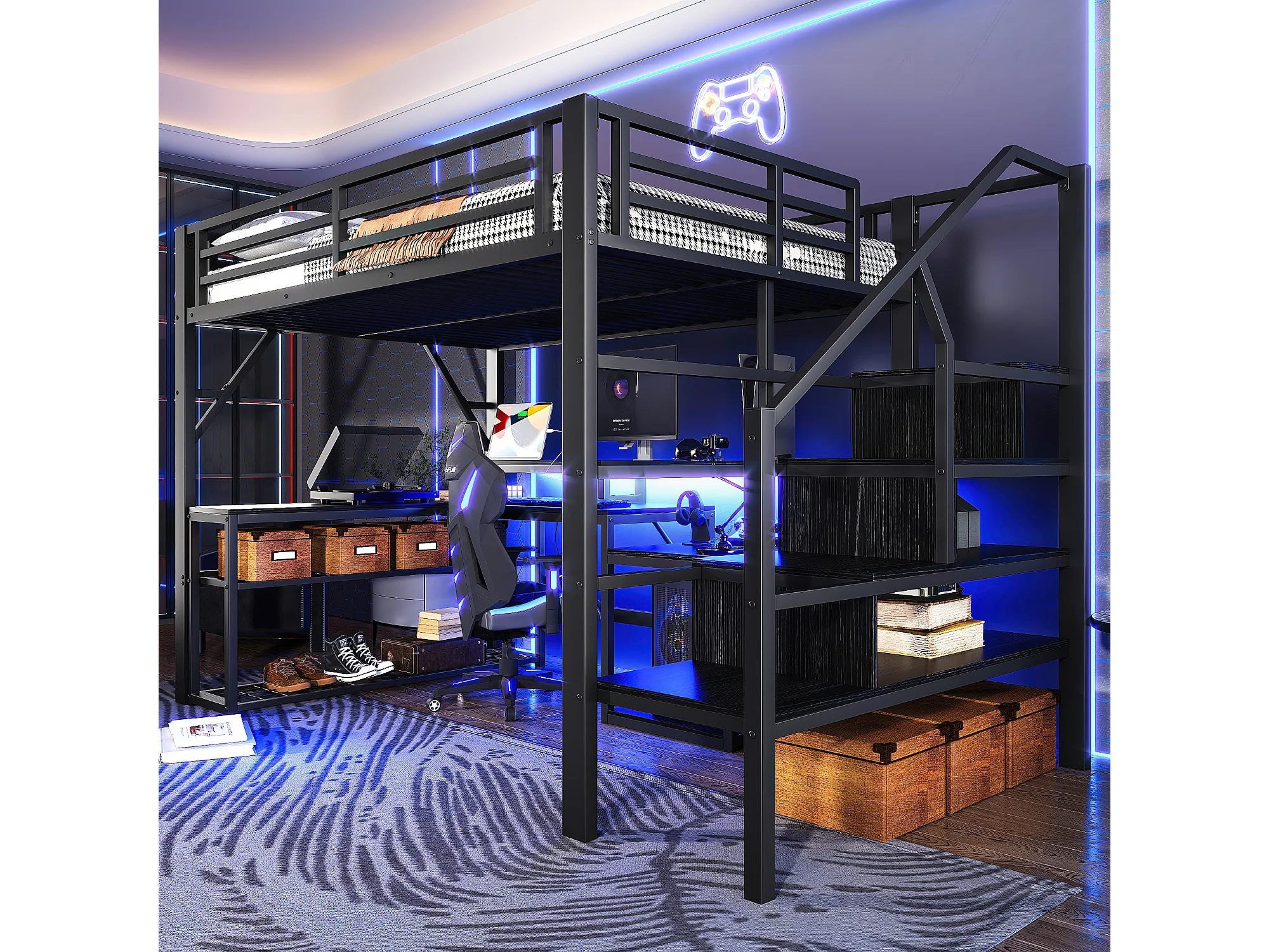 Lit mezzanine 140x200 cm - avec escalier de sécurité - avec bande lumineuse LED + bureau - avec port USB - noir (matelas non inclus)
