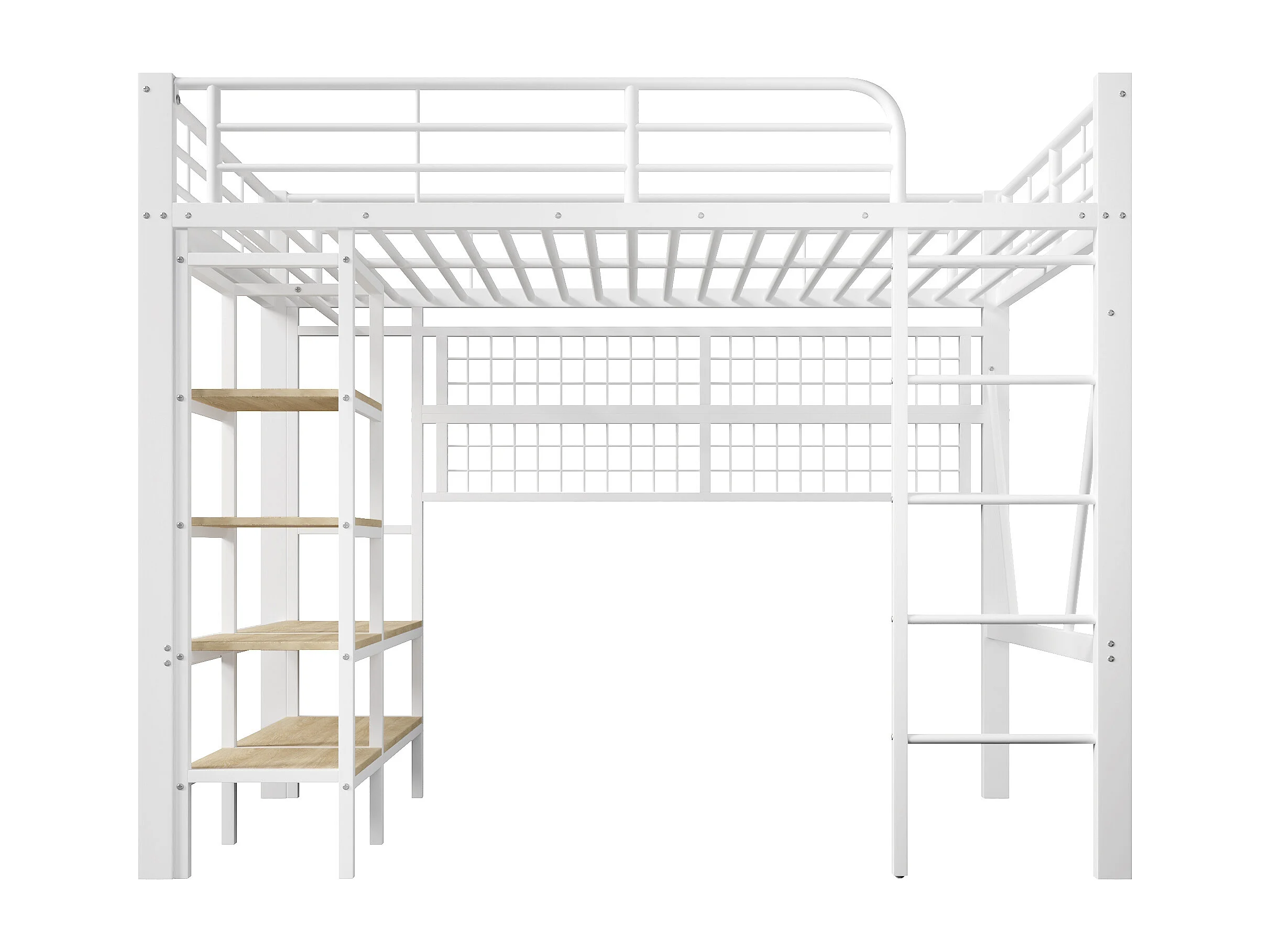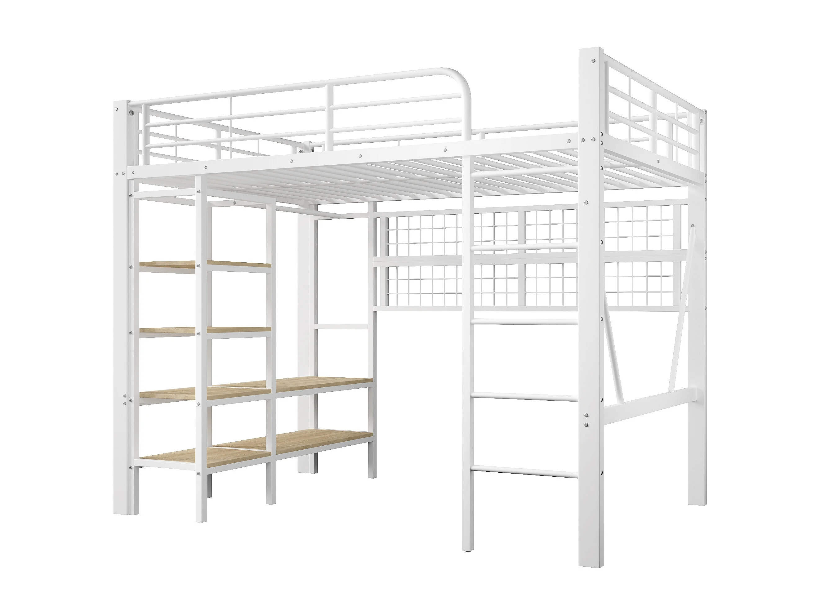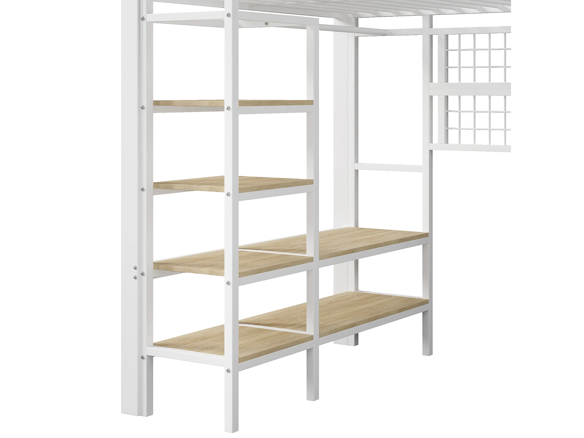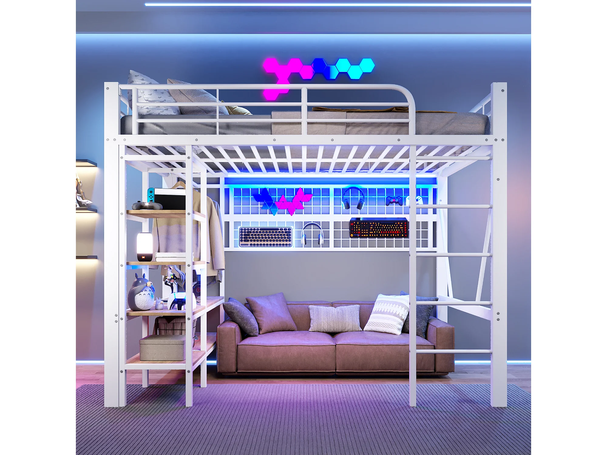 Lit mezzanine 140x200 cm - Structure en fer - avec compartiments de rangement - avec éclairage LED - Blanc (matelas non inclus)