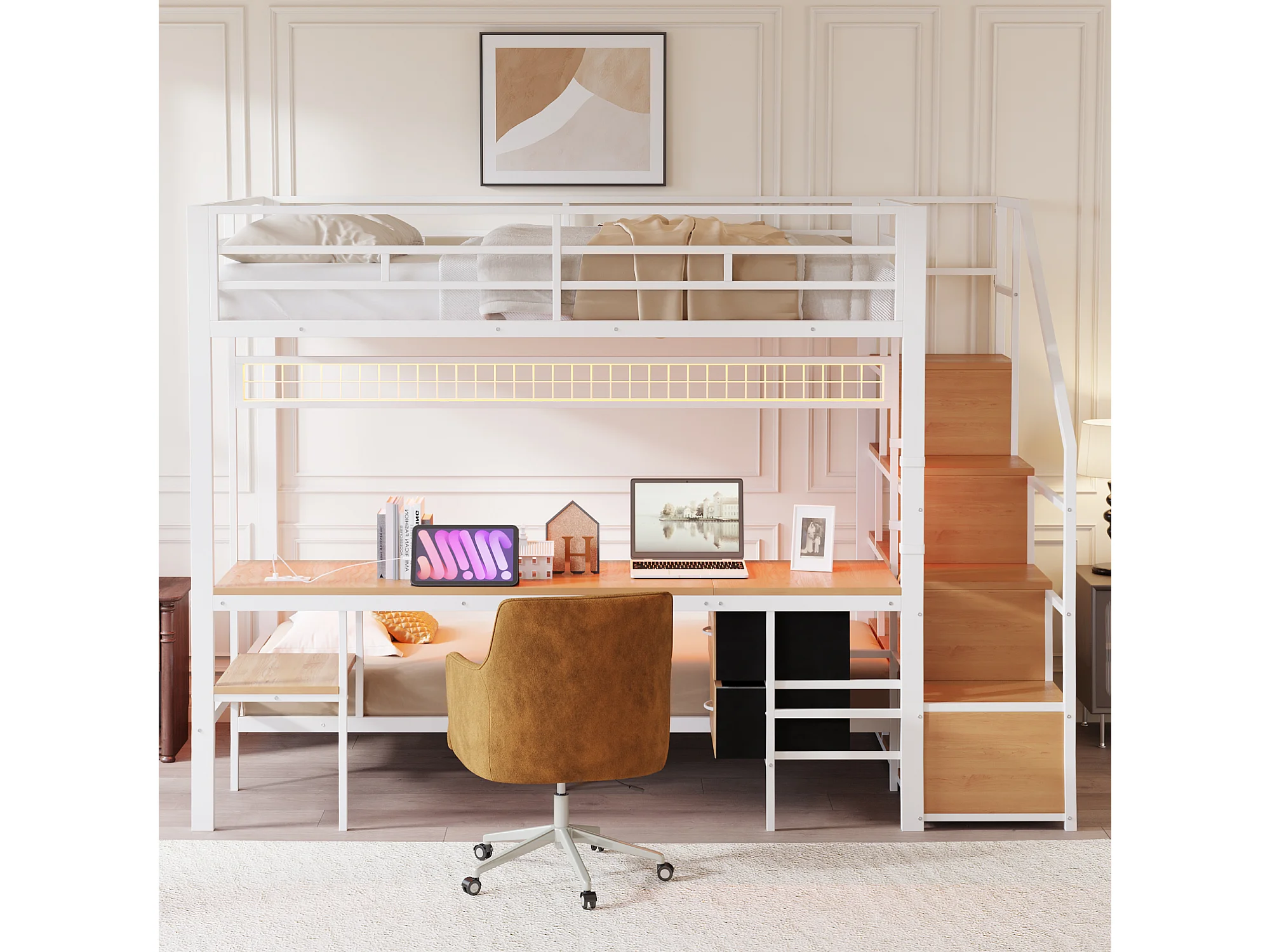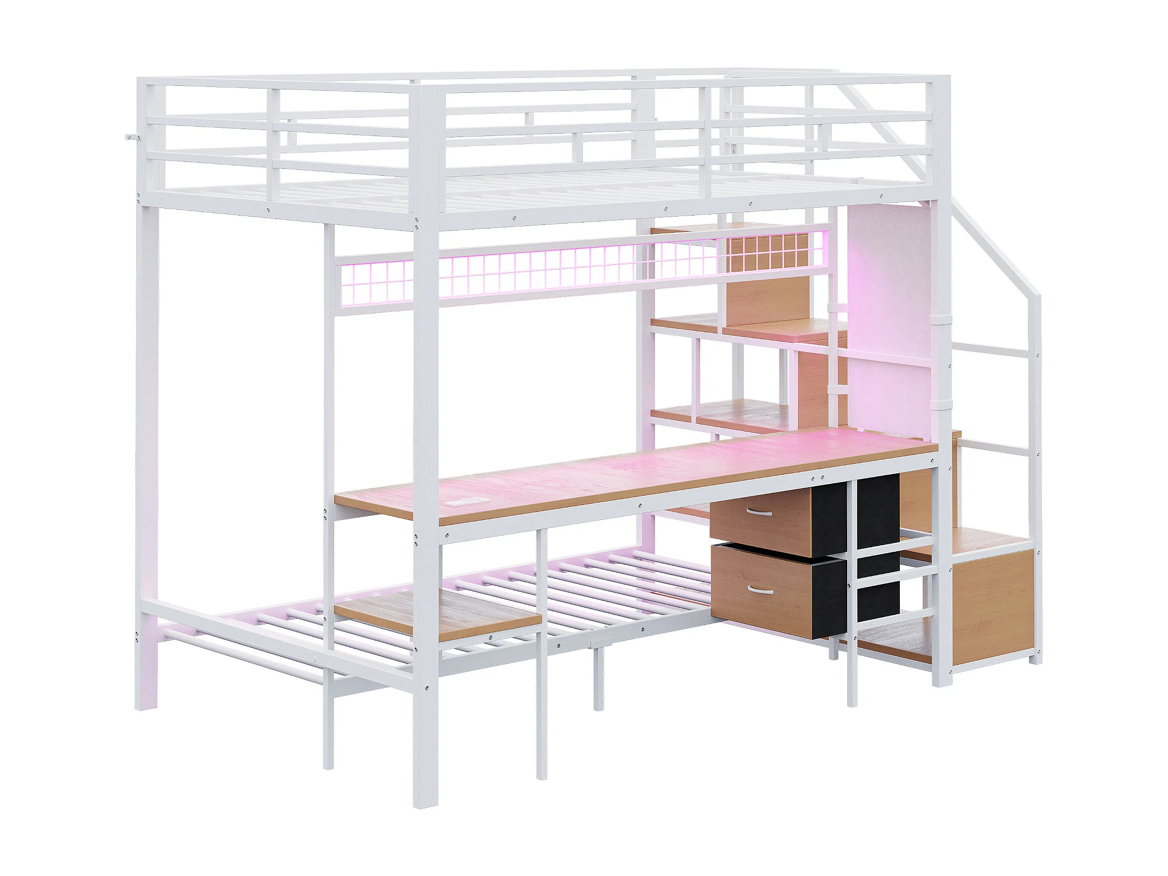 Lit superposé en métal 90x200cm + 140x200cm - avec bureau - éclairage LED - avec prise électrique - avec 2 tiroirs - blanc (matelas non inclus)