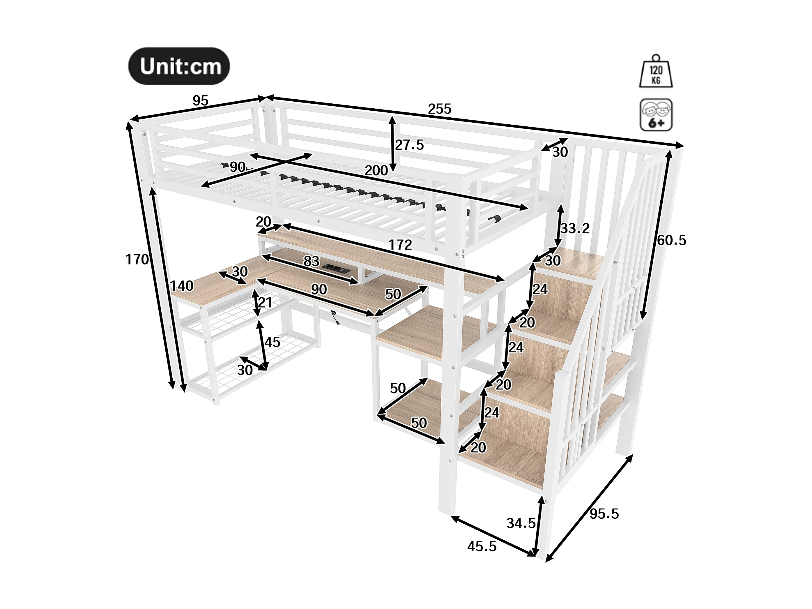 Lit mezzanine 90x200 cm - avec escalier de sécurité - avec bande lumineuse LED + bureau - avec port USB - blanc (matelas non inclus)
