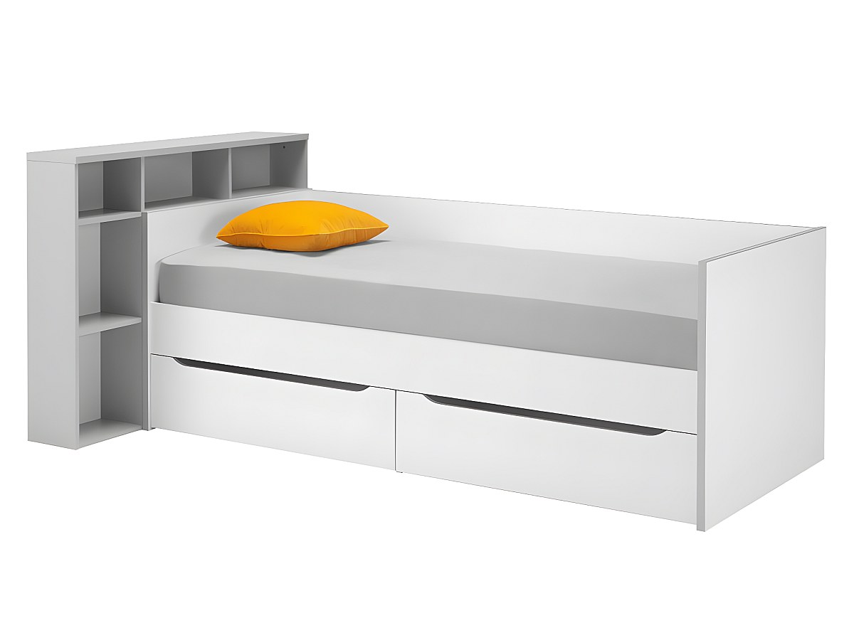 Lit + tête de lit OSCAR avec rangements et tiroirs - 90 x 200 cm - Blanc et gris