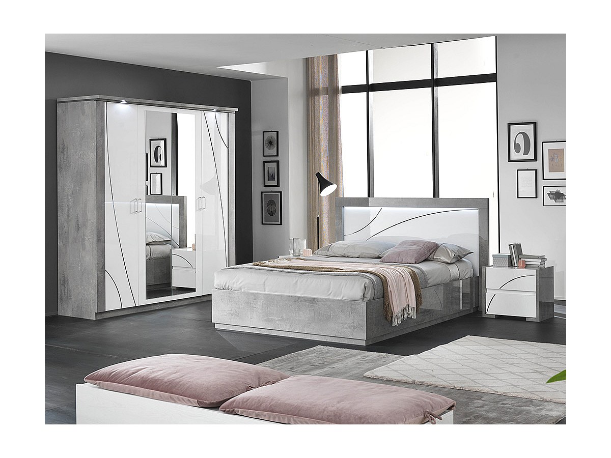 Lit URAM - 160 x 200 cm - Avec LEDs - Coloris : blanc et béton laqué