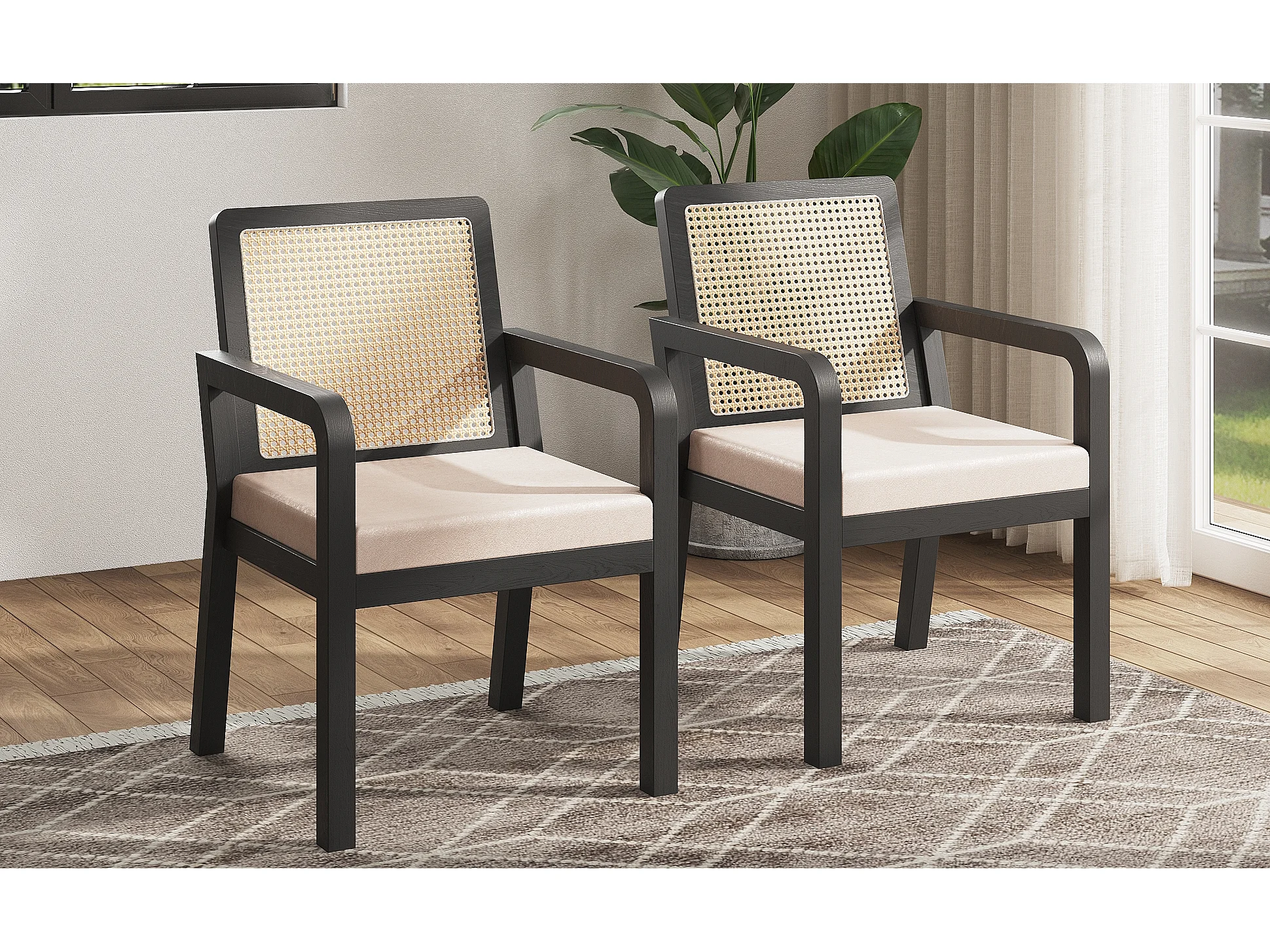Lot de 2 chaises de salle à manger/de coiffeuse en velours - 56 x 57 x 83 cm - avec dossier en rotin - bois - noir