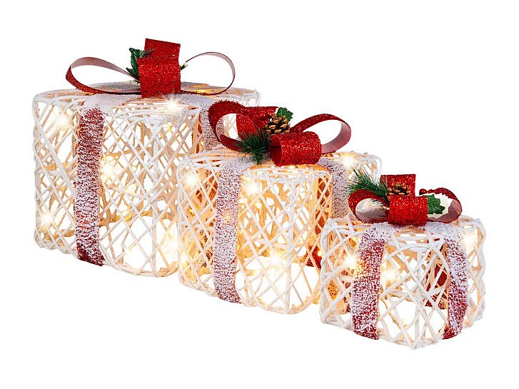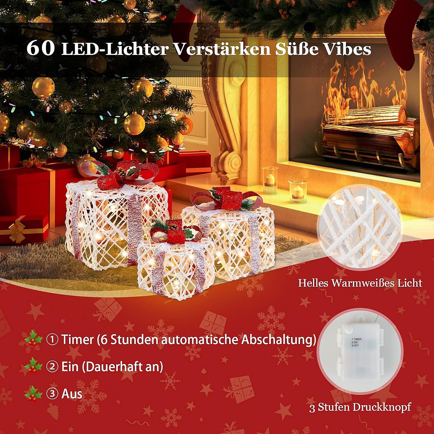Lot de 3 Boîtes à Cadeaux Lumineuses de Noël avec 60 LED de Noël Fonction minuterie 6 heures Pommes de Pin et Feuilles