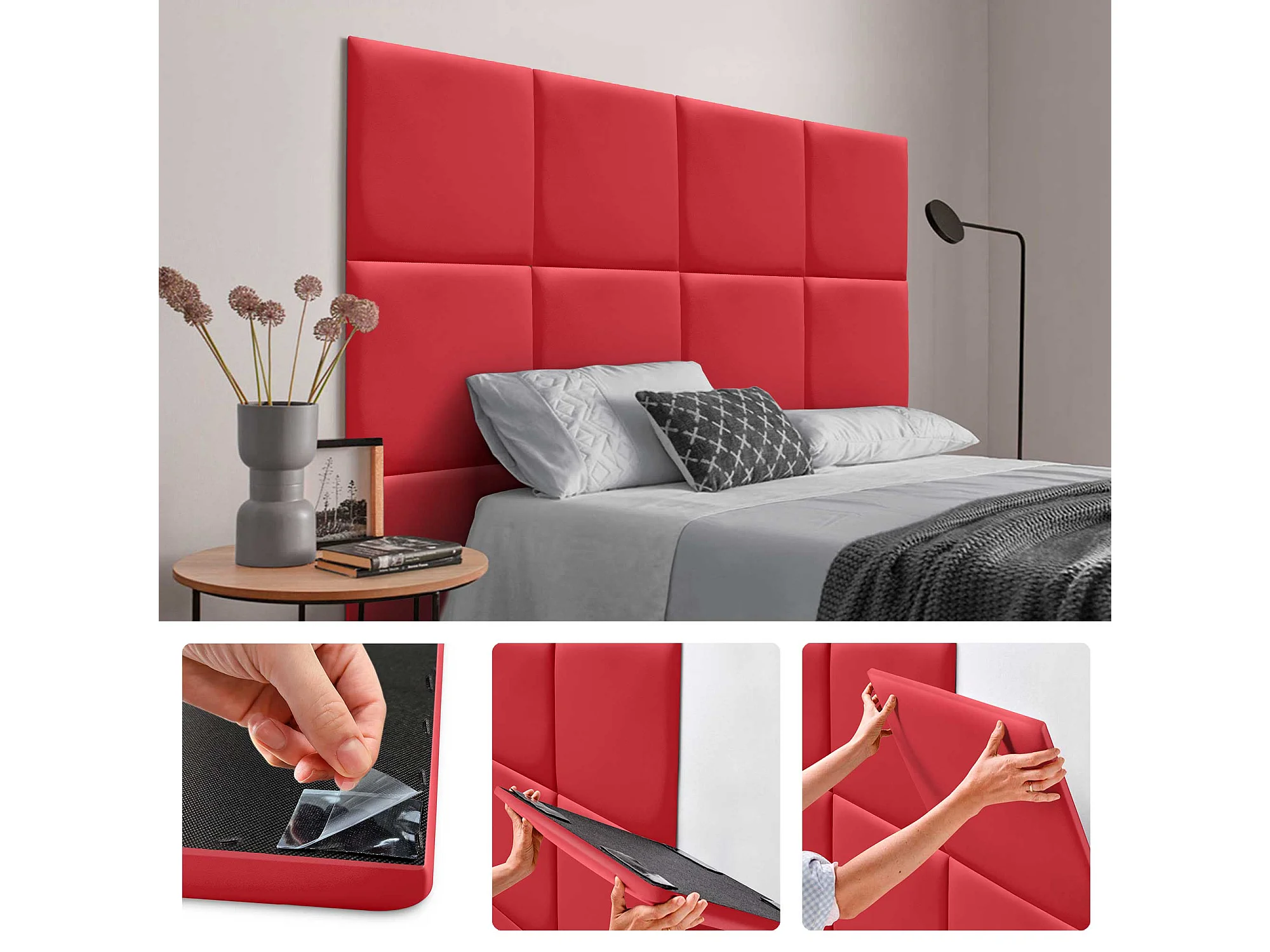 Lot de 8 panneaux rembourrés en similicuir écologique DHOME, pack autocollant pour protection acoustique murale absorbante (Rouge, 60 x 60 cm, x8)