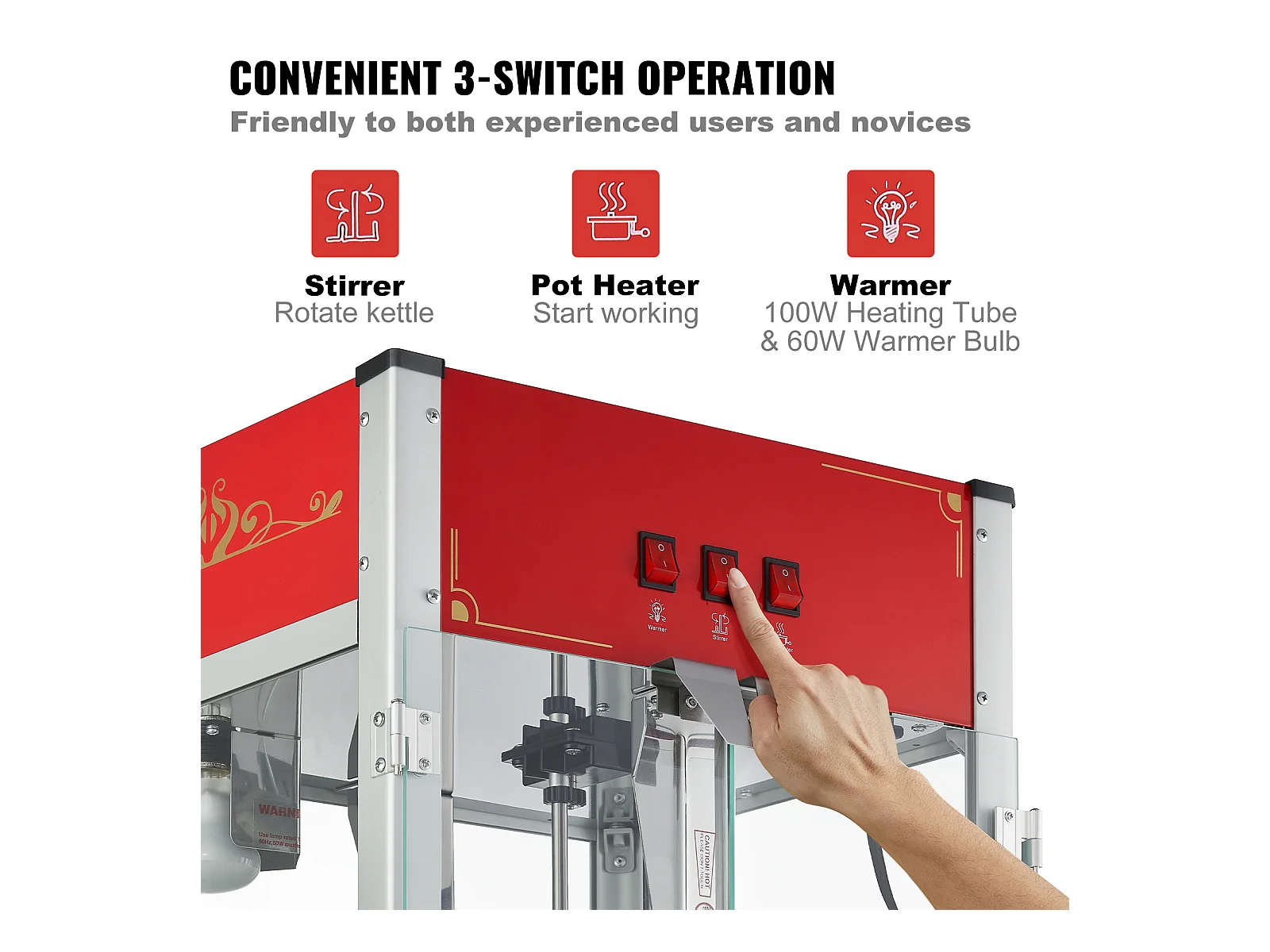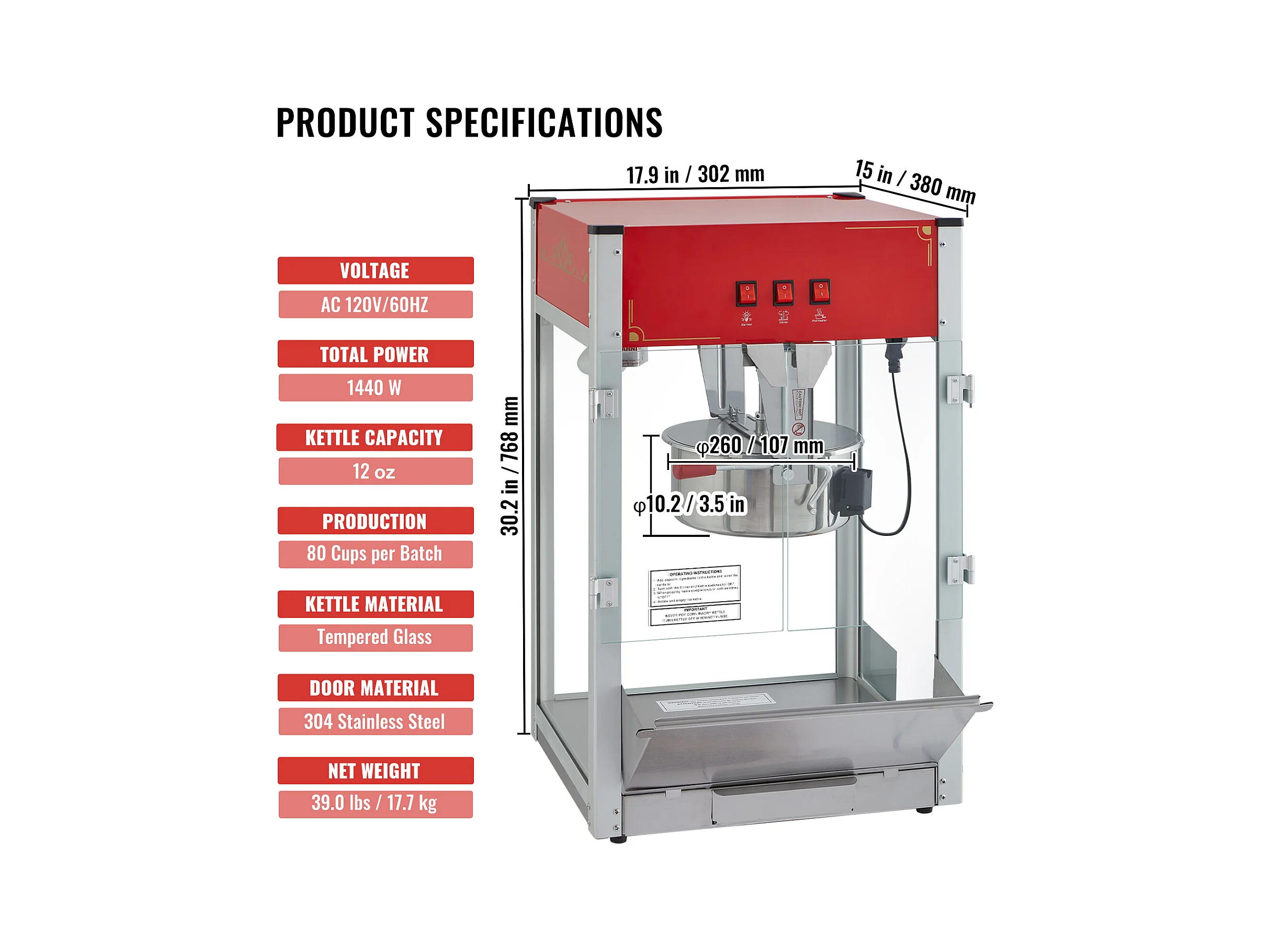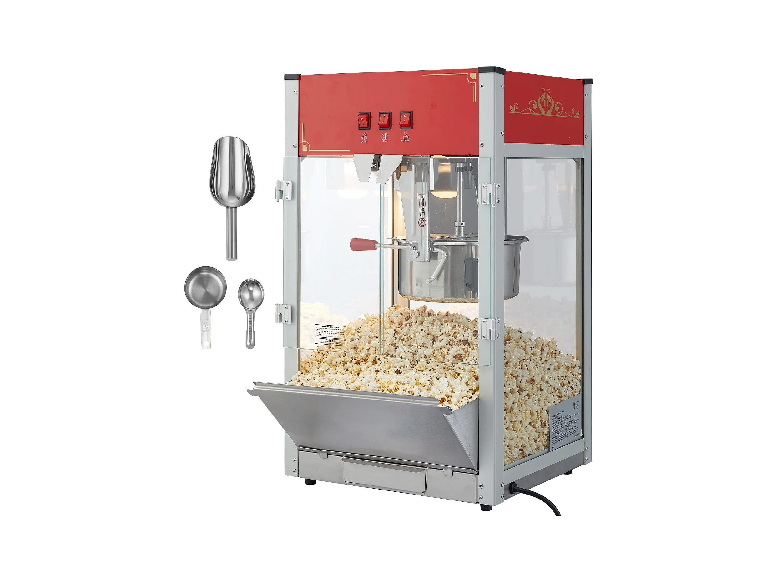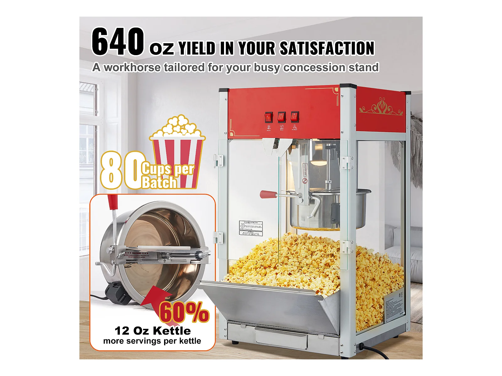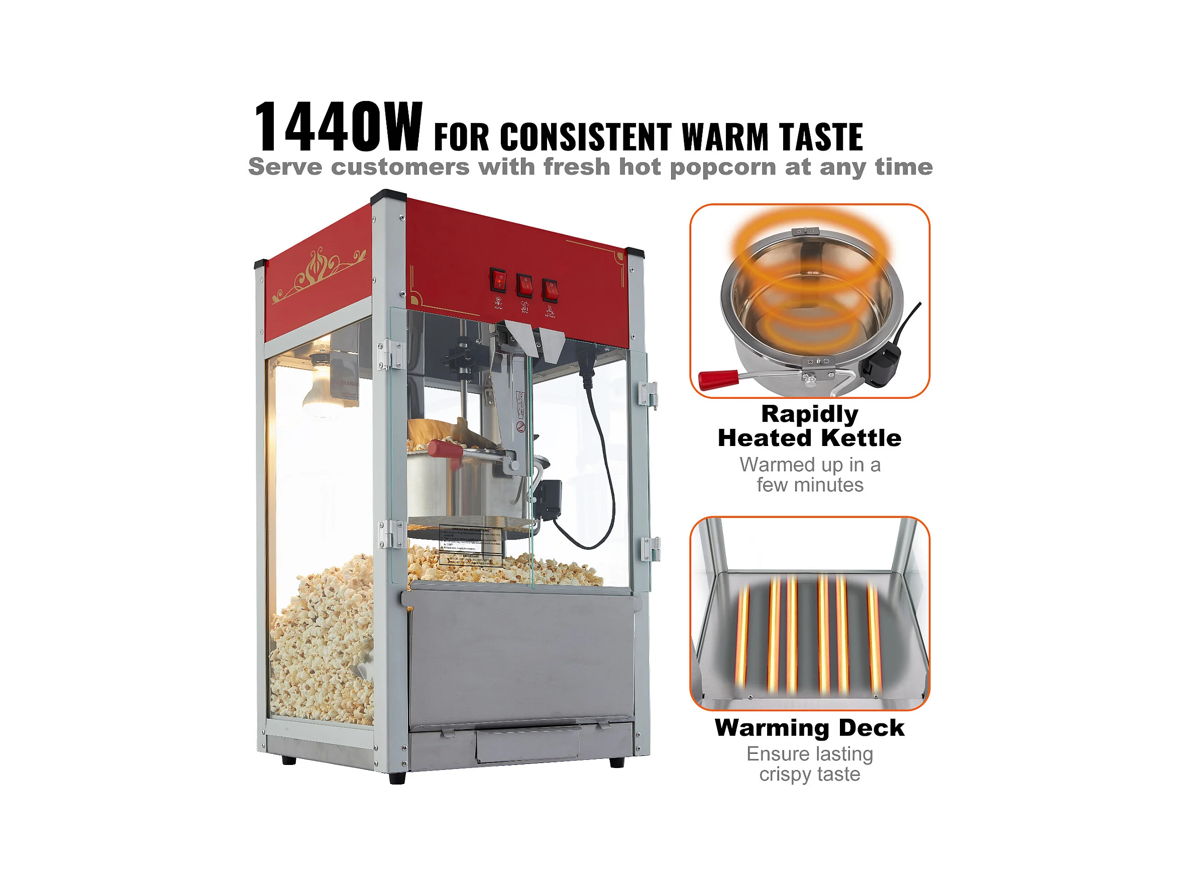 Machine à Pop-Corn SucceBuy, 1440 W, Bouilloire de 12 oz, 80 Tasses par lot, Machine de Comptoir avec Verre Trempé, 3 Cuillères en Acier Inoxydable, Rouge