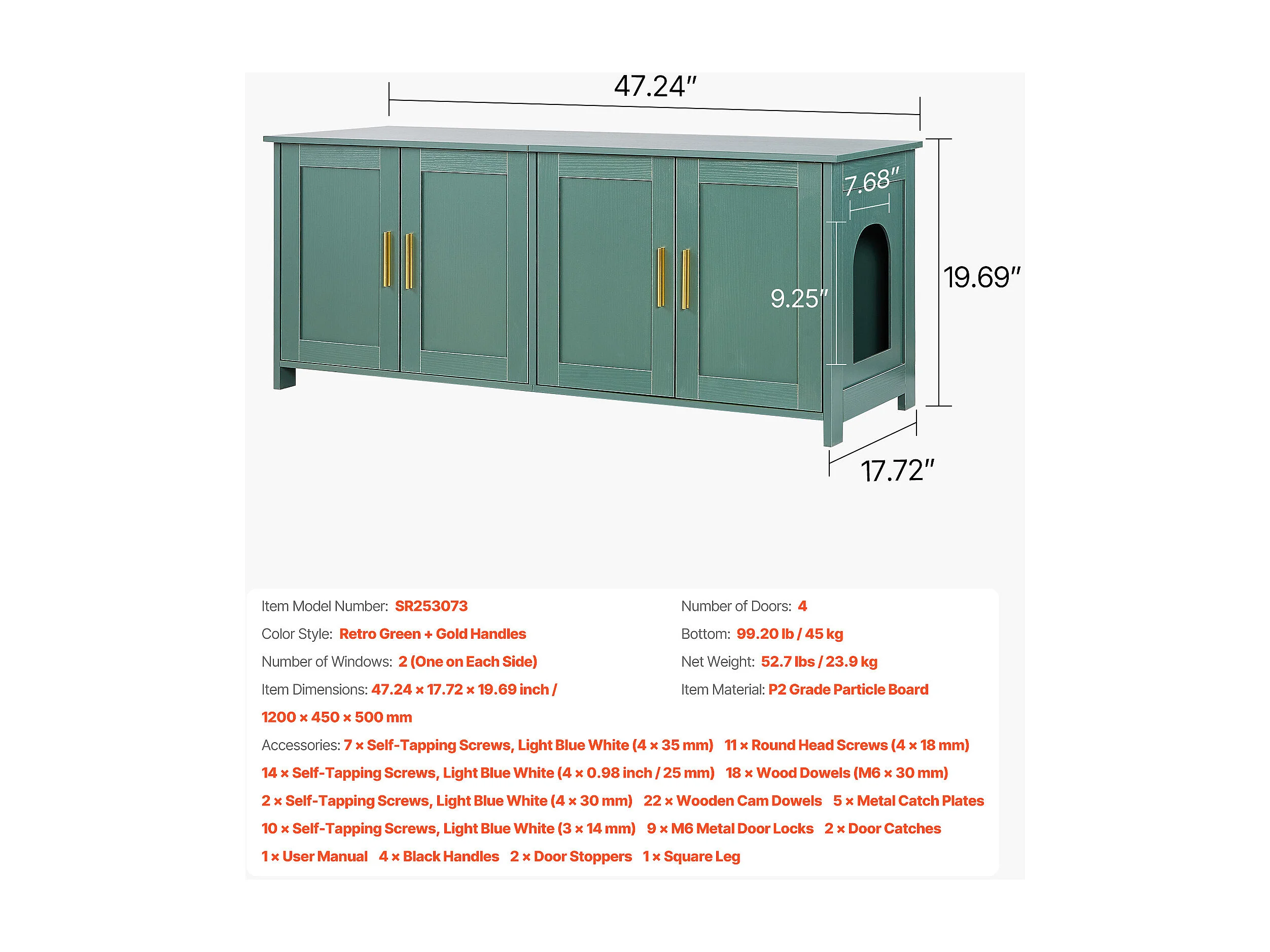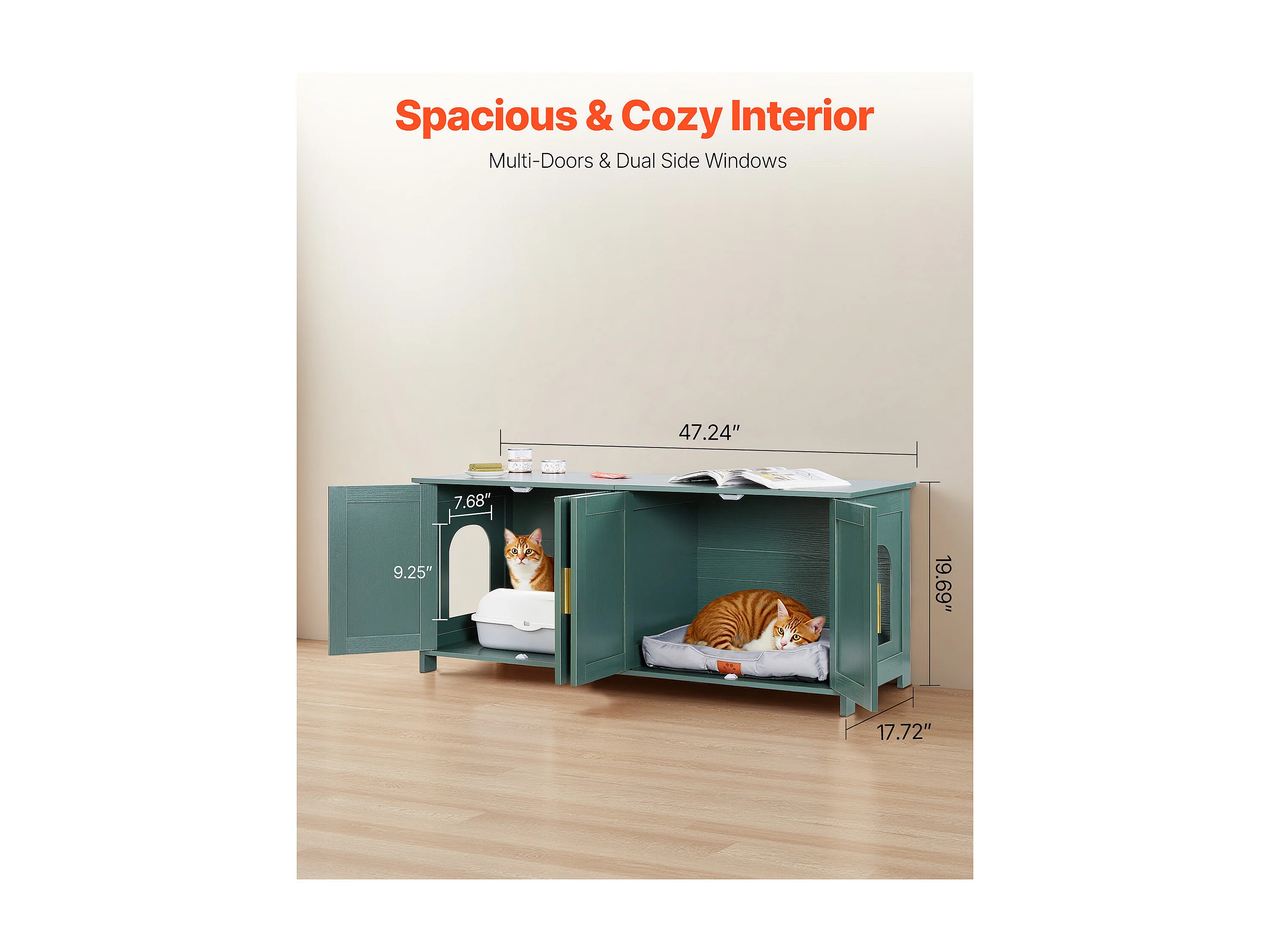 Meuble Bac à Litière SucceBuy Chat Armoire Cache Maison de Toilette de Chat Intérieur, avec 4 Portes et 2 Entrées, Niche Cache-litière en Bois, 120x45x50 cm