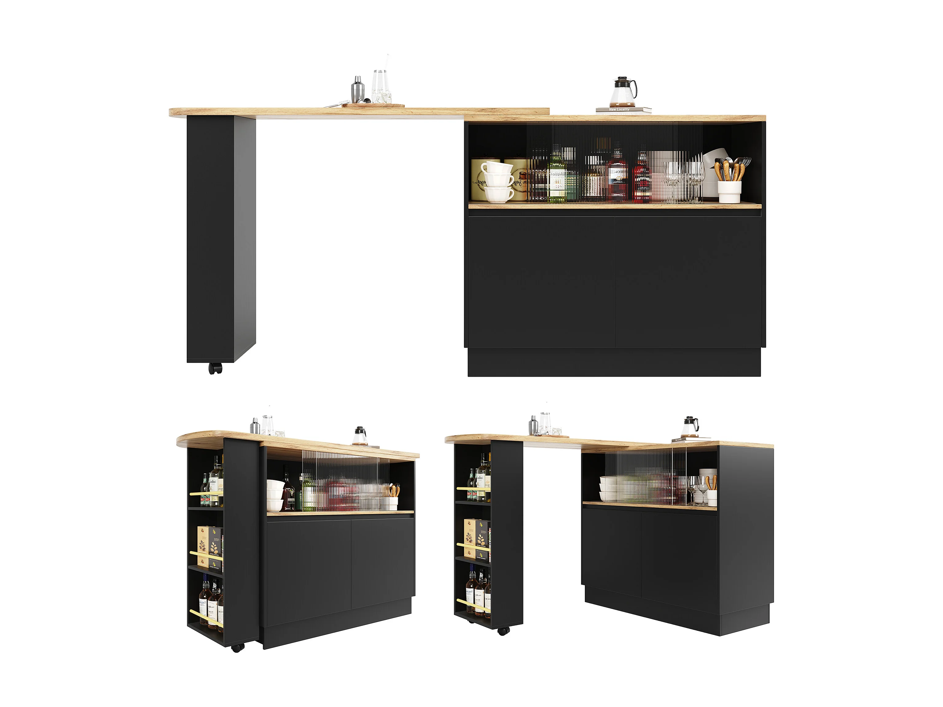 Meuble de bar rotative - 138 x 38 x 105.5 cm - avec porte à rabat + étagères latérales - MDF - noir