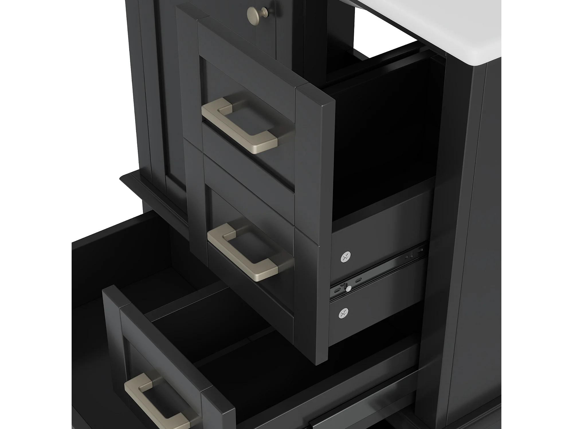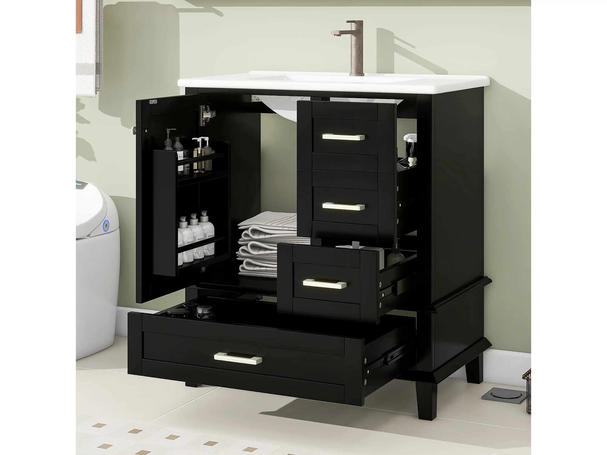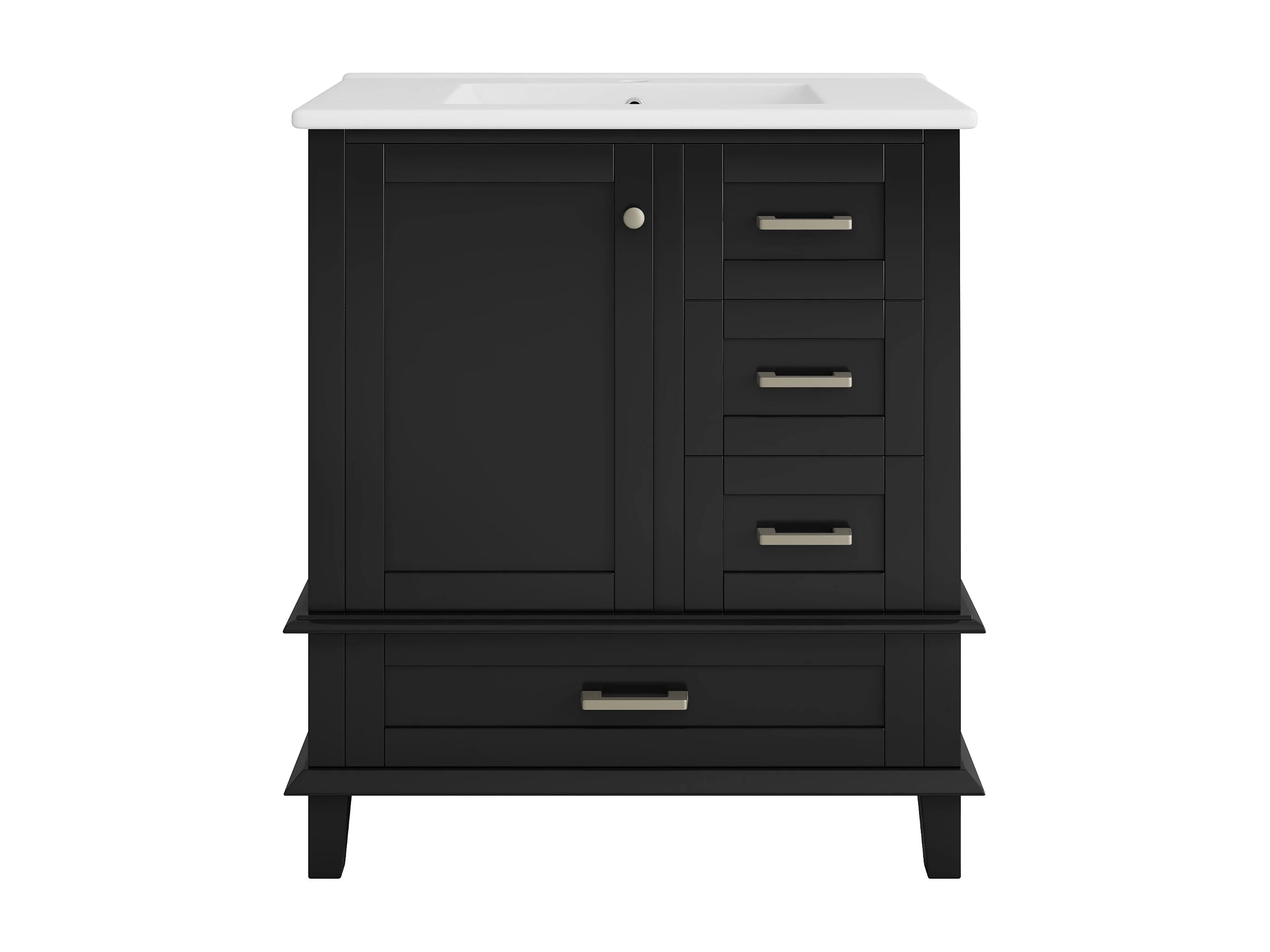 Meuble de salle de bain sur pied - avec une vasque en céramique - 1 porte et 3 tiroirs - Noir(robinet non inclus)