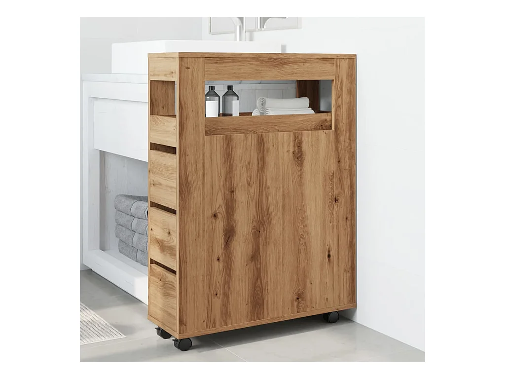 Meuble étroit de salle de bain à roulettes chêne sonoma