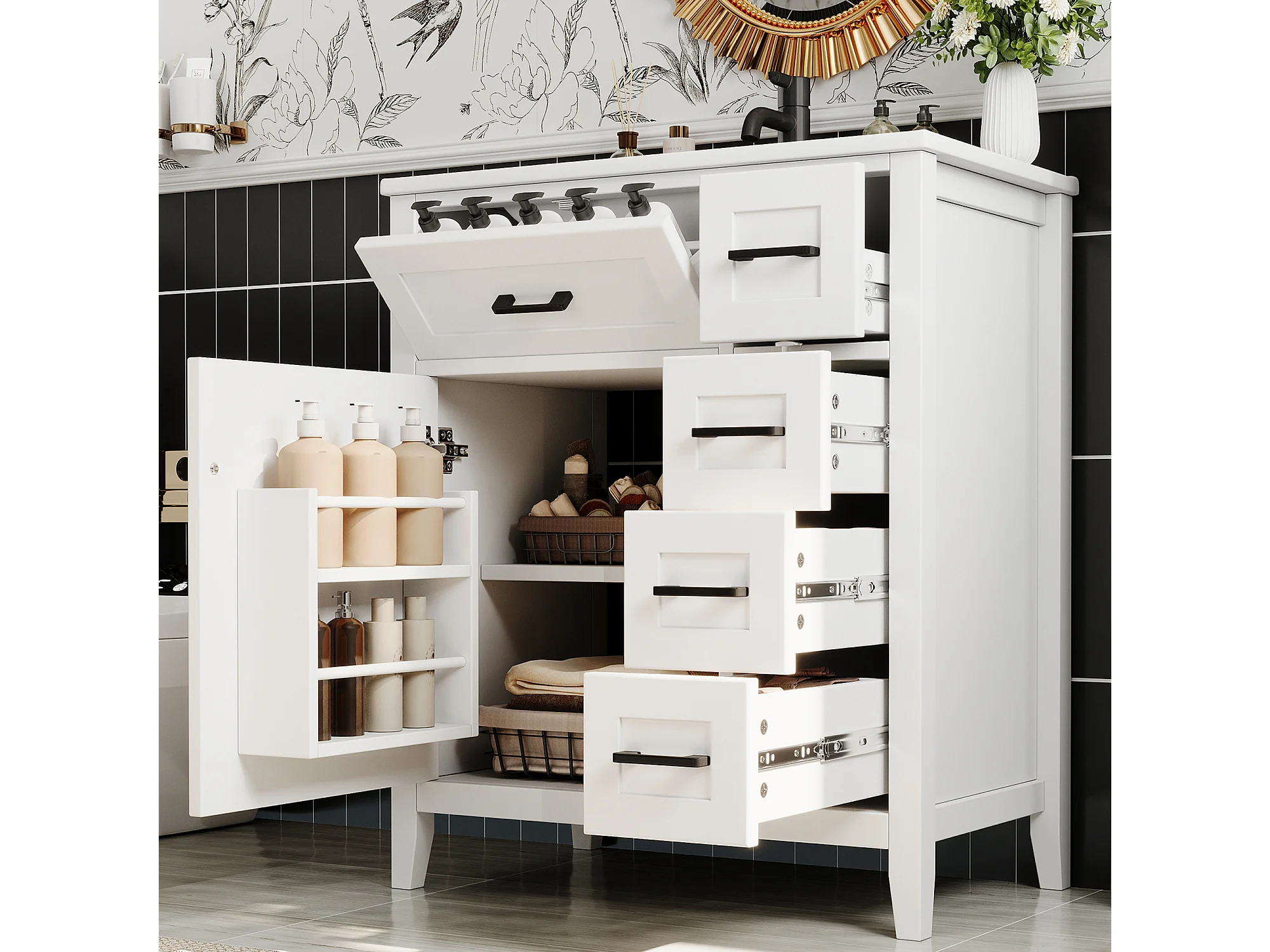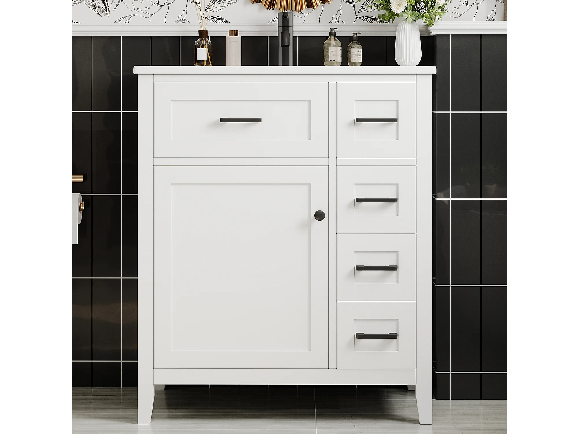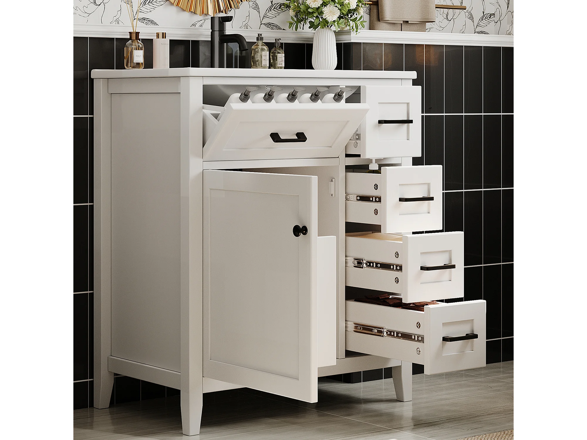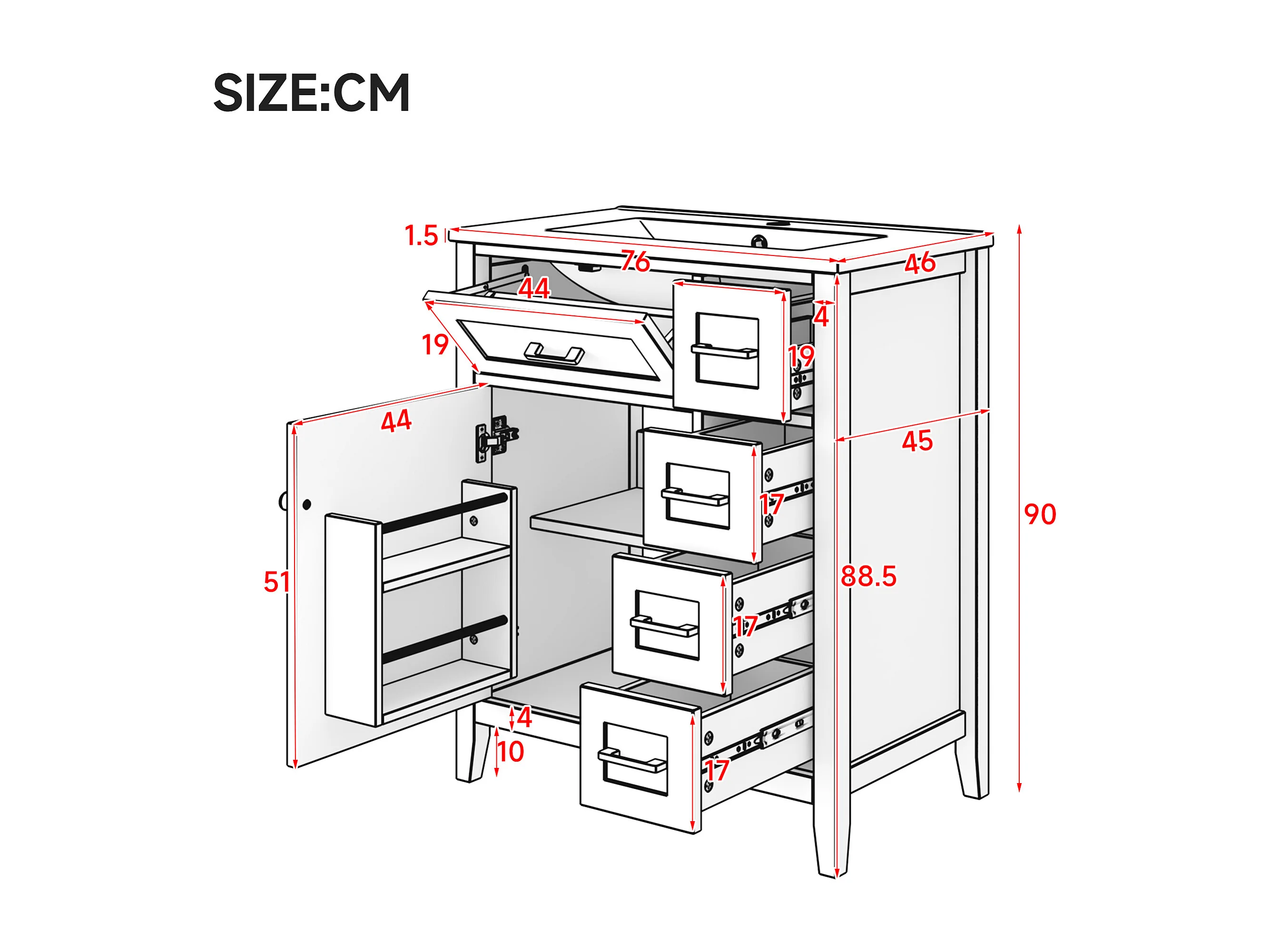 Meuble vasque de salle de bain autoportant - 76 x 46 x 90 cm - avec 4 tiroirs + portes + lavabo en céramique - MDF - blanc