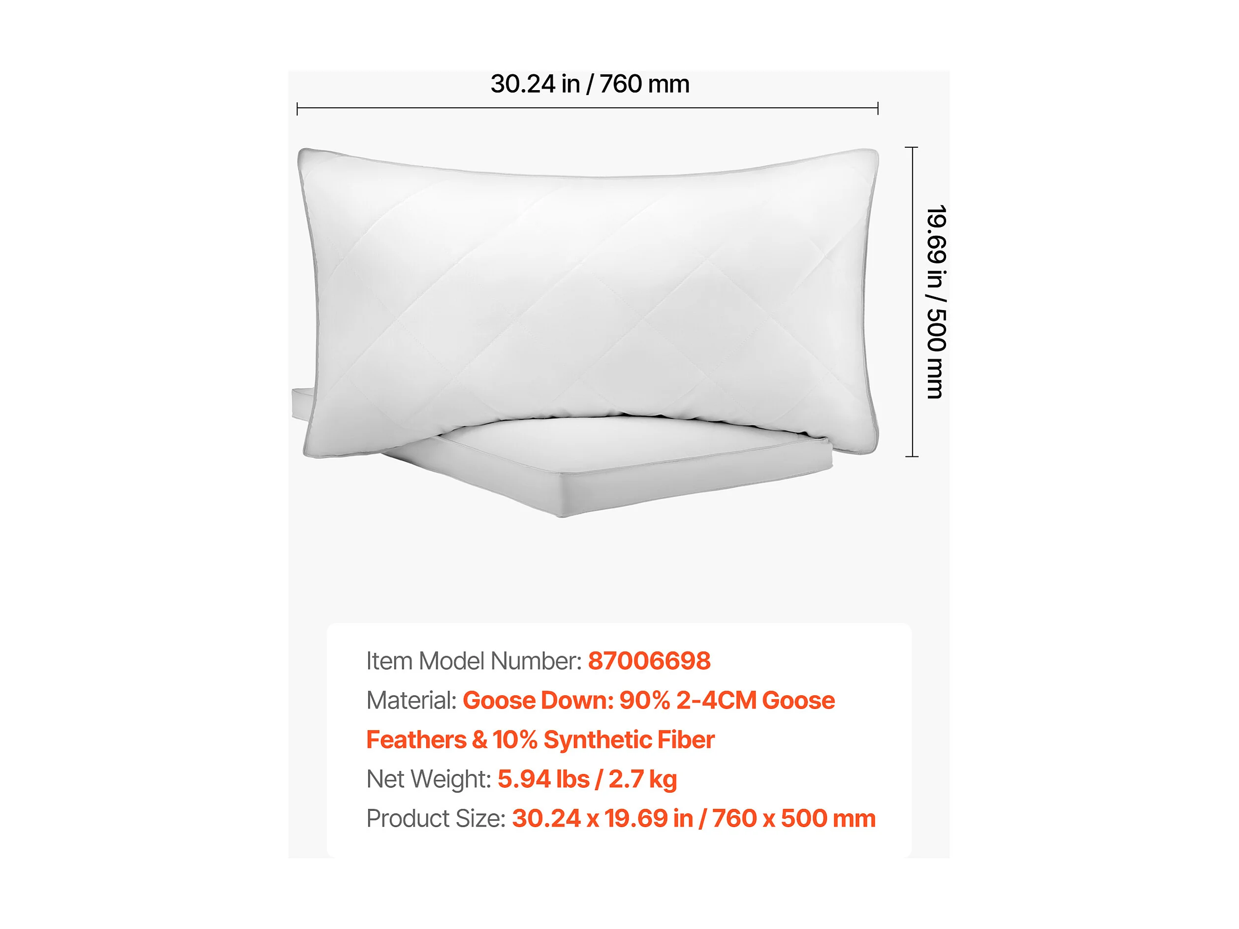 Oreiller en Duvet SucceBuy, Lot de 2, 91 x 50 cm, avec Housse en Coton, Garnissage en Duvet et Plume d'Oie et Fibre Synthétique, Bon Maintien, Confort Optimal