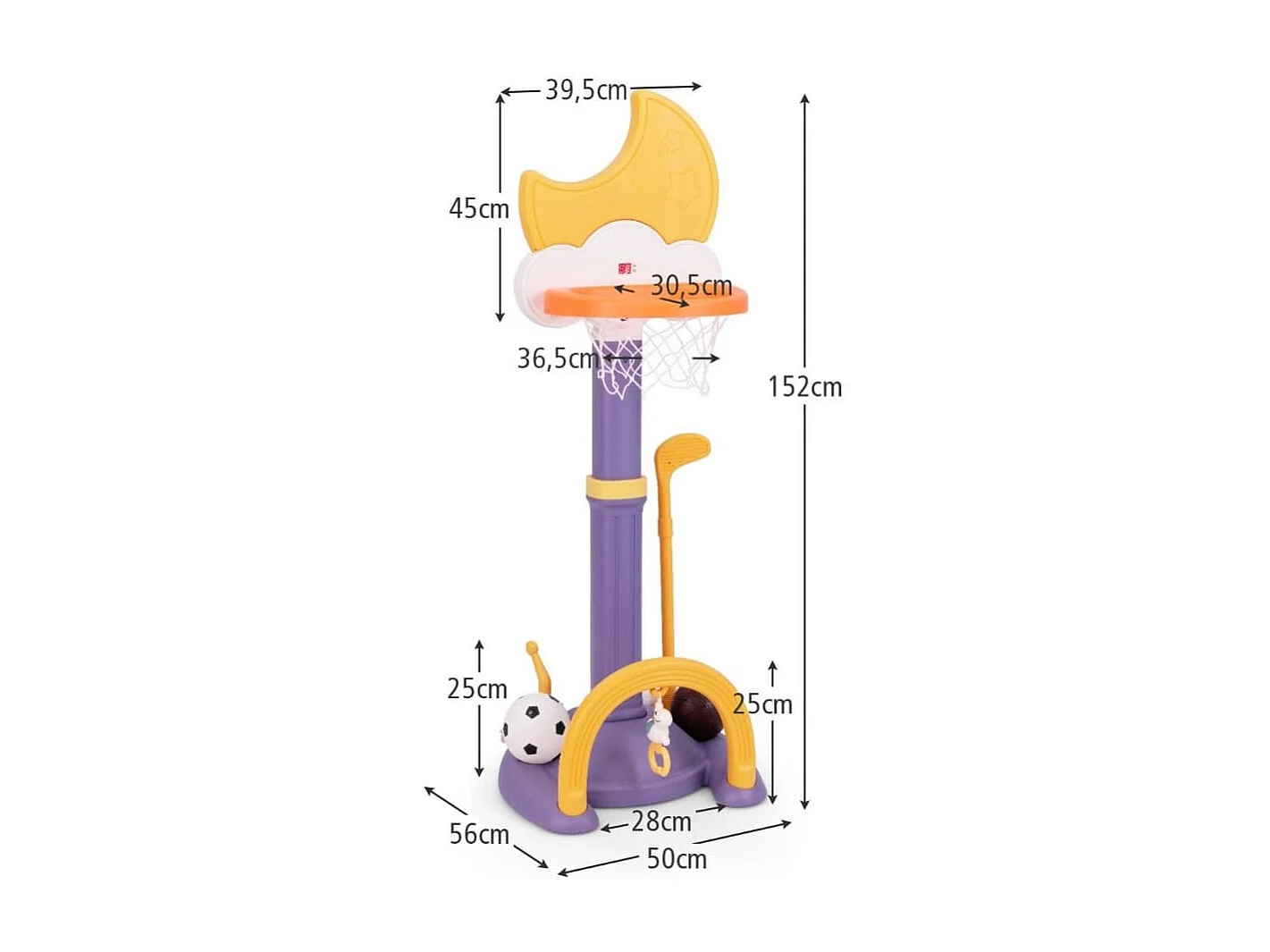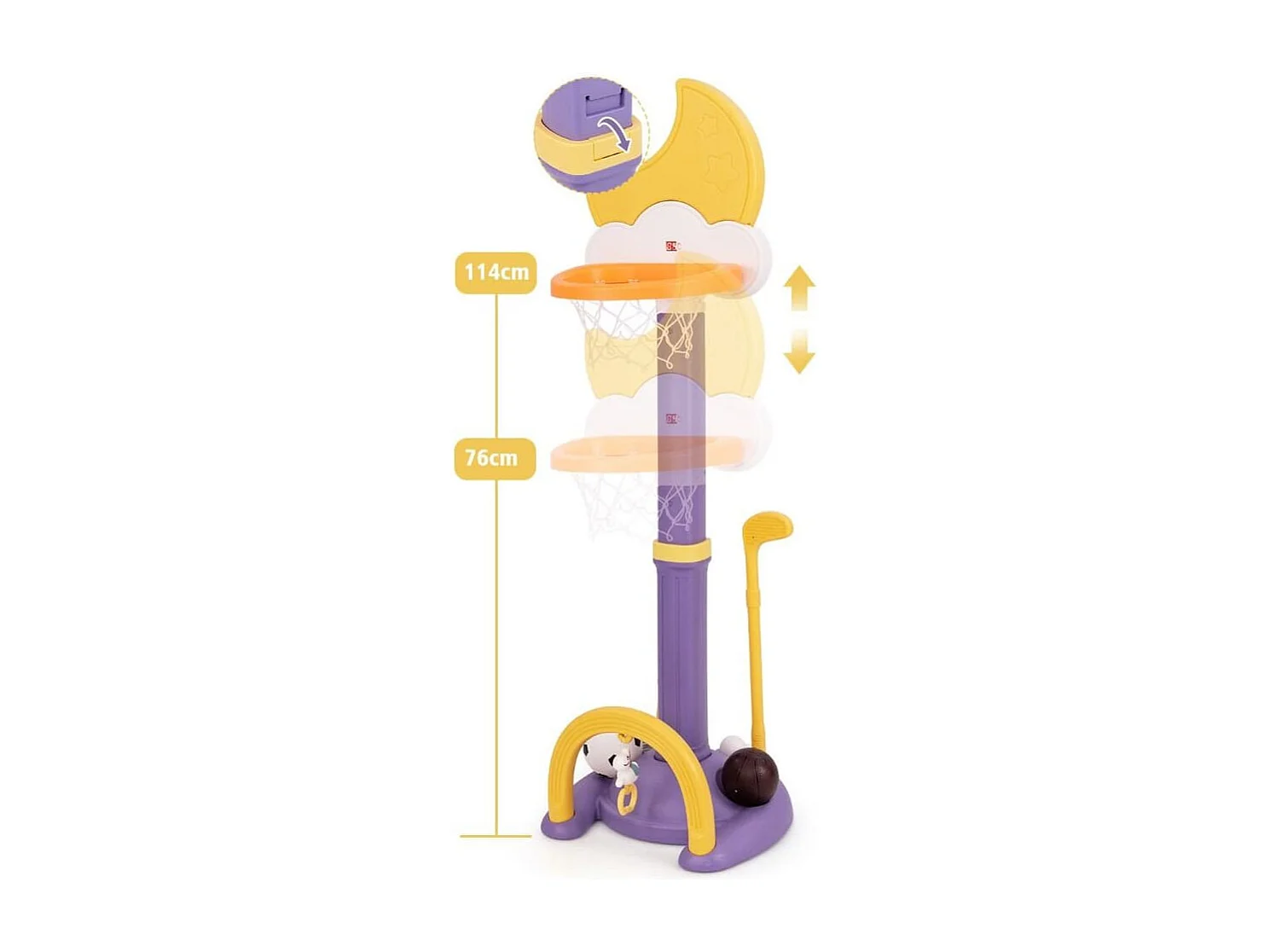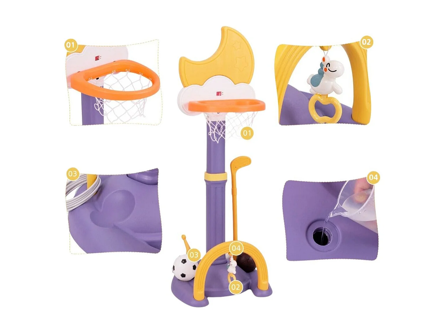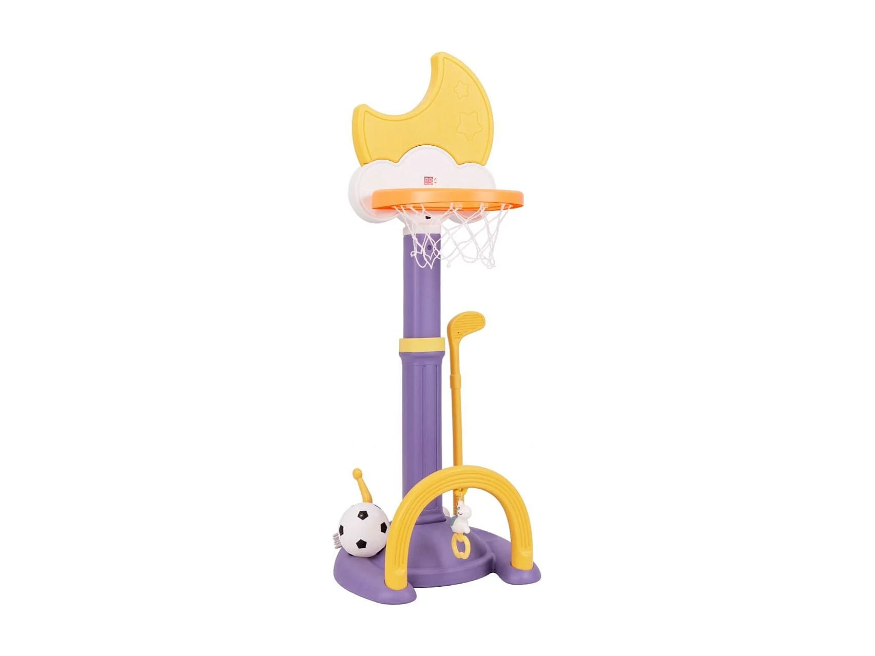 Panier de Basket 4-en-1 Aire de Jeu Réglable en Hauteur avec Basketball Football Golf et Jeu de Anneaux pour Enfants à Partir de 3 Ans Jaune