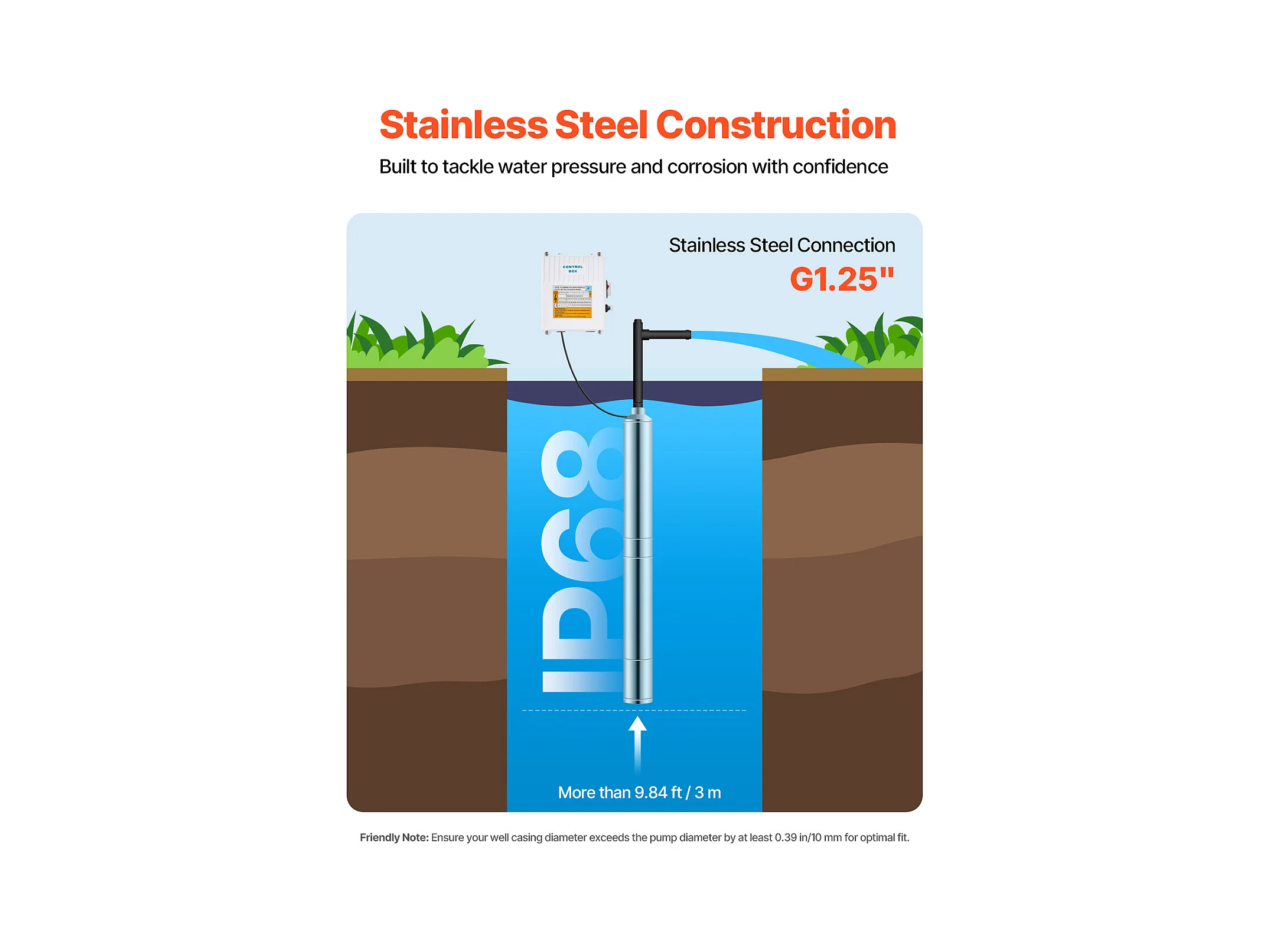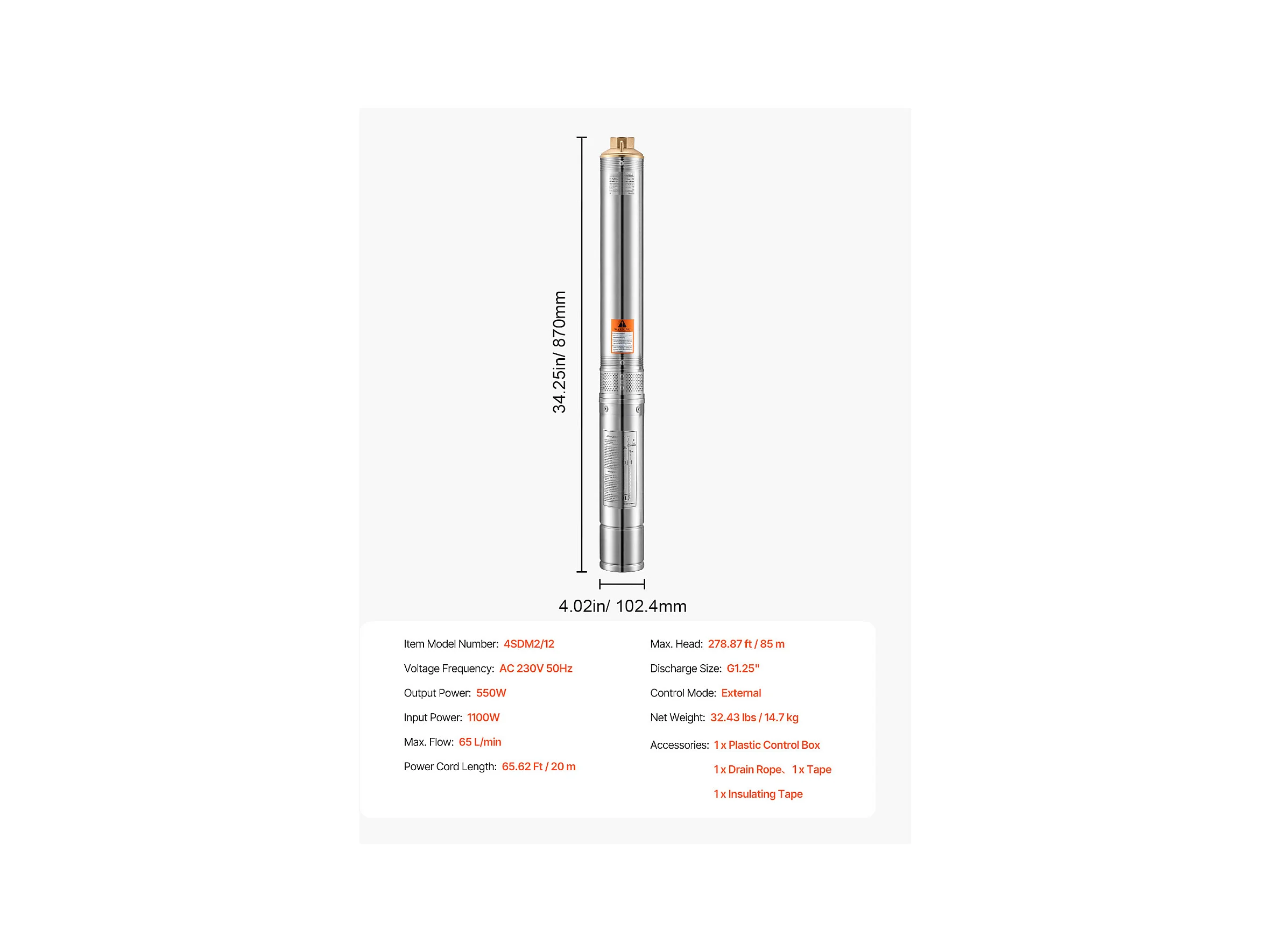 Pompe pour Puits Profonds SucceBuy, 550 W, Puissance de Sortie, 85 m, Hauteur Manométrique 65 L/min, Acier Inoxydable
