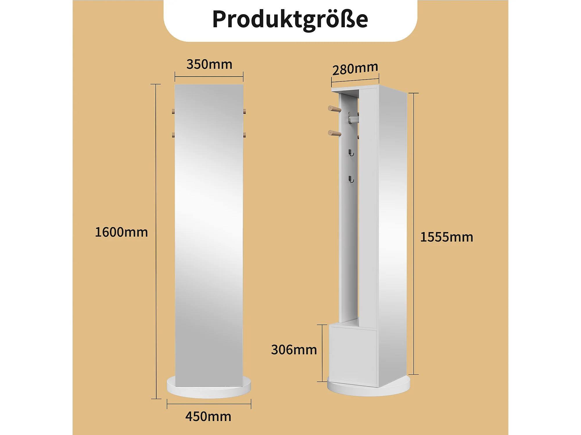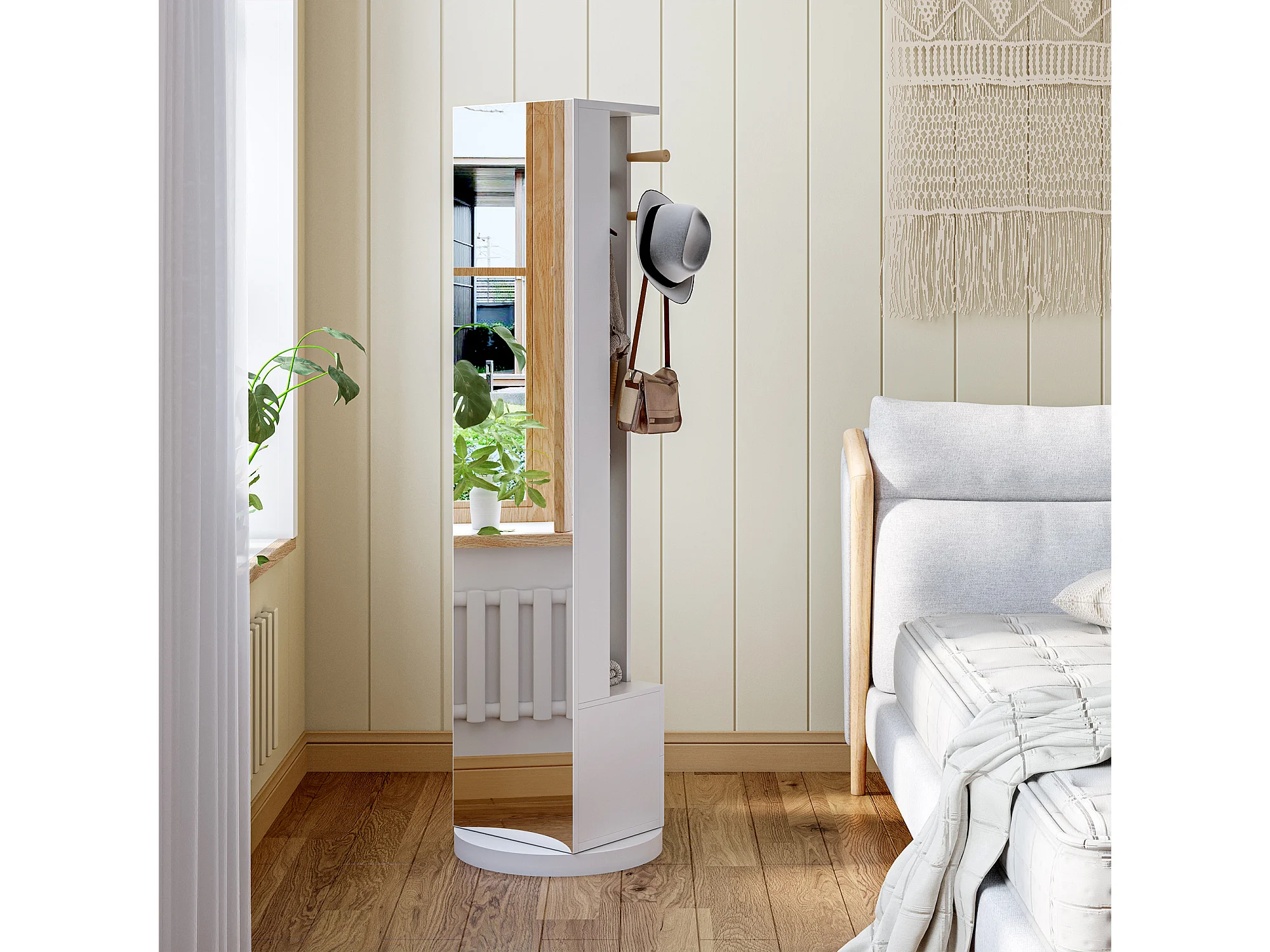 Porte-manteau autoportant en bois massif, avec tiroir de rangement, pour miroir et chapeau – Blanc
