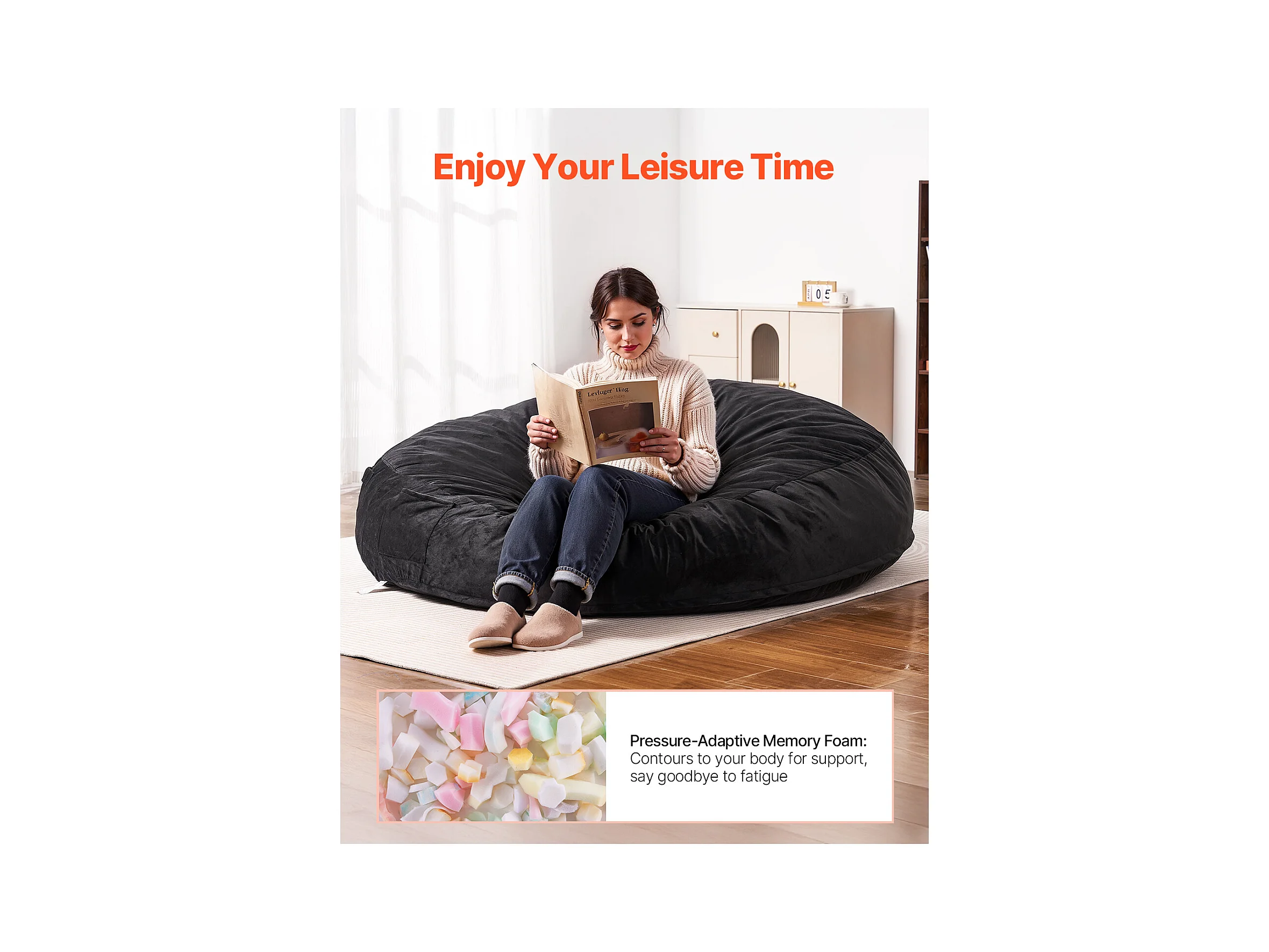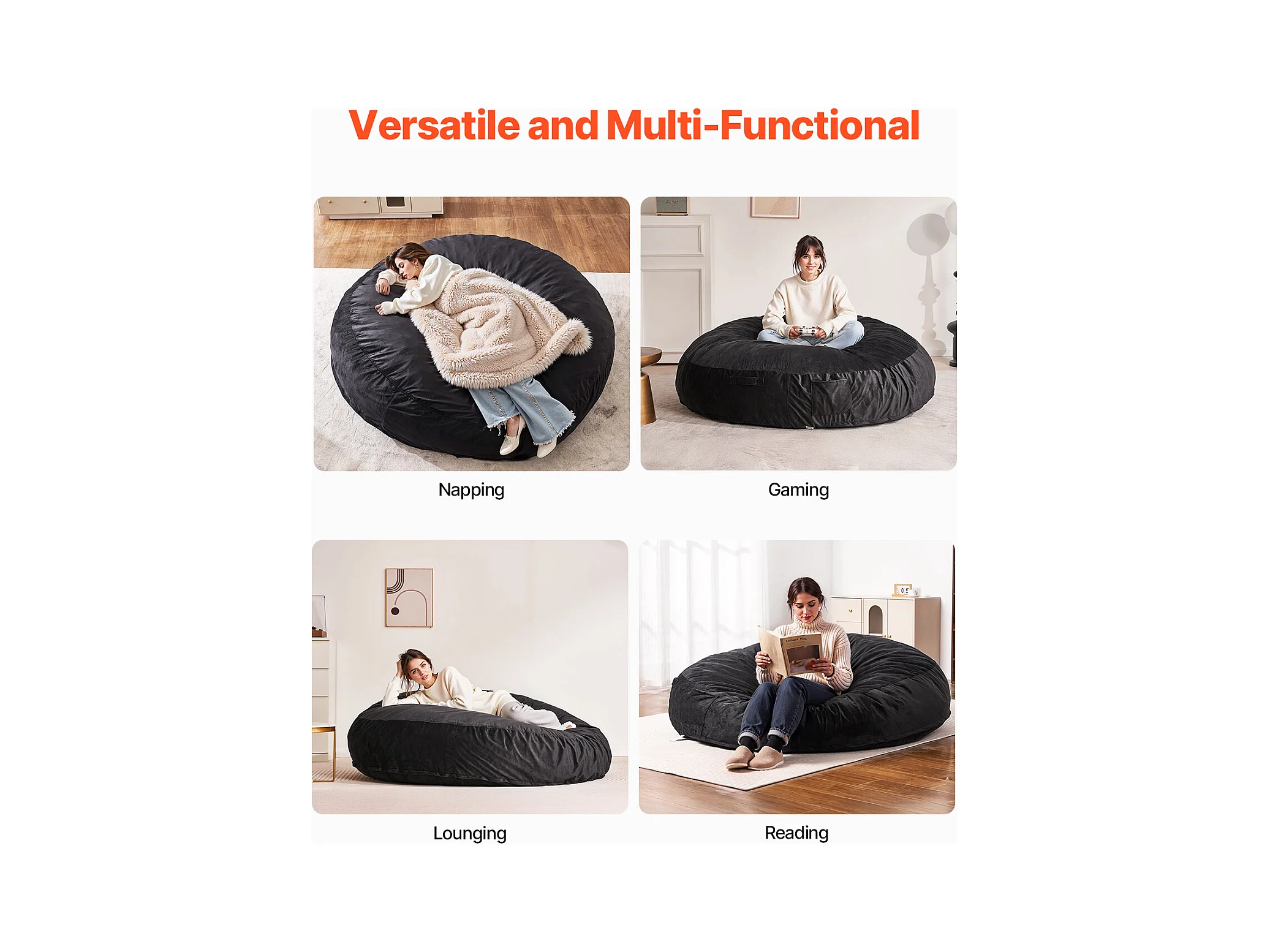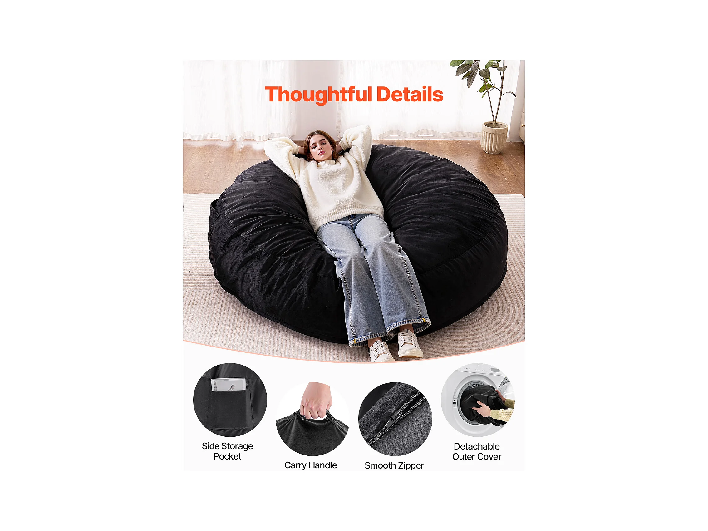 Pouf Fauteuil, SucceBuy Pouf Rond pour Adulte avec Housse Amovible et Lavable Géant Noir