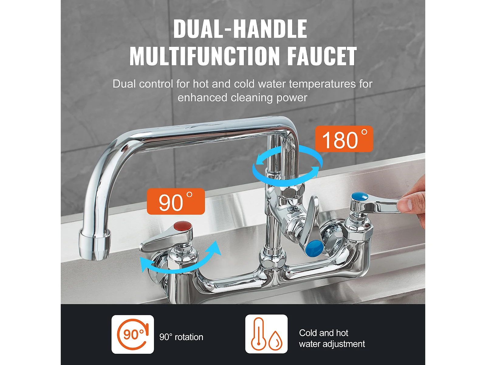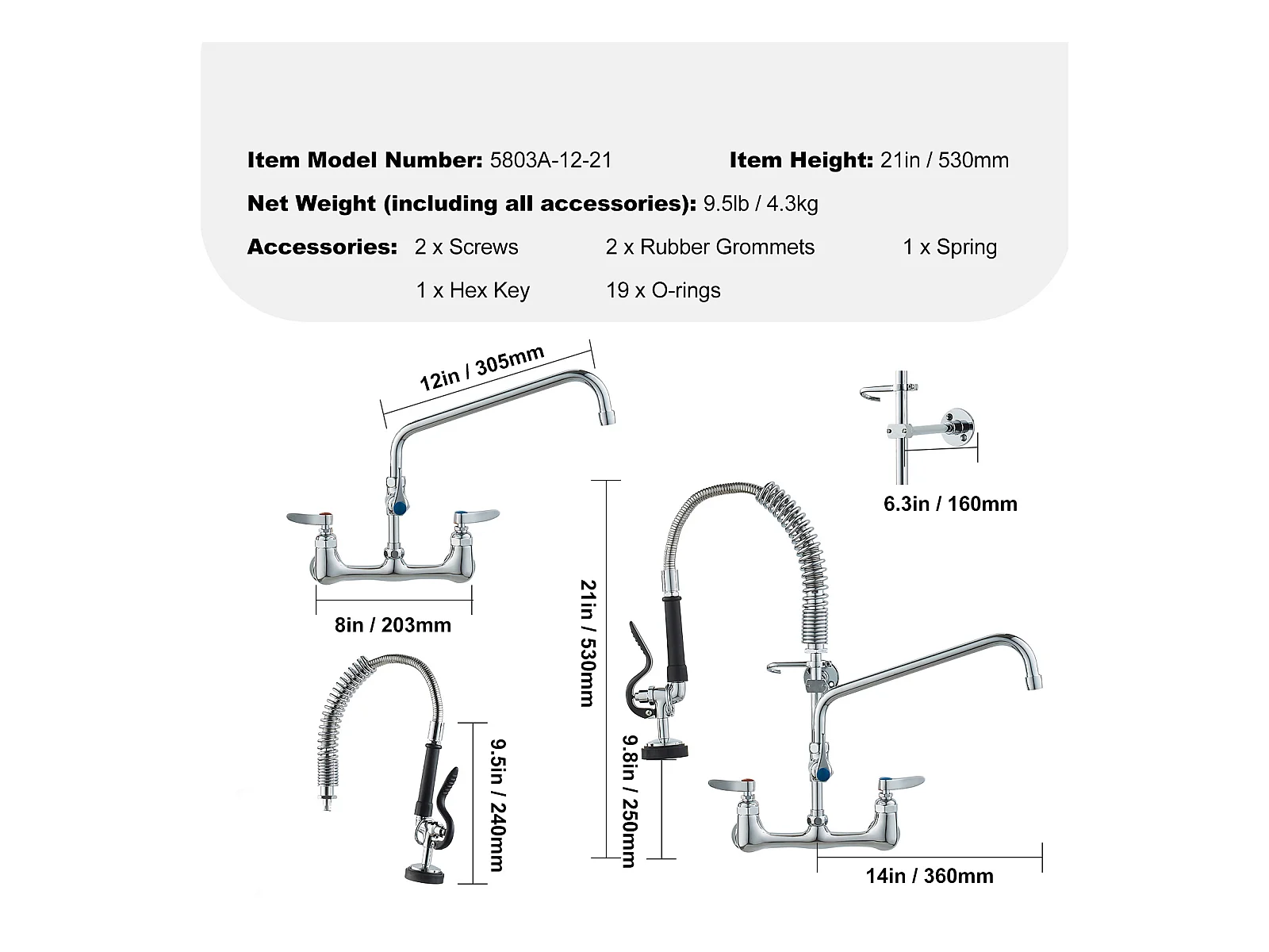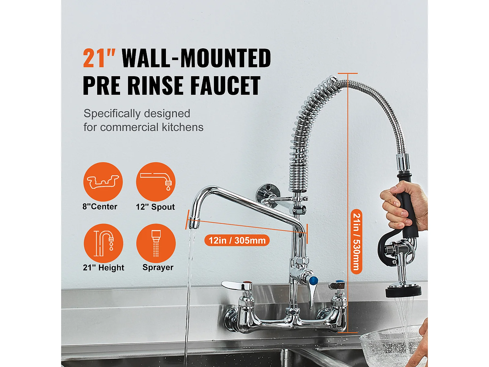 Robinet de Cuisine, SucceBuy Robinet d'Évier de Cuisine Mural Commercial - Avec Pulvérisateur de Pré-Rinçage, 53.3 cm