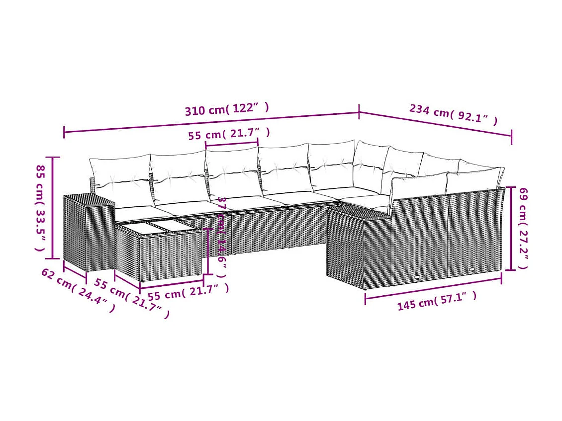 Salon de jardin 10 pcs avec coussins marron résine tressée