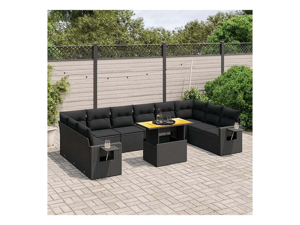 Salon de jardin 11 pcs avec coussins noir résine tressée