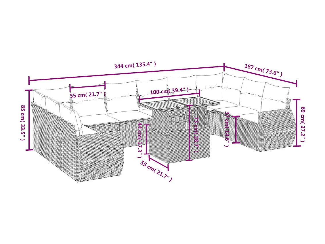 Salon de jardin 11 pcs avec coussins noir résine tressée