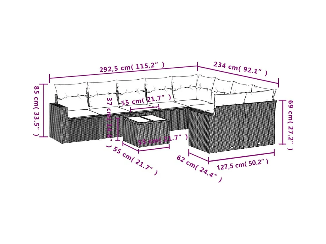 Salon de jardin 9 pcs avec coussins gris résine tressée