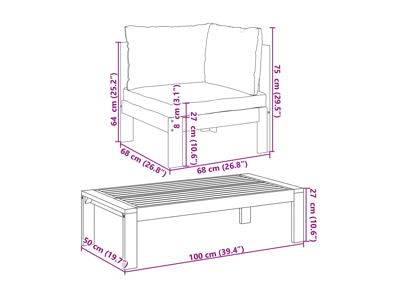 Salon de jardin avec coussins 2 pcs bois massif acacia